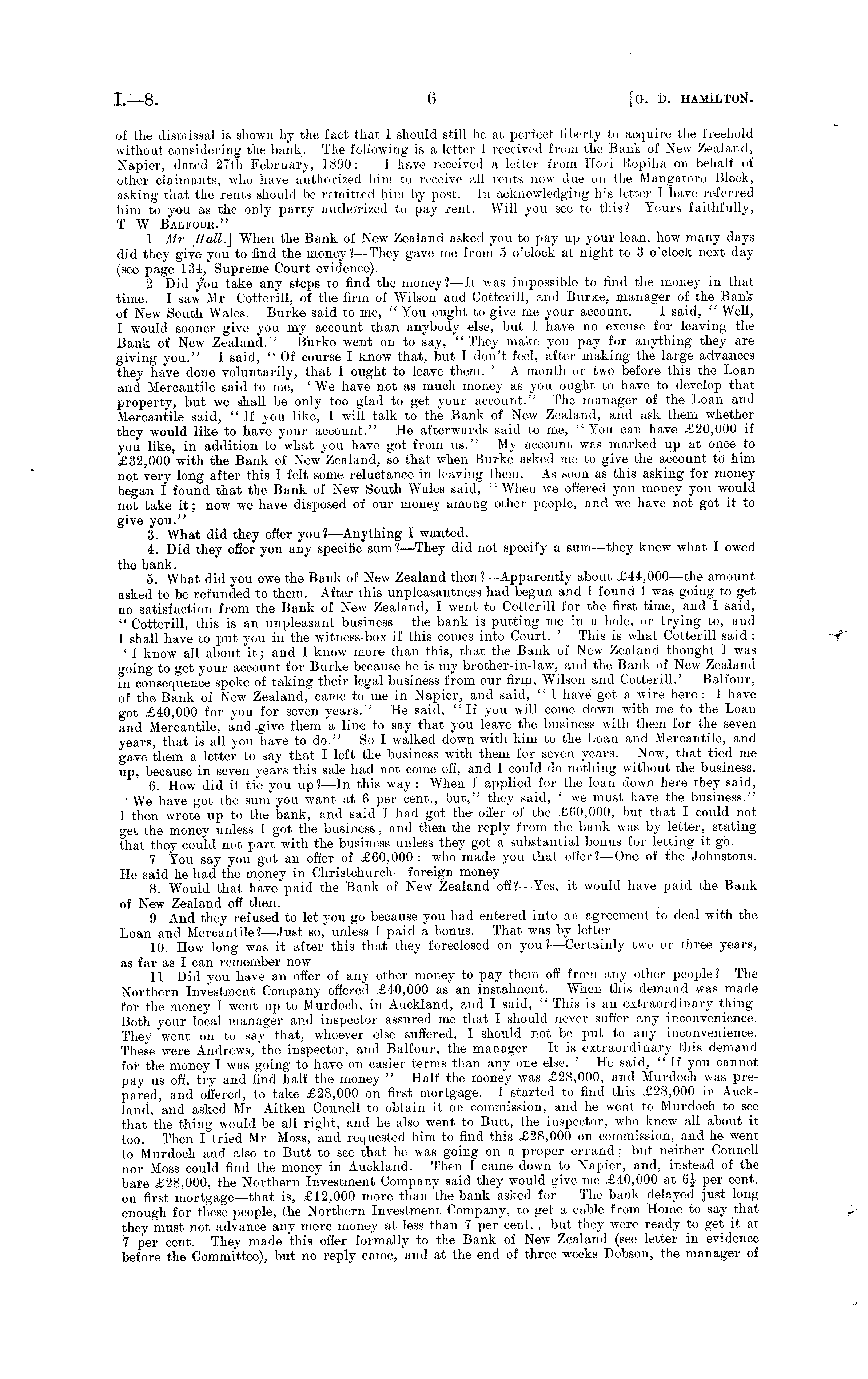 of the dismissal is shown by the fact that I should still be at perfect liberty to acquire the freehold without considering the bank. The following is a letter I received from the Bank of New Zealand, Napier, dated 27th February, 1890: I have received a letter from Hori Ropiha on behalf of other claimants, who have authorized him to receive all rents now due on the Mangatoro Block, asking that the rents should be remitted him by post. In acknowledging his letter I have referred him to you as the only party authorized to pay rent. Will you see to this? —Yours faithfully, T W Balfour." 1 Mr Hall.] When the Bank of New Zealand asked you to pay up your loan, how many days did they give you to find the money I —They gave me from 5 o'clock at night to 3 o'clock next day (see page 134, Supreme Court evidence). 2 Did you take any steps to find the money ?—lt was impossible to find the money in that time. I saw Mr Cotterill, of the firm of Wilson and Cotterill, and Burke, manager of the Bank of New South Wales. Burke said to me, " You ought to give me your account. I said, " Well, I would sooner give you my account than anybody else, but I have no excuse for leaving the Bank of New Zealand." Burke went on to say, "They make you pay for anything they are giving you," I said, "Of course I know that, but I don't feel, after making the large advances they have done voluntarily, that I ought to leave them. ' A month or two before this the Loan and Mercantile said to me, ' We have not as much money as you ought to have to develop that property, but we shall be only too glad to get your account." The manager of the Loan and Mercantile said, "If you like, I will talk to the Bank of New Zealand, and ask them whether they would like to have your account." He afterwards said to me, "You can have £20,000 if you like, in addition to what you have got from us." My account was marked up at once to £32,000 with the Bank of New Zealand, so that when Burke asked me to give the account to him not very long after this I felt some reluctance in leaving them. As soon as this asking for money began I found that the Bank of New South Wales said, " When we offered you money you would not take it; now we have disposed of our money among other people, and we have not got it to give you." 3. What did they offer you? —Anything I wanted. 4. Did they offer you any specific sum? —They did not specify a sum —they knew what I owed the bank. 5. What did you owe the Bank of New Zealand then? —Apparently about £44,000 —the amount asked to be refunded to them. After this unpleasantness had begun and I found I was going to get no satisfaction from the Bank of New Zealand, I went to Cotterill for the first time, and I said, "Cotterill, this is an unpleasant business the bank is putting me in a hole, or trying to, and I shall have to put you in the witness-box if this comes into Court. ' This is what Cotterill said : ' I know all about it; and I know more than this, that the Bank of New Zealand thought I was going to get your account for Burke because he is my brother-in-law, and the Bank of New Zealand in consequence spoke of taking their legal business from our firm, Wilson and Cotterill.' Balfour, of the Bank of New Zealand," came to me in Napier, and said, " I have got a wire here: I have got £40,000 for you for seven years." He said, "If you will come down with me to the Loan and Mercantile, and give them a line to say that you leave the business with them for the seven years, that is all you have to do." So I walked down with him to the Loan and Mercantile, and gave them a letter to say that I left the business with them for seven years. Now, that tied me up, because in seven years this sale had not come off, and I could do nothing without the business. 6. How did it tie you up?—ln this way : When I applied for the loan down here they said, 'We have got the sum" you want at 6 per cent., but," they said, ' we must have the business." I then wrote up to the bank, and said I had got the offer of the £60,000, but that I could not get the money unless I got the business, and then the reply from the bank was by letter, stating that they could not part with the business unless they got a substantial bonus for letting it go. 7 You say you got an offer of £60,000 : who made you that offer? —One of the Johnstons. He said he had the money in Christchurch —foreign money 8. Would that have paid the Bank of New Zealand off?— Yes, it would have paid the Bank of New Zealand off then. 9 And they refused to let you go because you had entered into an agreement to deal with the Loan and Mercantile? —Just so, unless I paid a bonus. That was by letter 10. How long was it after this that they foreclosed on you? —Certainly two or three years, as far as I can remember now 11 Did you have an offer of any other money to pay them off from any other people?—The Northern Investment Company offered £40,000 as an instalment. When this demand was made for the money I went up to Murdoch, in Auckland, and I said, " This is an extraordinary thing Both your local manager and inspector assured me that I should never suffer any inconvenience. They "went on to say that, whoever else suffered, I should not be put to any inconvenience. These were Andrews, the inspector, and Balfour, the manager It is extraordinary this demand for the money I was going to have on easier terms than any one else. ' He said, "If you cannot pay us off, try and find half the money " Half the money was £28,000, and Murdoch was prepared, and offered, to take £28,000 on first mortgage, I started to find this £28,000 in Auckland, and asked Mr Aitken Connell to obtain it on commission, and he went to Murdoch to see that the thing would be all right, and he also went to Butt, the inspector, who knew all about it too. Then I tried Mr Moss, and requested him to find this £28,000 on commission, and he went to Murdoch and also to Butt to see that he was going on a