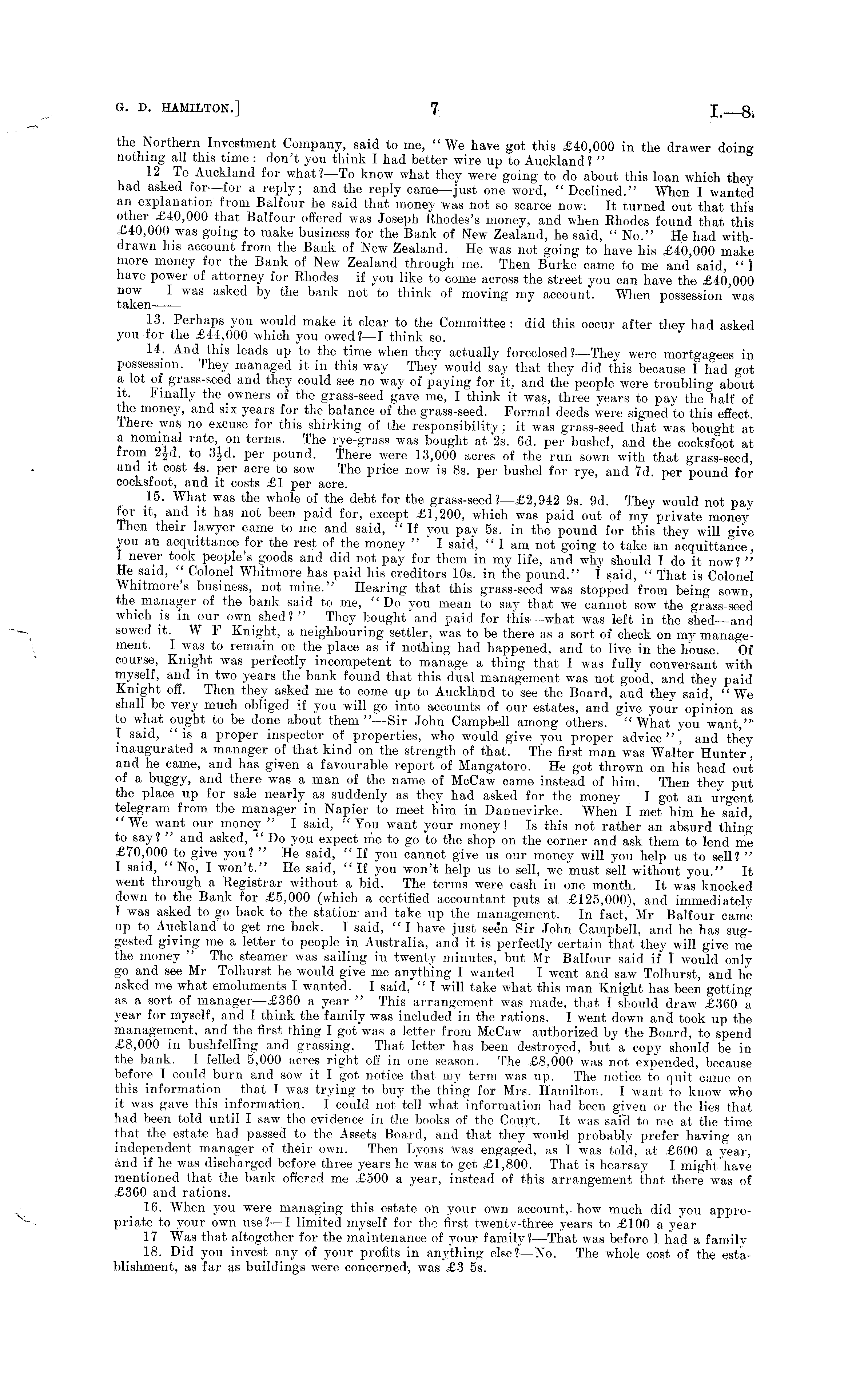 the Northern Investment Company, said to me, "We have got this £40,000 in the drawer doing nothing all this time : don't you think I had better wire up to Auckland? " 12 To Auckland for what? —To know what they were going to do about this loan which they had asked for—for a reply; and the reply came—just one word, "Declined." When I wanted an explanation from Balfour he said that money was not so scarce now. It turned out that this other £40,000 that Balfour offered was Joseph Rhodes's money, and when Rhodes found that this £40,000 was going to make business for the Bank of New Zealand, he said, " No." He had withdrawn his account from the Bank of New Zealand. He was not going to have his £40,000 make more money for the Bank of New Zealand through me. Then Burke came to me and said, "] have power of attorney for Rhodes if you like to come across the street you can have the £40,000 now I was asked by the bank not to think of moving my account. When possession was taken 13. Perhaps you would make it clear to the Committee : did this occur after they had asked you for the £44,000 which you owed? —I think so. 14. And this leads up to the time when they actually foreclosed?— They were mortgagees in possession. They managed it in this way They would say that they did this because I had got a lot of grass-seed and they could see no way of paying for it, and the people were troubling about it. Finally the owners of the grass-seed gave me, I think it was, three years to pay the half of the money, and six years for the balance of the grass-seed. Formal deeds were signed to this effect. There was no excuse for this shirking of the responsibility; it was grass-seed that was bought at a, nominal rate, on terms. The rye-grass was bought at 2s. 6d. per bushel, and the cocksfoot at from 2Jd. to 3Jd. per pound. There were 13,000 acres of the run sown with that grass-seed, and it cost 4s. per acre to sow The price now is Bs. per bushel for rye, and 7d. per pound for cocksfoot, and it costs £1 per acre. 15. What was the whole of the debt for the grass-seed?—£2,942 9s. 9d. They would not pay for it, and it has not been paid for, except £1,200, which was paid out of my private money Then their lawyer came to me and said, "If you pay ss. in the pound for this they will give you an acquittance for the rest of the money "I said, "lam not going to take an acquittance, I never took people's goods and did not pay for them in my life, and why should I do it now? " He said, " Colonel Whitmore has paid his creditors 10s. in the pound." I said, " That is Colonel Whitmore's business, not mine." Hearing that this grass-seed was stopped from being sown, the manager of the bank said to me, "Do you mean to say that we cannot sow the grass-seed which is in our own shed? " They bought and paid for this—what was left in the shed—and sowed it. W F Knight, a neighbouring settler, was to be there as a sort of check on my management. I was to remain on the place as if nothing had happened, and to live in the house. Of course, Knight was perfectly incompetent to manage a thing that I was fully conversant with myself, and in two years the bank found that this dual management was not good, and they paid Knight off. Then they asked me to come up to Auckland to see the Board, and they said, "We shall be very much obliged if you will go into accounts of our estates, and give your opinion as to what ought to be done about them "—Sir John Campbell among others. "What you want,'* I said, "is a proper inspector of properties, who would give you proper advice", and they inaugurated a manager of that kind on the strength of thatj The first man was Walter Hunter, and he came, and has given a favourable report of Mangatoro. He got thrown on his head out of a buggy, and there was a man of the name of McCaw came instead of him. Then they put the place up for sale nearly as suddenly as they had asked for the money I got an urgent telegram from the manager in Napier to meet him in Dannevirke. When I met him he said, "We want our money " I said, "You want your money! Is this not rather an absurd thing to say? " and asked, " Do you expect me to go to the shop on the corner and ask them to lend me £70 ; give you? " He said, "If you cannot give us our money will you help us to sell? " I said, " No, I won't." He said, "If you won't help us to sell, we must sell without you." It went through a Registrar without a bid. The terms were cash in one month. It was knocked down to the Bank for £5,000 (which a certified accountant puts at £125,000), and immediately I was asked to go back to the station and take up the management. In fact, Mr Balfour came up to Auckland to get me back. I said, " I have just seen Sir John Campbell, and he has suggested giving me a letter to people in Australia, and it is perfectly certain that they will give me the money " The steamer was sailing in twenty minutes, but Mr Balfour said if I would only go and see Mr Tolhurst he would give me anything I wanted I went and saw Tolhurst, and he asked me what emoluments I wanted. I said, " I will take what this man Knight has been getting as a sort of manager—£36o a year " This arrangement was made, that I should draw £360 a year for myself, and I think the family was included in the rations. I went down and took up the management, and the first thing I got was a letter from McCaw authorized by the Board, to spend £8,000 in bushfelfing and grassing. That letter has been destroyed, but a copy should be in the bank. I felled 5,000 acres right off in one season. The £8,000 was not expended, because before I could burn and sow it I got notice that my term was up. The notice to quit came on this information that I was trying to buy the thing for Mrs. Hamilton. I want to know who it was gave this information. I could not tell what information had been given or the lies that had been told until I saw the evidence in the books of the Court. It was sai<i to mo