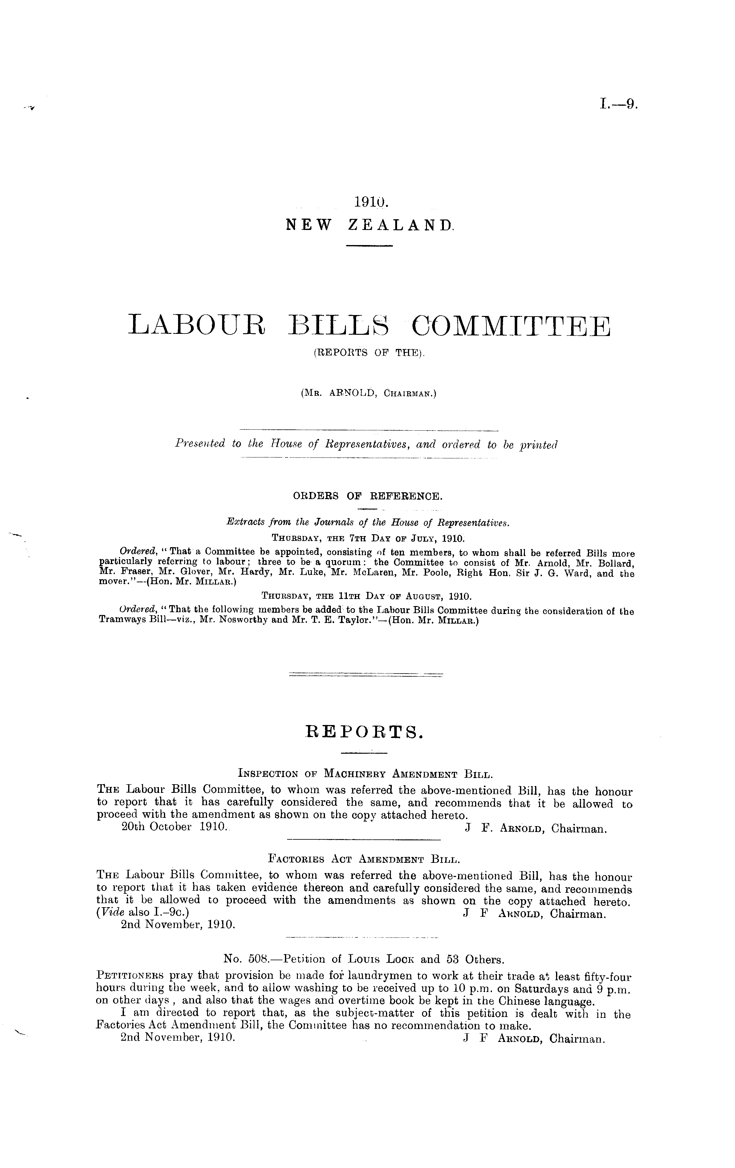 ORDERS OP REFERENCE. Extracts from the Journals of the House of Representatives. Thursday, the 7th Day of July, 1910. Ordered, " That a Committee be appointed, consisting of ten members, to whom shall be referred Bills more particularly referring to labour; three to be a quorum: the Committee to consist of Mr. Arnold, Mr. Bollard, Mr. Fraser, Mr. Glover, Mr. Hardy, Mr. Luke, Mr. McLaren, Mr. Poole, Right Hon. Sir J. G. Ward, and the mover."—(Hon. Mr. Millar.) Thursday, the 11th Day of August, 1910. Ordered, " That the following members be added to the Labour Bills Committee during the consideration of the Tramways Bill—viz., Mr. Nosworthy and Mr. T. E. Taylor."—(Hon. Mr. Millar.)