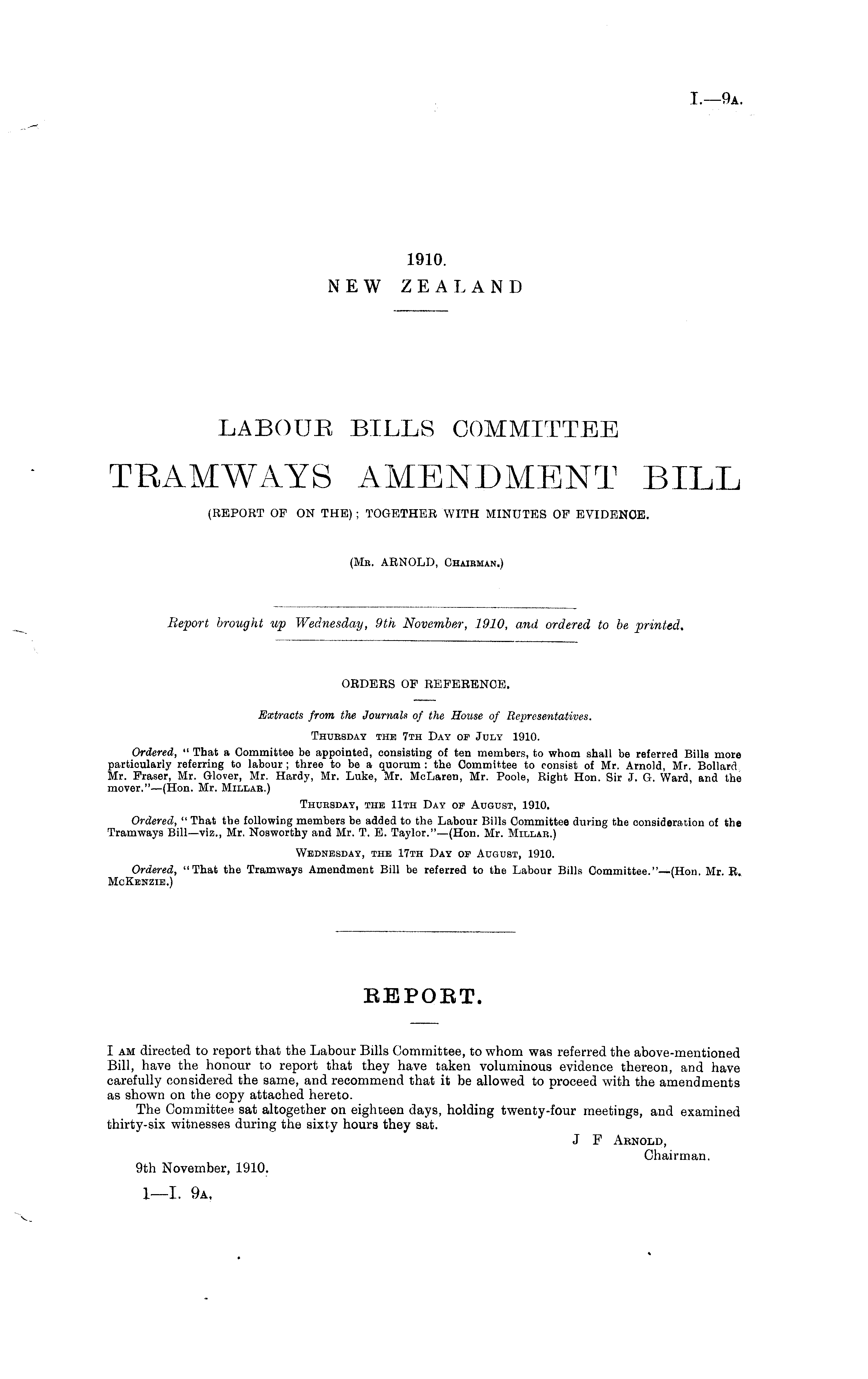 ORDERS OF REFERENCE. Extracts from the Journals of the House of Representatives. Thursday the 7th Day of July 1910. Ordered, " That a Committee be appointed, consisting of ten members, to whom shall be referred Bills more particularly referring to labour ; three to be a quorum : the Committee to consist of Mr. Arnold, Mr. Bollard Mr. Fraser, Mr. Glover, Mr. Hardy, Mr. Luke, Mr. McLaren, Mr. Poole, Right Hon. Sir J. G. Ward, and the mover."—(Hon. Mr. Millab.) Thubsday, the 11th Day of August, 1910. Ordered, " That the following members be added to the Labour Bills Committee during the consideration of the Tramways Bill—viz., Mr. Nosworthy and Mr. T. E. Taylor."—(Hon. Mr. Millar.) Wednesday, the 17th Day of August, 1910. Ordered, "That the Tramways Amendment Bill be referred to the Labour Bills Committee."—(Hon. Mr. B. McKenzie.)