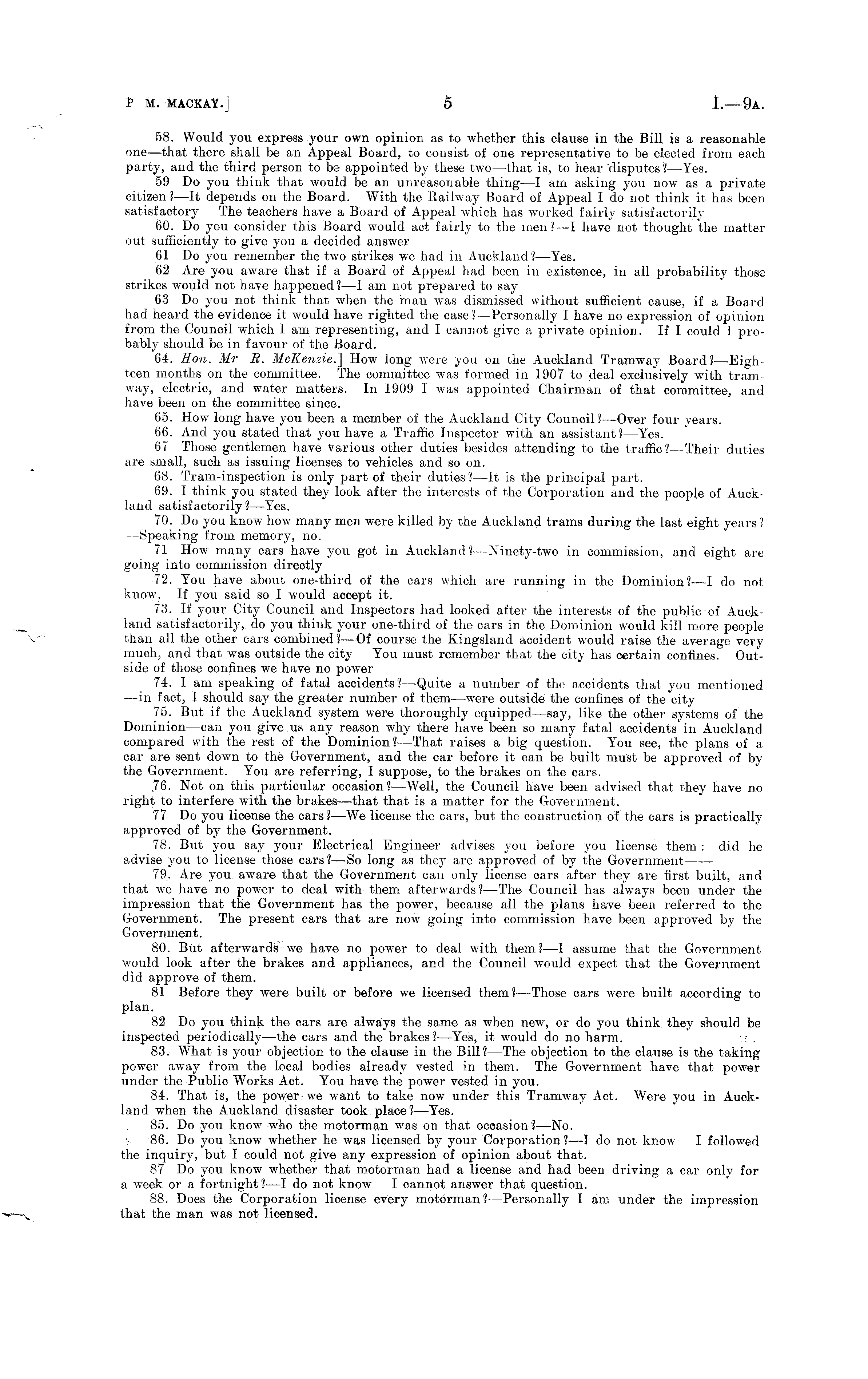 58. Would you express your own opinion as to whether this clause in the Bill is a reasonable one—that there shall be an Appeal Board, to consist of one representative to be elected from each party, and the third person to be appointed by these two —that is, to hear disputes?— Yes. 59 Do you think that would be an unreasonable thing—l am asking you now as a private citizen ?—lt depends on the Board. With the Railway Board of Appeal Ido not think it has been satisfactory The teachers have a Board of Appeal which has worked fairly satisfactorily 60. Do you consider this Board would act fairly to the men? —I have not thought the matter out sufficiently to give you a decided answer 61 Do you remember the two strikes we had in Auckland ?—Yes. 62 Are you aware that if a Board of Appeal had been in existence, in all probability those strikes would not have happened 'I —l am not prepared to say 63 Do you not think that when the man was dismissed without sufficient cause, if a Board had heard the evidence it would have righted the case ?—Personally I have no expression of opinion from the Council which lam representing, and I cannot give a private opinion. If I could I probably should be in favour of the Board. 64. Hon. Mr B. McKenzie.] How long were you on the Auckland Tramway Board?— Eighteen months on the committee. The committee was formed in 1907 to deal exclusively with tramway, electric, and water matters. In 1909 1 was appointed Chairman of that committee, and have been on the committee since. 65. How long have you been a member of the Auckland City Council?— Over four years. 66. And you stated that you have a Traffic Inspector with an assistant?— Yes. 67 Those gentlemen have Various other duties besides attending to the traffic? —Their duties are small, such as issuing licenses to vehicles and so on. 68. Train-inspection is only part of their duties?—lt is the principal part. 69. I think you stated they look after the interests of the Corporation and the people of Auckland satisfactorily? —Yes. 70. Do you know how many men were killed by the Auckland trams during the last eight years ? —Speaking from memory, no. 71 How many cars have you got in Auckland?— Ninety-two in commission, and eight are going into commission directly ■72. You have about one-third of the cars which are running in the Dominion? —I do not know. If you said so I would accept it. 73. If your City Council and Inspectors had looked after the interests of the public of Auckland satisfactorily, do you think your one-third of the cars in the Dominion would kill more people than all the other cars combined ?—Of course the Kingsland accident would raise the average very much, and that was outside the city You must remember that the city has certain confines. Outside of those confines we have no power 74. I am speaking of fatal accidents? —Quite a number of the accidents that you mentioned —in fact, I should say the greater number of them —were outside the confines of the city 75. But if the Auckland system were thoroughly equipped—say, like the other systems of the Dominion —can you give us any reason why there have been so many fatal accidents in Auckland compared with the rest of the Dominion? —That raises a big question. You see, the plans of a car are sent down to the Government, and the car before it can be built must be approved of by the Government. You are referring, I suppose, to the brakes on the cars. 76. Not on this particular occasion?— Well, the Council have been advised that they have no right to interfere with the brakes—that that is a matter for the Government. 77 Do you license the cars?—We license the cars, but the construction of the cars is practically approved of by the Government. 78. But you say your Electrical Engineer advises you before you license them : did he advise you to license those cars?—So long as they are approved of by the Government 79. Are you, aware that the Government can only license cars after they are first built, and that we have no power to deal with them afterwards?—The Council has always been under the impression that the Government has the power, because all the plans have been referred to the Government. The present cars that are now going into commission have been approved by the Government. 80. But afterwards we have no power to deal with them ?—I assume that the Government would look after the brakes and appliances, and the Council would expect that the Government did approve of them. 81 Before they were built or before we licensed them? —Those cars were built according to plan. 82 Do you think the cars are always the same as when new, or do you think, they should be inspected periodically—the cars and the brakes?— Yes, it would do no harm. -.; . 83. What is your objection to the clause in the Bill? —The objection to the clause is the taking power away from the local bodies already vested in them. The Government have that power under the Public Works Act. You have the power vested in you. 84. That is, the power we want to take now under this Tramway Act. Were you in Auckland when the Auckland disaster took-place? —Yes. 85. Do you know who the motorman was on that occasion? —-No. •-■ 86. Do you know whether he was licensed by your Corporation?—l do not know I followed the inquiry, but I could not give any expression of opinion about that. 87 Do you know whether that motorman had a license and had been driving a car only for a week or a fortnight?—l do not know I cannot answer that question. 88. Does the Corporation license every motorman? —Personally I am under the impression that the man was not licensed.