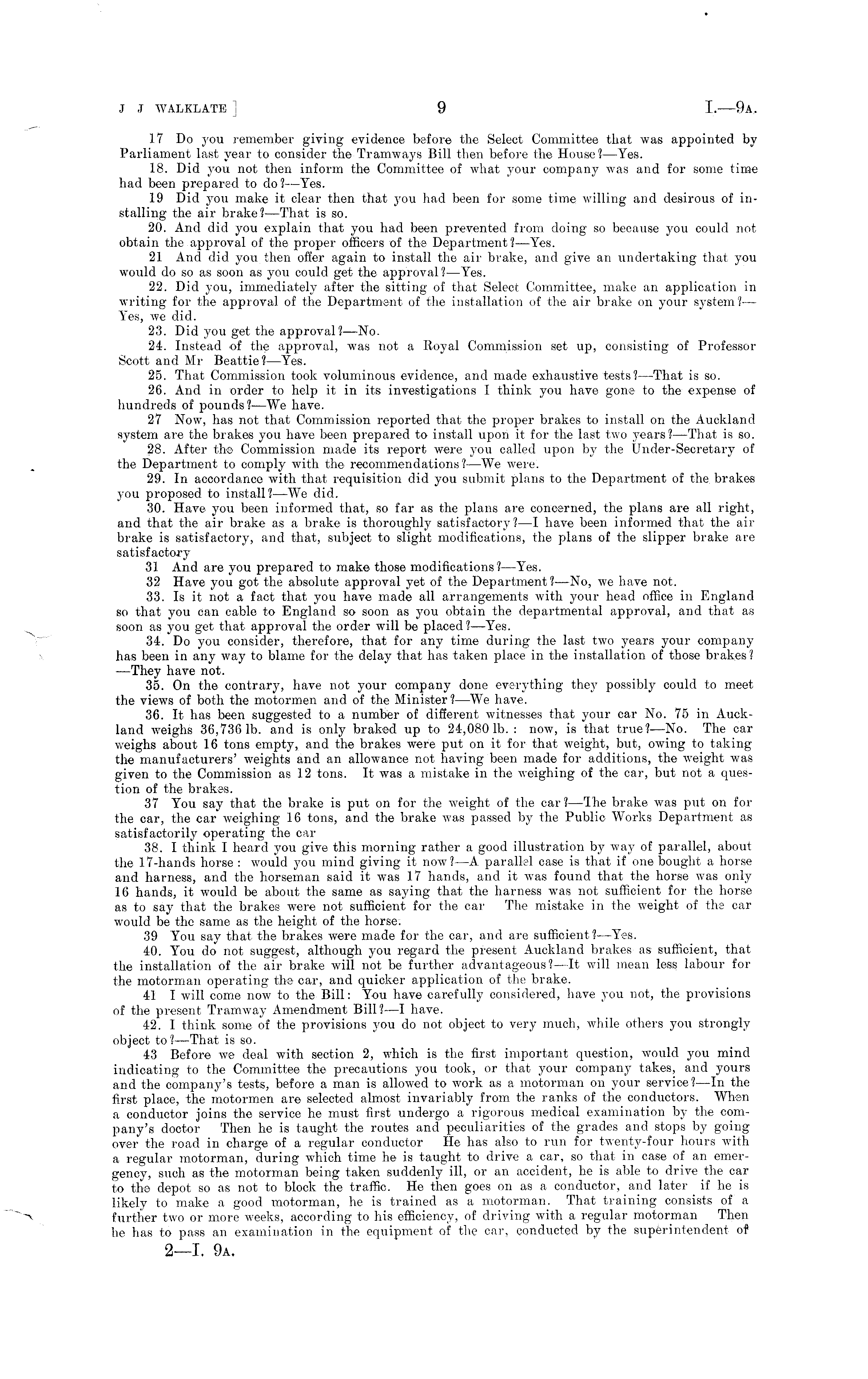17 Do you remember giving evidence before the Select Committee that was appointed by Parliament last year to consider the Tramways Bill then before the House?— Yes. 18. Did you not then inform the Committee of what your company was and for some time had been prepared to do?— Yes. 19 Did you make it clear then that you had been for some time willing and desirous of installing the air brake? —That is so. 20. And did you explain that you had been prevented from doing so because you could not obtain the approval of the proper officers of the Department ?—Yes. 21 And did you then offer again to install the air brake, and give an undertaking that you would do so as soon as you could get the approval?— Yes. 22. Did you, immediately after the sitting of that Select Committee, make an application in writing for the approval of the Department of the installation of the air brake on your system?— Yes, we did. 23. Did you get the approval?— No. 24. Instead of the approval, was not a Royal Commission set up, consisting of Professor Scott and Mr Beattie? —Yes. 25. That Commission took voluminous evidence, and made exhaustive tests?— That is so. 26. And in order to help it in its investigations I think you have gone to the expense of hundreds of pounds? —We have. 27 Now, has not that Commission reported that the proper brakes to install on the Auckland system are the brakes you have been prepared to install upon it for the last two years?— That is so. 28. After the Commission made its report were you called upon by the Under-Secretary of the Department to comply with the recommendations? —We were. 29. In accordance with that requisition did you submit plans to the Department of the brakevS you proposed to install? —We did. 30. Have you been informed that, so far as the plans are concerned, the plans are all right, and that the air brake as a brake is thoroughly satisfactory?—l have been informed that the air brake is satisfactory, and that, subject to slight modifications, the plans of the slipper brake are satisfactory 31 And are you prepared to make those modifications? —Yes. 32 Have you got the absolute approval yet of the Department?—No, we have not. 33. Is it not a fact that you have made all arrangements with your head office in England so that you can cable to England so soon as you obtain the departmental approval, and that as soon as you get that approval the order will be placed? —Yes. 34. Do you consider, therefore, that for any time during the last two years your companyhas been in any way to blame for the delay that has taken place in the installation of those brakes ? —They have not. 35. On the contrary, have not your company done everything they possibly could to meet the views of both the motormen and of the Minister? —We have. 36. It has been suggested to a number of different witnesses that your car No. 75 in Auckland weighs 36,736 Ib. and is only braked up to 24,0801b. : now, is that true?— No. The car weighs about 16 tons empty, and the brakes were put on it for that weight, but, owing to taking the manufacturers' weights and an allowance not having been made for additions, the weight was given to the Commission as 12 tons. It was a mistake in the weighing of the car, but not a question of the brakes. 37 You say that the brake is put on for the weight of the car?—The brake was put on for the car, the car weighing 16 tons, and the brake was passed by the Public Works Department as satisfactorily operating the car 38. I think I heard you give this morning rather a good illustration by way of parallel, about the 17-hands horse : would you mind giving it now?—A parallel case is that if one bought a horse and harness, and the horseman said it was 17 hands, and it was found that the horse was only 16 hands, it would be about the same as saying that the harness was not sufficient for the horse as to say that the brakes were not sufficient for the car The mistake in the weight of the car would be the same as the height of the horse. 39 You say that the brakes were made for the car, and are sufficient? —Yes. 40. You do not suggest, although you regard the present Auckland brakes as sufficient, that the installation of the air brake will not be further advantageous?—lt will mean less labour for the motorman operating the car, and quicker application of the brake. 41 I will come now to the Bill: You have carefully considered, have you not, the provisions of the present Tramway Amendment Bill?—I have. 42. I think some of the provisions you do not object to very much, while others you strongly object to? —That is so. 43 Before we deal with section 2, which is the first important question, would you mind indicating to the Committee the precautions you took, or that your company takes, and yours and the company's tests, before a man is allowed to work as a motorman on your service? —In the first place, the motormen are selected almost invariably from the ranks of the conductors. When a conductor joins the service he must first undergo a rigorous medical examination by the company's doctor Then he is taught the routes and peculiarities of the grades and stops by goingover the road in charge of a regular conductor He has also to run for twenty-four hours with a regular motorman, during which time he is taught to drive a car, so that in case of an emergency, such as the motorman being taken suddenly ill, or an accident, he is able to drive the car to the depot so as not to block the traffic. He then goes on as a conductor, and later if he is likely to make a good motorman, lie is trained as a motorman. That training consists of a further two or more weeks, according to his efficiency, of driving with a regular motorman Then he has to pass an examination in the equipment of the car, conducted by the superintendent of