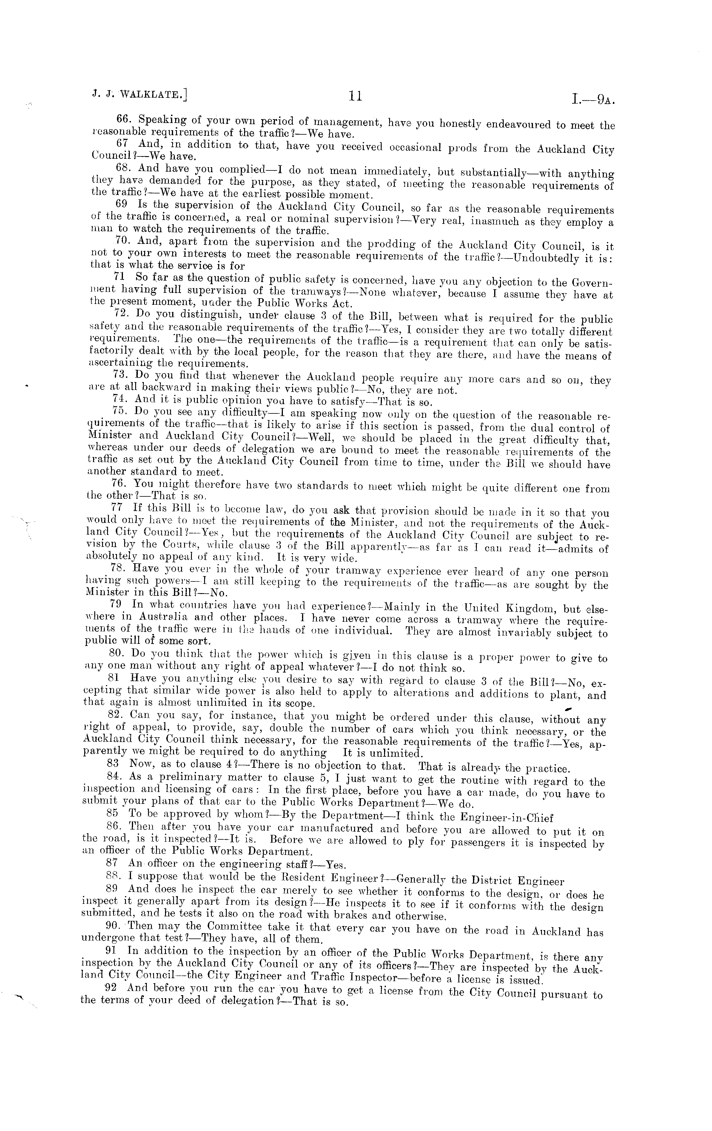 66 Speaking of your own period of management, have you honestly endeavoured to meet the reasonable requirements of the traffic I—We1 —We have. n 67 io , in addition to that > hav e you received occasional prods from the Auckland City Council?—We have. J 68. And have you complied—l do not mean immediately, but substantially—with anything they have demanded for the purpose, as they stated, of meeting the reasonable requirements of tlie trattic ! —We have at the earliest possible moment. , ~6 9 Ij L the su P ervislo « of the Auckland City Council, so far as the reasonable requirements ot the traffic is concerned, a real or nominal supervision ?— Very real, inasmuch as they employ a man to watch the requirements of the traffic. 70. And, apart from the supervision and the prodding of the Auckland City Council is it not to your own interests to meet the reasonable requirements of the traffic?—Undoubtedly'it is: that is what the service is for 71 So far as the question of public safety is concerned, have you any objection to the Government having full supervision of the tramways?— None whatever, because I assume they have at the present moment, under the Public Works Act. <2. Do you distinguish, under clause 3 of the Bill, between what is required for the public safety and the reasonable requirements of the traffic?— Yes, I consider they are two totally different requirements. Hie one—the requirements of the traffic—is a requirement that can only be satisfactorily dealt with by the local people, for the reason that they are there, and have the means of ascertaining the requirements. 73 Do you find that whenever the Auckland people require any more cars and so on they are at all backward in making their views public?—No, they are not. 74. And it is public opinion yoa have to satisfy—That is so. _ 75. Do you see any difficulty—l am speaking "now only on the question of the reasonable requirements of the traffic—that is likely to arise if this section is passed, from the dual control of Minister and Auckland City Council?— Well, we should be placed in the great difficulty that whereas under our deeds of delegation we are bound to meet the reasonable requirements of the traffic as set out by the Auckland City Council from time to time, under the Bill we should have another standard to meet. 76. You might therefore have two standards to meet which might be quite different one from the other?— That is so. 77 If this Bill is to become law, do you ask that provision should be made in it so that you would only have to meet the requirements of the Minister, and not the requirements of the Aiickland City Council?— Yes, but the requirements of the Auckland City Council are subject to revision by the Courts, while clause 3of the Bill apparently—as far as I can read it—admits of absolutely no appeal of any kind. It is very wide. _ 78. Have you ever In the whole of your tramway experience ever heard of any one person having such powers—l am still keeping to the requirements of the traffic—as are sought by the Minister in this Bill?— No. 79 In what countries have you had experience?— Mainly in the United Kingdom, but elsewhere in Australia and other places. I have never come across a tramway where the requirements of the_ traffic were in the hands of one individual. They are almost 'invariably subiect to public will of some sort. " 80. Do you think that the power which is given in this clause is a proper power to o-ive to any one man without any right of appeal whatever?—l do not think so. 81 Have you anything else you desire to say with regard to clause 3 of the Bill? No excepting that similar wide power is also held to apply to alterations and additions to plant 'and that again is almost unlimited in its scope. 82. Can you say, for instance, that you might be ordered under this clause, without any right of appeal, to provide, say, double the number of cars which you think necessary, or the Auckland City Council think necessary, for the reasonable requirements of the traffic ?—Yes apparently we might be required to do anything It is unlimited. ' 83 Now, as to clause 4?— There is no objection to that. That is already the practice. 84. As a preliminary matter to clause 5, I just want to get the routine with regard to the inspection and licensing of cars : In the first place, before you have a car made, do you have to submit your plans of that car to the Public Works Department? We do. 85 To be approved by whom?—By the Department—l think the Engineer-in-Chief 86. Then after you have your car manufactured and before you are allowed to put it on the road, is it inspected ?—lt Before we are allowed to ply for' passengers it is inspected by an officer ot the Public Works Department. 87 An officer on the engineering staff?— Yes. 88. I suppose that would be the Resident Engineer ?—Generally the District Engineer 89 And does he inspect the car merely to see whether it conforms to the design or does he inspect it generally apart from its design?—He inspects it to see if it conforms with the desio-n submitted, and he tests it also on the road with brakes and otherwise " 90. Then may the Committee take it that every car you have on the road in Auckland has undergone that test?— They have, all of them. 91 In addition to the inspection by an. officer of the Public Works Department is there any mspection by the Auckland City Council or any of its officers ?-They are inspected'by the Auckland City Council—the City Engineer and Traffic Inspector—before a license is issued' 92 And before you run the car you have to get a license from the City Council pursuant to the terms of your deed of delegation?— That is so. * - uanv w