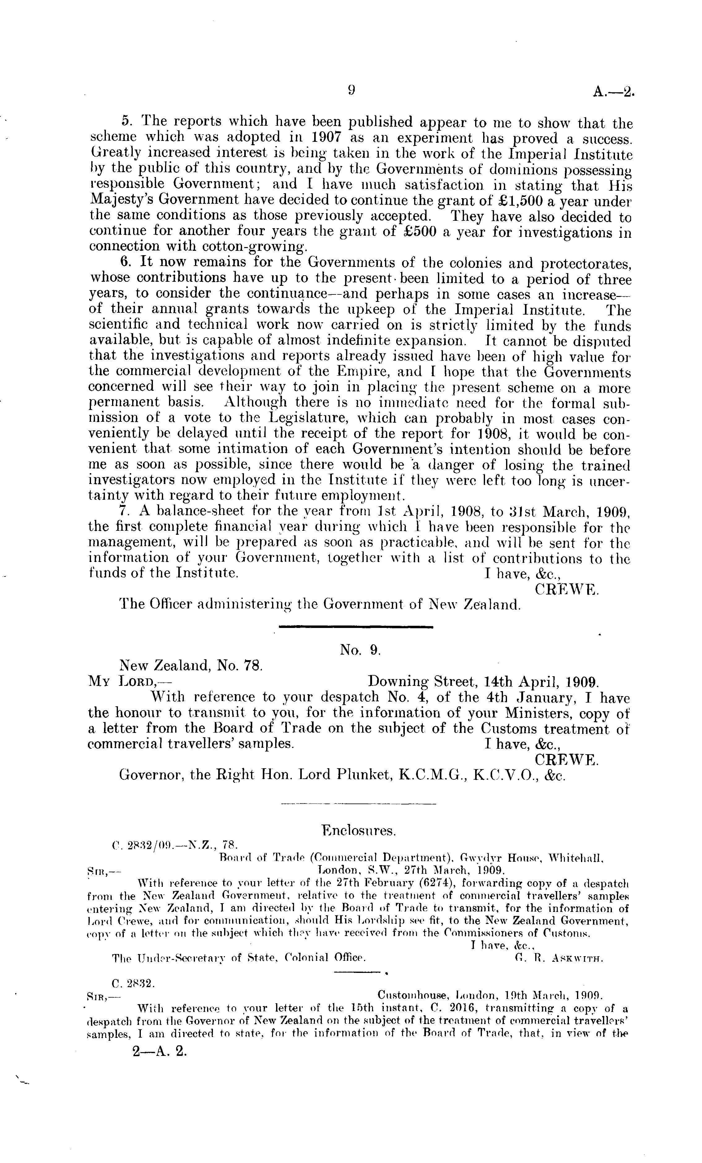 5. The reports which have been published appear to me to show that the scheme which was adopted in 1907 as an experiment has proved a success. Greatly increased interest is being taken in the work of the Imperial Institute by the public of this country, and by the Governments of dominions possessing responsible Government; and I have much satisfaction in stating that His Majesty's Government have decided to continue the grant of £1,500 a year under the same conditions as those previously accepted. They have also decided to continue for another four years the grant of £500 a year for investigations in connection with cotton-growing. 6. It now remains for the Governments of the colonies and protectorates, whose contributions have up to the present-been limited to a period of three years, to consider the continuance—and perhaps in some cases an increase— of their annual grants towards the upkeep of the Imperial Institute. The scientific and technical work now carried on is strictly limited by the funds available, but is capable of almost indefinite expansion. It cannot be disputed that the investigations and reports already issued have been of high value for the commercial development of the Empire, and I hope that the Governments concerned will see then way to join in placing the present scheme on a more permanent basis. Although there is no immediate need for the formal submission of a vote to the Legislature, which can probably in most cases conveniently be delayed until the receipt of the report for 1908, it would be convenient that some intimation of each Government's intention should be before me as soon as possible, since there would be a danger of losing the trained investigators now employed in the Institute if they were left too long is uncertainty with regard to their future employment. 7. A balance-sheet for the year from Ist April, 1908, to 31st March, 1909, the first complete financial year dining which I have been responsible for the management, will be prepared as soon as practicable, and will ho sent for the information of your Government, together with a list of contributions to the funds of the Institute. I have, &c CREWE. The Officer administering the Government of New Zealand.