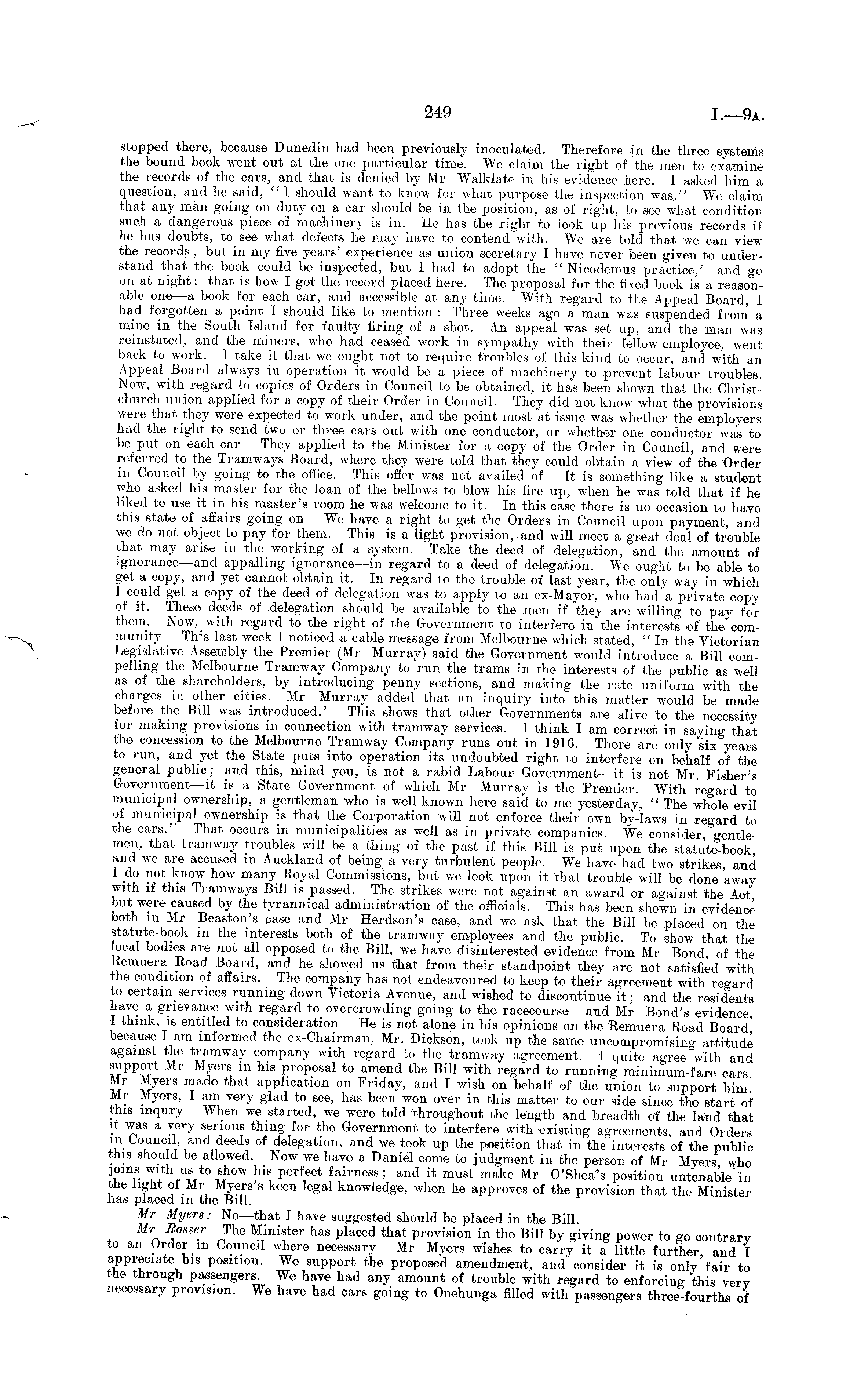 stopped there, because Dunedin had been previously inoculated. Therefore in the three systems the bound book went out at the one particular time. We claim the right of the men to examine the records of the cars, and that is denied by Mr Walklate in his evidence here. I asked him a question, and he said, " I should want to know for what purpose the inspection was." We claim that any man going on duty on a car should be in the position, as of right, to see what condition such a dangerous piece of machinery is in. He has the right to look up his previous records if he has doubts, to see what defects he may have to contend with. We are told that we can view the records, but in my five years' experience as union secretary I have never been given to understand that the book could be inspected, but I had to adopt the " Nioodemus practice,' and go on at night: that is how I got the record placed here. The proposal for the fixed book is a reasonable one—a book for each car, and accessible at any time. With regard to the Appeal Board, I had forgotten a point I should like to mention : Three weeks ago a man was suspended from a mine in the South Island for faulty firing of a shot. An appeal was set up, and the man was reinstated, and the miners, who had ceased work in sympathy with their fellow-employee, went back to work. I take it that we ought not to require troubles of this kind to occur, and with an Appeal Board always in operation it would be a piece of machinery to prevent labour troubles. Now, with regard to copies of Orders in Council to be obtained, it has been shown that the Christchurch union applied for a copy of their Order in Council. They did not know what the provisions were that they were expected to work under, and the point most at issue was whether the employers had the right to send two or three cars out with one conductor, or whether one conductor was to be put on each car They applied to the Minister for a copy of the Order in Council, and were referred to the Tramways Board, where they were told that they could obtain a view of the Order in Council by going to the office. This offer was not availed of It is something like a student who asked his master for the loan of the bellows to blow his fire up, when he was told that if he liked to use it in his master's room he was welcome to it. In this case there is no occasion to have this state of affairs going on We have a right to get the Orders in Council upon payment, and we do not object to pay for them. This is a light provision, and will meet a great deal of trouble that may arise in the working of a system. Take the deed of delegation, and the amount of ignorance—and appalling ignorance—in regard to a deed of delegation. We ought to be able to get a copy, and yet cannot obtain it. In regard to the trouble of last year, the only way in which I could get a copy of the deed of delegation was to apply to an ex-Mayor, who had a private copy of it. These deeds of delegation should be available to the men if they are willing to pay for them. Now, with regard to the right of the Government to interfere in the interests of the community This last week I noticed -a cable message from Melbourne which stated, "In the Victorian Legislative Assembly the Premier (Mr Murray) said the Government would introduce a Bill compelling the Melbourne Tramway Company to run the trams in the interests of the public as well as of the shareholders, by introducing penny sections, and making the rate uniform with the charges in other cities. Mr Murray added that an inquiry into this matter would be made before the Bill was introduced.' This shows that other Governments are alive to the necessity for making provisions in connection with tramway services. I think lam correct in saying that the concession to the Melbourne Tramway Company runs out in 1916. There are only six years to run, and yet the State puts into operation its undoubted right to interfere on behalf of the general public; and this, mind you, is not a rabid Labour Government—it is not Mr. Fisher's Government—it is a State Government of which Mr Murray is the Premier. With regard to municipal ownership, a gentleman who is well known here said to me yesterday, " The whole evil of municipal ownership is that the Corporation will not enforce their own by-laws in regard to the cars." That occurs in municipalities as well as in private companies. We consider gentlemen, that tramway troubles will be a thing of the past if this Bill is put upon the statute-book and we are accused in Auckland of being a very turbulent people. We have had two strikes, and 1 do not know how many Royal Commissions, but we look upon it that trouble will be done away with if this Tramways Bill is passed. The strikes were not against an award or against the Act but were caused by the tyrannical administration of the officials. This has been shown in evidence both in Mr Beaston's case and Mr Herdson's case, and we ask that the Bill be placed on the statute-book in the interests both of the tramway employees and the public. To show that the local bodies are not all opposed to the Bill, we have disinterested evidence from Mr Bond of the Remuera Road_ Board, and he showed us that from their standpoint they are not satisfied with the condition of affairs. The company has not endeavoured to keep to their agreement with regard to services running down Victoria Avenue, and wished to discontinue it; and the residents have a grievance with regard to overcrowding going to the racecourse and Mr Bond's evidence I thmk, is entitled to consideration He is not alone in his opinions on the Remuera Road Board' because I am informed the ex-Chairman, Mr. Dickson, took up the same uncompromising attitude against the tramway company with regard to the tramway agreement. I quite agree with and support Mr Myers in his proposal to amend the Bill with regard to running minimum-fare cars Mr Myers made that application on Friday, and I wi
