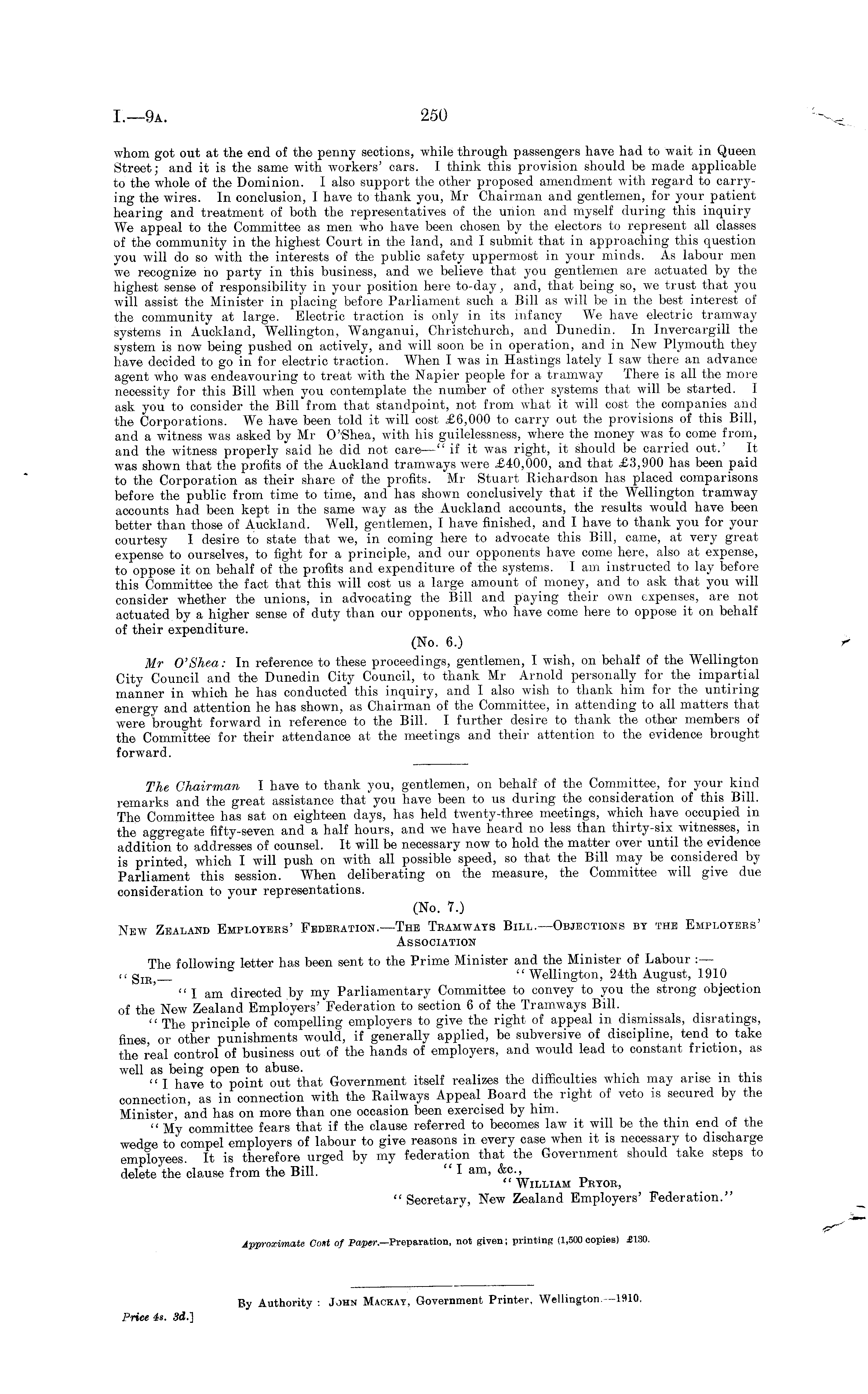 whom got out at the end of the penny sections, while through passengers have had to wait in Queen Street; and it is the same with workers' oars. I think this provision should be made applicable to the whole of the Dominion. I also support the other proposed amendment with regard to carrying the wires. In conclusion, I have to thank you, Mr Chairman and gentlemen, for your patient hearing and treatment of both the representatives of the union and myself during this inquiry We appeal to the Committee as men who have been chosen by the electors to represent all classes of the community in the highest Court in the land, and I submit that in approaching this question you will do so with the interests of the public safety uppermost in your minds. As labour men we recognize no party in this business, and we believe that you gentlemen are actuated by the highest sense of responsibility in your position here to-day , and, that being so, we trust that you will assist the Minister in placing before Parliament such a Bill as will be in the best interest of the community at large. Electric traction is only in its infancy We have electric tramway systems in Auckland, Wellington, Wanganui, Christchurch, and Dunedin. In Invercargill the system is now being pushed on actively, and will soon be in operation, and in New Plymouth they have decided to go in for electric traction. When I was in Hastings lately I saw there an advance agent who was endeavouring to treat with the Napier people for a tramway There is all the more necessity for this Bill when you contemplate the number of other systems that will be started. 1 ask you to consider the Bill from that standpoint, not from what it will cost the companies and the Corporations. We have been told it will cost £6,000 to carry out the provisions of this Bill, and a witness was asked by Mr O'Shea, with his guilelessness, where the money was to come from, and the witness properly said he did not care—" if it was right, it should be carried out.' It was shown that the profits of the Auckland tramways were £40,000, and that £3,900 has been paid to the Corporation as their share of the profits. Mr Stuart Richardson has placed comparisons before the public from time to time, and has shown conclusively that if the Wellington tramway accounts had been kept in the same way as the Auckland accounts, the results would have been better than those of Auckland. Well, gentlemen, I have finished, and I have to thank you for your courtesy I desire to state that we, in coming here to advocate this Bill, came, at very great expense to ourselves, to fight for a principle, and our opponents have come here, also at expense, to oppose it on behalf of the profits and expenditure of the systems. lam instructed to lay before this Committee the fact that this will cost us a large amount of money, and to ask that you will consider whether the unions, in advocating the Bill and paying their own expenses, are not actuated by a higher sense of duty than our opponents, who have come here to oppose it on behalf of their expenditure. (No. 6.) Mr O'Shea: In reference to these proceedings, gentlemen, I wish, on behalf of the Wellington City Council and the Dunedin City Council, to thank Mr Arnold personally for the impartial manner in which he has conducted this inquiry, and I also wish to thank him for the untiring energy and attention he has shown, as Chairman of the Committee, in attending to all matters that were brought forward in reference to the Bill. I further desire to thank the other members of the Committee for their attendance at the meetings and their attention to the evidence brought forward.