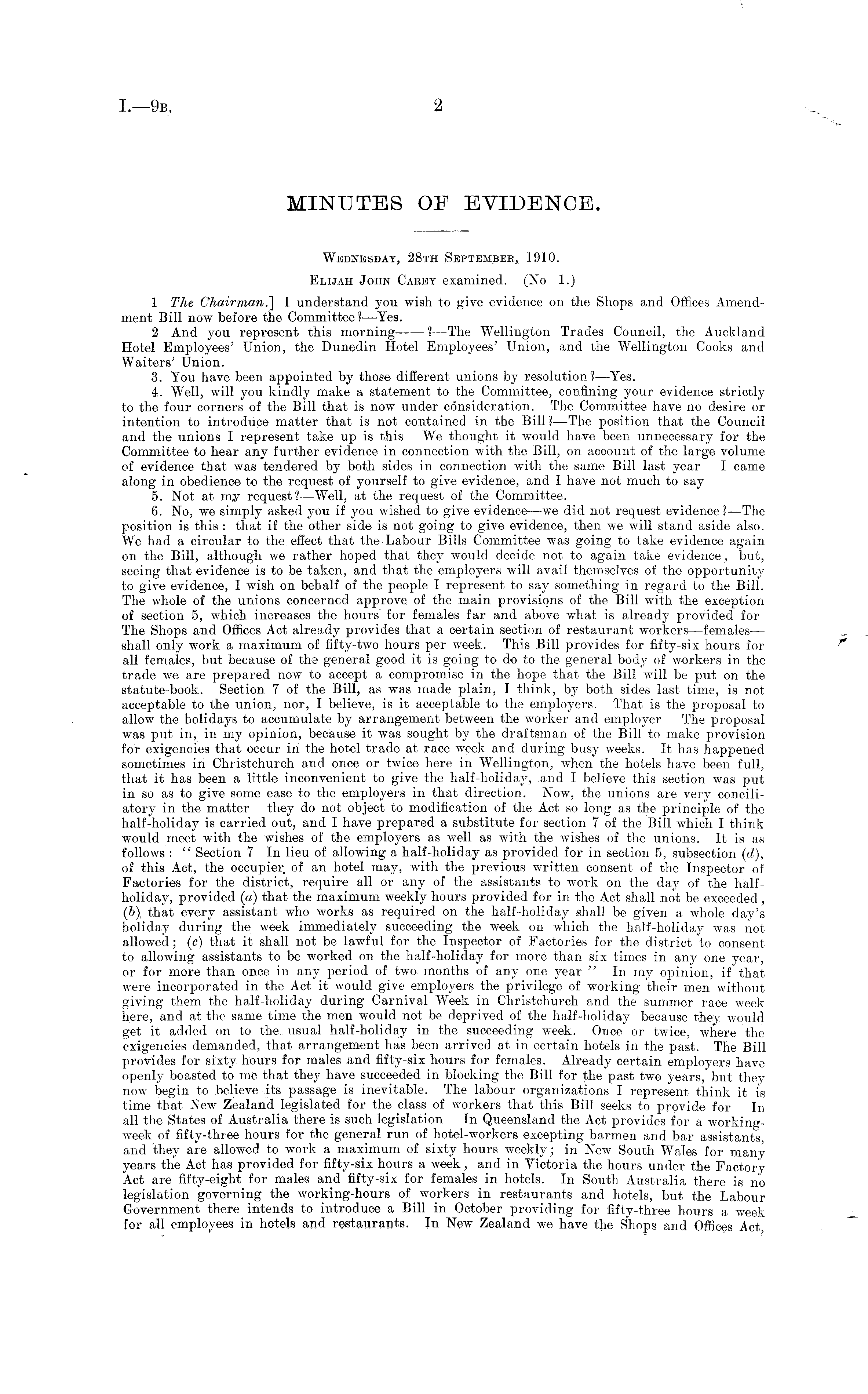 Weunesday, 28th September, 1910. Elijah John Carey examined. (No 1.) 1 The I understand you wish to give evidence on the Shops and Offices Amendment Bill now before the Committee? —Yes. 2 And you represent this morning I—The1 —The Wellington Trades Council, the Auckland Hotel Employees' Union, the Dunedin Hotel Employees' Union, and the Wellington Cooks and Waiters' Union. 3. You have been appointed by those different unions by resolution? —Yes. 4. Well, will you kindly make a statement to the Committee, confining your evidence strictly to the four corners of the Bill that is now under consideration. The Committee have no desire or intention to introduce matter that is not contained in the Bill ?—The position that the Council and the unions I represent take up is this We thought it would have been unnecessary for the Committee to hear any further evidence in connection with the Bill, on account of the large volume of evidence that was tendered by both sides in connection with the same Bill last I came along in obedience to the request of yourself to give evidence, and I have not much to say 5. Not at my request?— Well, at the request of the Committee. 6. No, we simply asked you if wished to give evidence —we did not request evidence? —The position is this : that if the other side is not going to give evidence, then we will stand aside also. We had a circular to the effect that the Labour Bills Committee was going to take evidence again on the Bill, although we rather hoped that they would decide not to again take evidence, but, seeing that evidence is to be taken, and that the employers will avail themselves of the opportunity to give evidence, I wish on behalf of the people I represent to say something in regard to the Bill. The whole of the unions concerned approve of the main provisions of the Bill with the exception of section 5, which increases the hours for females far and above what is already provided for The Shops and Offices Act already provides that a certain section of restaurant workers—females— shall only work a maximum of fifty-two hours per week. This Bill provides for fifty-six hours for all females, but because of the general good it is going to do to the general body of workers in the trade we are prepared now to accept a compromise in the hope that the Bill will be put on the statute-book. Section 7of the Bill, as was made plain, I think, by both sides last time, is not acceptable to the union, nor, I believe, is it acceptable to the employers. That is the proposal to allow the holidays to accumulate by arrangement between the worker and employer The proposal was put in, in my opinion, because it was sought by the draftsman of the Bill to make provision for exigencies that occur in the hotel trade at race week and during busy weeks. It has happened sometimes in Christchurch and once or twice here in Wellington, when the hotels have been full, that it has been a little inconvenient to give the half-holiday, and I believe this section was put in so as to give some ease to the employers in that direction. Now, the unions are very conciliatory in the matter they do not object to modification of the Act so long as the principle of the half-holiday is carried out, and I have prepared a substitute for section 7 of the Bill which I think would meet with the wishes of the employers as well as with the wishes of the unions. It is as follows : " Section 7 In lieu of allowing a half-holiday as provided for in section 5, subsection (d), of this Act, the occupier of an hotel may, with the previous written consent of the Inspector of Factories for the district, require all or any of the assistants to work on the day of the halfholiday, provided (a) that the maximum weekly hours provided for in the Act shall not be exceeded, (6), that every assistant who works as required on the half-holiday shall be given, a whole day's holiday during the week immediately succeeding the week on which the half-holiday was not allowed; (c) that it shall not be lawful for the Inspector of Factories for the district to consent to allowing assistants to be worked on the half-holiday for more than six times in any one year, or for more than once in any period of two months of any one year " In my opinion, if that were incorporated in the Act it would give employers the privilege of working their men without giving them the half-holiday during Carnival Week in Christchurch and the summer race week here, and at the same time the men would not be deprived of the half-holiday because they would get it added on to the usual half-holiday in the succeeding week. Once or twice, where the exigencies demanded, that arrangement has been arrived at in certain hotels in the past. The Bill provides for sixty hours for males and fifty-six hours for females. Already certain employers have openly boasted to me that they have succeeded in blocking the Bill for the past two years, but they now begin to believe its passage is inevitable. The labour organizations I represent think it is time that New Zealand legislated for the class of workers that this Bill seeks to provide for In all the States of Australia there is such legislation In Queensland the Act provides for a workingweek of fifty-three hours for the general run of hotel-workers excepting barmen and bar assistants, and they are allowed to work a maximum of sixty hours weekly; in New South Wales for many years the Act has provided for fifty-six hours a week, and in Victoria the hours under the Factory Act are fifty-eight for males and fifty-six for females in hotels. In South Australia there is no legislation governing the working-hours of workers in restaurants and hotels, but the Labour Government there intends to introduce a Bill in October providing for fifty-three hours a week for all employees in hotels and restaurants. In New Zealand we have the Shops and Offices Act,