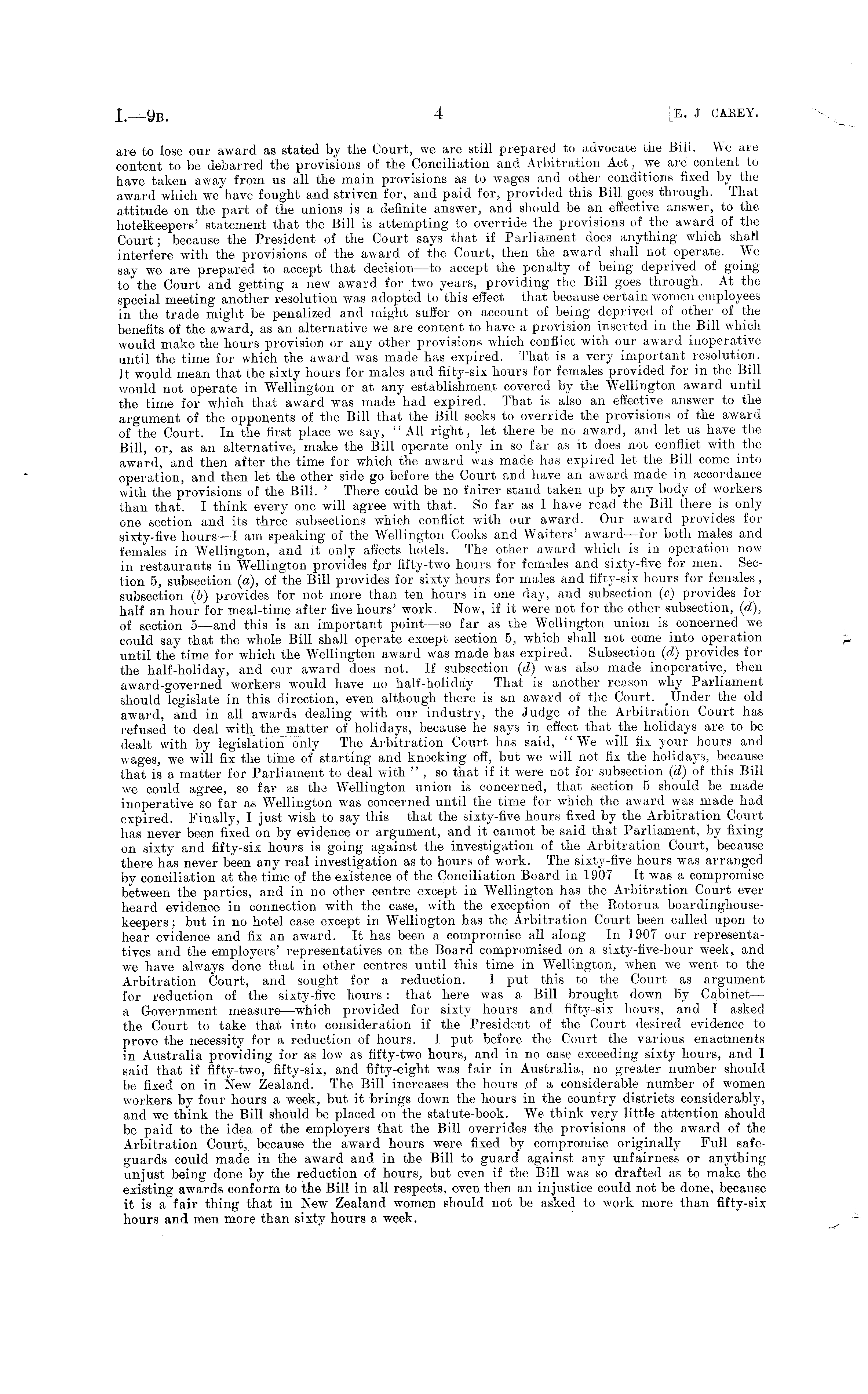 are to lose our award as stated by the Court, we are still prepared to advocate the Bill. We are content to be debarred the provisions of the Conciliation and Arbitration Act, we are content to have taken away from us all the main provisions as to wages and other conditions fixed by the award which we have fought and striven for, and paid for, provided this Bill goes through. That attitude on the part of the unions is a definite answer, and should be an effective answer, to the hotelkeepers' statement that the Bill is attempting to override the provisions of the award of the Court; because the President of the Court says that if Parliament does anything which shaM interfere with the provisions of the award of the Court, then the award shall not operate. We say we are prepared to accept that decision—to accept the penalty of being deprived of going to the Court and getting a new award for two years, providing the Bill goes through. At the special meeting another resolution was adopted to this effect that because certain women employees in the trade might be penalized and might suffer on account of being deprived of other of the benefits of the award, as an alternative we are content to have a provision inserted in the Bill which would make the hours provision or any other provisions which conflict with our award inoperative until the time for which the award was made has expired. That is a very important resolution. It would mean that the sixty hours for males and fiity-six hours for females provided for in the Bill would not operate in Wellington or at any establishment covered by the Wellington award until the time for which that award was made had expired. That is also an effective answer to the argument of the opponents of the Bill that the Bill seeks to override the provisions of the award of the Court. In the first place we say, "All right, let there be no award, and let us have the Bill, or, as an alternative, make the Bill operate only in so far as it does not conflict with the award, and then after the time for which the award was made has expired let the Bill come into operation, and then let the other side go before the Court and have an award made in accordance with the provisions of the Bill. ' There could be no fairer stand taken up by any body of workers than that. I think every one will agree with that. So far as 1 have read the Bill there is only one section and its three subsections which conflict with our award. Our award provides for sixty-five hours—l am speaking of the Wellington Cooks and Waiters' award—for both males and females in Wellington, and it only affects hotels. The other award which is in operation now in restaurants in Wellington provides fpr fifty-two hours for females and sixty-five for men. Section 5, subsection (a), of the Bill provides for sixty hours for males and fifty-six hours for females, subsection (&) provides for not more than ten hours in one day, and subsection (c) provides for half an hour for meal-time after five hours' work. Now, if it were not for the other subsection, (d), of section s—and this is an important point—so far as the Wellington union is concerned we could say that the whole Bill shall operate except section 5, which shall not come into operation until the time for which the Wellington award was made has expired. Subsection (d) provides for the half-holiday, and our award does not. If subsection (d) was also made inoperative, then award-governed workers would have no half-holiday That is another reason why Parliament should legislate in this direction, even although there is an award of the Court. _ Under the old award, and in all awards dealing with our industry, the Judge of the Arbitration Court has refused to deal with the matter of holidays, because he says in effect that J;he holidays are to be dealt with by legislation only The Arbitration Court has said, "We will fix your hours and wages, we will fix the time of starting and knocking off, but we will not fix the holidays, because that is a matter for Parliament to deal with " , so that if it were not for subsection (d) of this Bill we could agree, so far as the Wellington union is concerned, that section 5 should be made inoperative so far as Wellington was concerned until the time for which the award was made had expired. Finally, I just wish to say this that the sixty-five hours fixed by the Arbitration Court has never been fixed on by evidence or argument, and it cannot be said that Parliament, by fixing on sixty and fifty-six hours is going against the investigation of the Arbitration Court, because there has never been any real investigation as to hours of work. The sixty-five hours was arranged by conciliation at the time of the existence of the Conciliation Board in 1907 It was a compromise between the parties, and in no other centre except in Wellington has the Arbitration Court ever heard evidence in connection with the case, with the exception of the Rotorua boardinghousekeepers; but in no hotel case except in Wellington has the Arbitration Court been called upon to hear evidence and fix an award. It has been a compromise all along In 1907 our representatives and the employers' representatives on the Board compromised on a sixty-five-hour week, and we have always done that in other centres until this time in Wellington, when we went to the Arbitration Court, and sought for a reduction. I put this to the Court as argument for reduction of the sixty-five hours : that here was a Bill brought down by Cabinet— a Government measure —which provided for sixty hours and fifty-six hours, and 1 asked the Court to take that into consideration if the President of the Court desired evidence to prove the necessity for a reduction of hours. I put before the Court the various enactments in Australia providing for as low as fifty-two hours, and in no case exceeding sixty hours, and I said that if fifty-two, fifty-six, and fifty-eight was fair in Australia, no