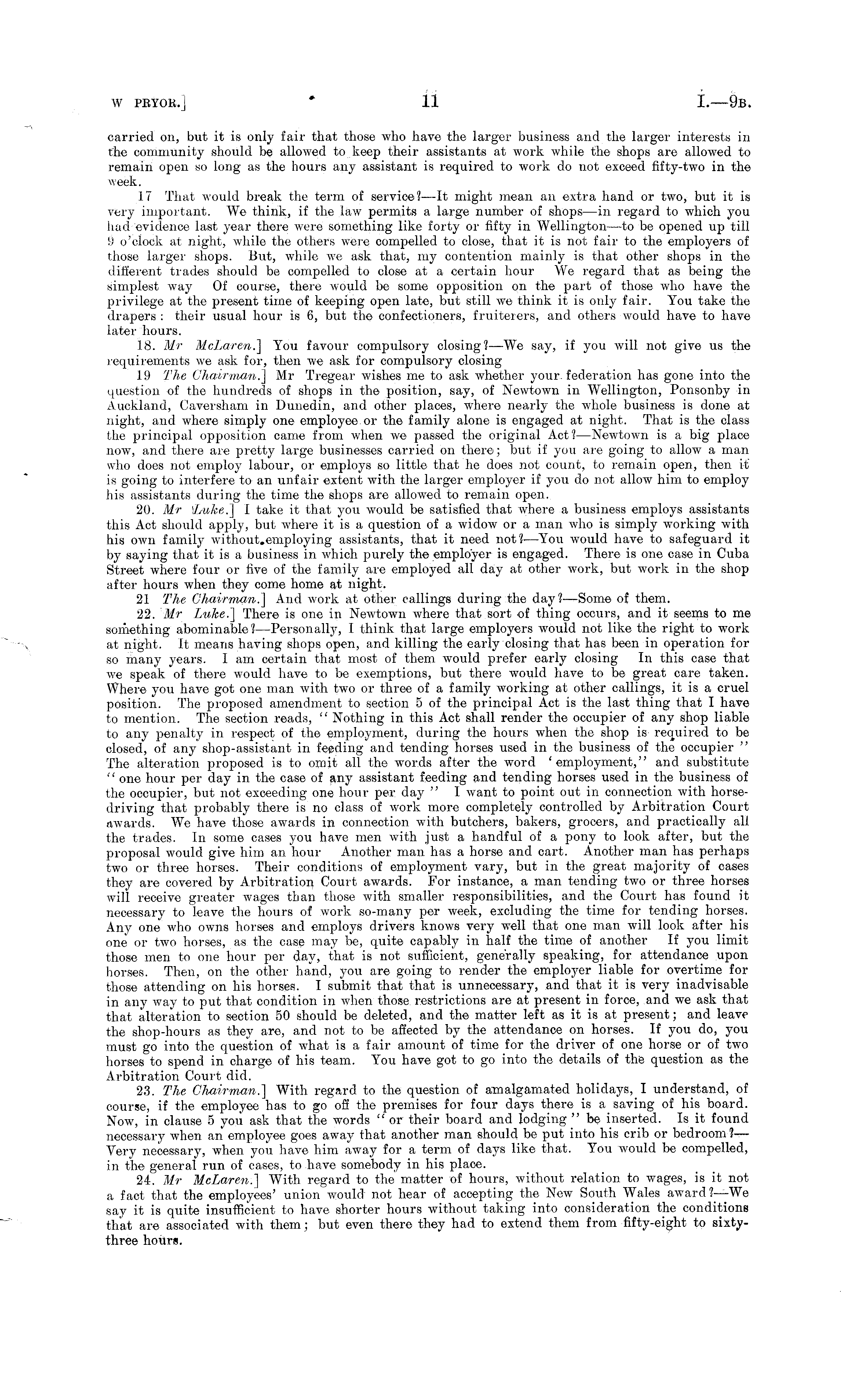 carried on, but it is only fair that those who have the larger business and the larger interests in the community should be allowed to keep their assistants at work while the shops are allowed to remain open so long as the hours any assistant is required to work do not exceed fifty-two in the week. 17 That would break the term of service? —It might mean an extra hand or two, but it is very important. We think, if the law permits a large number of shops—in regard to which you had evidence last year there were something like forty or fifty in Wellington—to be opened up till 9 o'clock at night, while the others were compelled to close, that it is not fair to the employers of those larger shops. But, while we ask that, my contention mainly is that other shops in the different trades should be compelled to close at a certain hour We regard that as being the simplest way Of course, there would be some opposition on the part of those who have the privilege at the present time of keeping open late, but still we think it is only fair. You take the drapers : their usual hour is 6, but the confectioners, fruiterers, and others would have to have later hours. 18. Mr McLaren.] You favour compulsory closing?—We say, if you will not give us the requirements we ask for, then we ask for compulsory closing 19 The Chairman.] Mr Tregear wishes me to ask whether your, federation has gone into the question of the hundreds of shops in the position, say, of Newtown in Wellington, Ponsonby in Auckland, Caversham in Dunedin, and other places, where nearly the whole business is done at night, and where simply one employee, or the family alone is engaged at night. That is the class the principal opposition came from when we passed the original Act? —Newtown is a big place now, and there are pretty large businesses carried on there; but if you are going to allow a man who does not employ labour, or employs so little that he does not count, to remain open, then it is going to interfere to an unfair extent with the larger employer if you do not allow him to employ his assistants during the time the shops are allowed to remain open. 20. Mr \Luke.] I take it that you would be satisfied that where a business employs assistants this Act should apply, but where it is a question of a widow or a man who is simply working with his own family without.einploying assistants, that it need not?— You would have to safeguard it by saying that it is a business in which purely the employer is engaged. There is one case in Cuba Street where four or five of the family are employed all day at other work, but work in the shop after hours when they come home at night. 21 The Chairman.] And work at other callings during the day? —Some of them. 22. Mr Luke.] There is one in Newtown where that sort of thing occurs, and it seems to me something abominable? —Personally, I think that large employers would not like the right to work at night. It means having shops open, and killing the early closing that has been in operation for so many years. lam certain that most of them would prefer early closing In this case that we speak of there would have to be exemptions, but there would have to be great care taken. Where you have got one man with two or three of a family working at other callings, it is a cruel position. The proposed amendment to section sof the principal Act is the last thing that I have to mention. The section reads, " Nothing in this Act shall render the occupier of any shop liable to any penalty in respect of the employment, during the hours when the shop is required to be closed, of any shop-assistant in feeding and tending horses used in the business of the occupier " The alteration proposed is to omit all the words after the word 'employment," and substitute '' one hour per day in the case of any assistant feeding and tending horses used in the business of the occupier, but not exceeding one hour per day " I want to point out in connection with horsedriving that probably there is no class of work more completely controlled by Arbitration Court awards. We have those awards in connection with butchers, bakers, grocers, and practically all the trades. In some cases you have men with just a handful of a pony to look after, but the proposal would give him an hour Another man has a horse and cart. Another man has perhaps two or three horses. Their conditions of employment vary, but in the great majority of cases they are covered by Arbitration Court awards. For instance, a man tending two or three horses will receive greater wages than those with smaller responsibilities, and the Court has found it necessary to leave the hours of work so-many per week, excluding the time for tending horses. Any one who owns horses and employs drivers knows very well that one man will look after his one or two horses, as the case may be, quite capably in half the time of another If you limit those men to one hour per day, that is not sufficient, generally speaking, for attendance upon horses. Then, on the other hand, you are going to render the employer liable for overtime for those attending on his horses. I submit that that is unnecessary, and that it is very inadvisable in any way to put that condition in when those restrictions are at present in force, and we ask that that alteration to section 50 should be deleted, and the matter left as it is at present; and leave the shop-hours as they are, and not to be affected by the attendance on horses. If you do, you must go into the question of what is a fair amount of time for the driver of one horse or of two horses to spend in charge of his team. You have got to go into the details of the question as the Arbitration Court did. 23. The Chairman.] With regard to the question of amalgamated holidays, I understand, of course, if the employee has to go off the premises for four days there is a saving of his board. Now, in clause 5 you ask that the words "or their board and lodging "be inserte