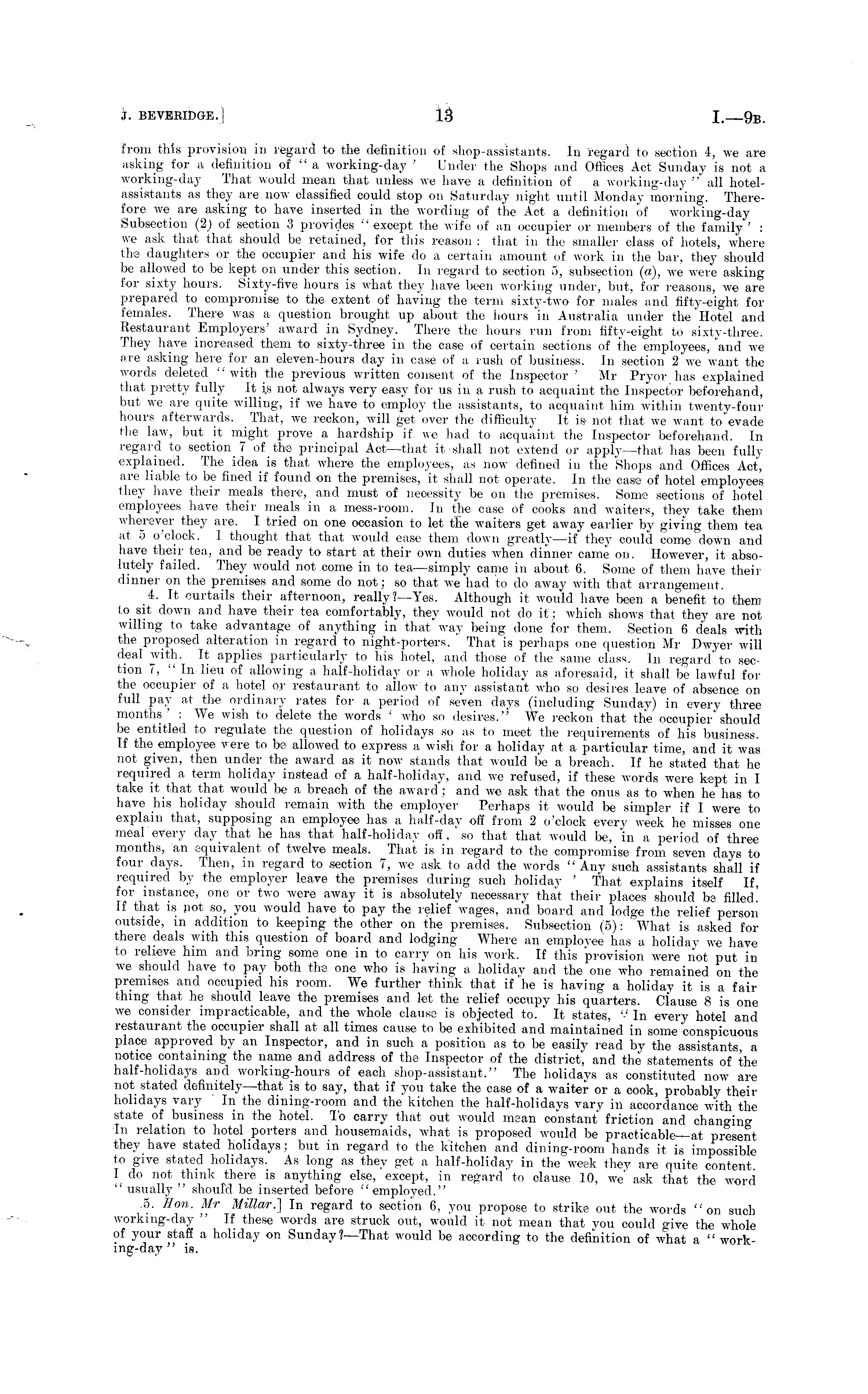 from this provision in regard to the definition of shop-assistants. In regard to section 4, we are asking for a definition of " a working-day ' Under the Shops and Offices Act Sunday is not a working-day That would mean that unless we have a definition of a working-day " all hotelassistants as they are now classified could stop on Saturday night until Monday morning. Therefore we are asking to have inserted in the wording of the Act a definition of working-day Subsection (2) of section 3 provides " except the wife of an occupier or members of the family ' : we ask that that should be retained, for this reason : that in the smaller class of hotels, where the daughters or the occupier and his wife do a certain amount of work in the bar, they should be allowed to be kept on under this section. In regard to section 5, subsection (a), we were asking for sixty hours. Sixty-five hours is what they have been working under, but, for reasons, we are prepared to compromise to the extent of having the term sixty-two for males and fifty-eight for females. There was a question brought up about the hours in Australia under the Hotel and Restaurant Employers' award in Sydney. There the hours run from fifty-eight to sixty-three. They have increased them to sixty-three in the case of certain sections of the employees, and we are asking here for an eleven-hours day in case of a rush of business. In section 2we want the words deleted "with the previous written consent of the Inspector ' Mr Pryor has explained that pretty fully It i.s not always very easy for us in a rush to acquaint the Inspector beforehand, but we are quite willing, if we have to employ the assistants, to acquaint him within twenty-four hours afterwards. That, we reckon, will get over the difficulty It is- not that we want to'evade the law, but it might prove a hardship if we had to acquaint the Inspector beforehand. In regard to section 7 of the principal Act—that it shall not extend or apply—that has been fullyexplained. The ideais that where the employees, as now defined in the Shops and Offices Act, are liable to be fined if found on the premises, it shall not operate. In the case of hotel employees they have their meals there, and must of necessity be on the premises. Some sections of hotel employees have their meals in a mess-room. In the case of cooks and waiters, they take them wherever they are. I tried on one occasion to let the waiters get away earlier by giving them tea at 5 o'clock. 1 thought that that would ease them down greatly—if they could come down and have their tea, and be ready to start at their own duties when dinner came on. However, it absolutely failed. They would not come in to tea—simply came in about 6. Some of them have their dinner on the premises and some do not; so that we'had to do away with that arrangement. 4. It curtails their afternoon, really?— Yes. Although it would have been a benefit to them to sit down and have their tea comfortably, they would not do it: which shows that they are not willing to take advantage of anything in that'way being done for them. Section 6 deals with the proposed alteration in regard to night-porters. ' That is perhaps one question Mr Dwyer will deal with. It applies particularly to his hotel, and those of the same class. In regard' to section 7, " In lieu of allowing a half-holiday or a whole holiday as aforesaid, it shall be lawful for the occupier of a hotel or restaurant to allow to any assistant who so desires leave of absence on full pay at the ordinary rates for a period of seven days (including Sunday) in every three months ': We wish to delete the words ' who so desires." We reckon that the occupier" should be entitled to regulate the question of holidays so as to meet the requirements of his business. If the employee were to ba allowed to express a wish for a holiday at a particular time, and it was not given, then under the award as it now stands that would be a breach. If he stated that he required a term holiday instead of a half-holiday, and we refused, if these words were kept in I take it that that would be a breach of the award; and we ask that the onus as to when he has to have his holiday should remain with the employer Perhaps it would be simpler if I were to explain that, supposing an employee has a half-day off from 2 o'clock every week he misses one meal every day_ that he has that half-holiday off, so that that would be, 'in a period of three months, an equivalent of twelve meals. That is in regard to the compromise from seven days to four days. Then, in regard to section 7, we ask to add the words "Any such assistants shall if required by the employer leave the premises during such holiday ' That explains itself If, for instance, one or two were away it is absolutely necessary that their places should be filled' If that is not so, you would have to pay the relief wages, and board and lodge the relief person outside, in addition to keeping the other on the premises. Subsection (5): What is asked for there deals with this question of board and lodging Where an employee has a holiday we have to relieve him and bring some one in to carry on his work. If this provision were not put in we should have to pay both the one who is having a holiday and the one who remained on the premises and occupied his room. We further think that if'he is having a holiday it is a fair thing that he should leave the premises and let the relief occupy his quarters. Clause 8 is one we consider impracticable, and the whole clause is objected to. It states, '-' In every hotel and restaurant the occupier shall at all times cause to be exhibited and maintained in some conspicuous place approved by an Inspector, and in such a position as to be easily read by the assistants, a notice containing the name and address of the Inspector of the district', and the statements of the half-holidays and working-hours of each shop-assistant." The as constituted now are not stated def