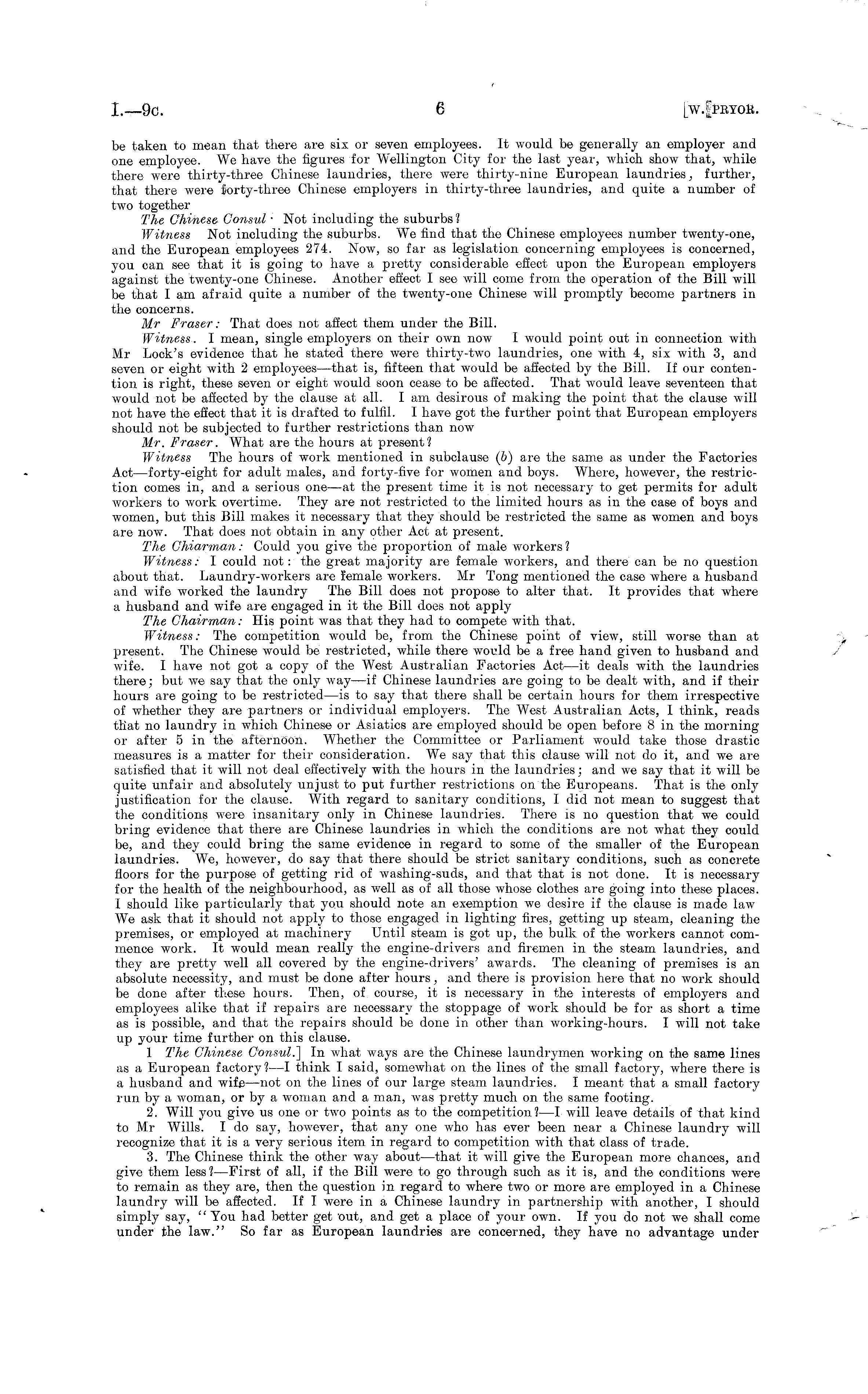 be taken to mean that there are six or seven employees. It would be generally an employer and one employee. We have the figures for Wellington City for the last year, which show that, while there were thirty-three Chinese laundries, there were thirty-nine European laundries, further, that there were forty-three Chinese employers in thirty-three laundries, and quite a number of two together The Chinese Consul • Not including the suburbs ? Witness Not including the suburbs. We find that the Chinese employees number twenty-one, and the European employees 274. Now, so far as legislation concerning employees is concerned, you can see that it is going to have a pretty considerable effect upon the European employers against the twenty-one Chinese. Another effect I see will come from the operation of the Bill will be that I am afraid quite a number of the twenty-one Chinese will promptly become partners in the concerns. Mr Eraser: That does not affect them under the Bill. Witness. I mean, single employers on their own now I would point out in connection with Mr Lock's evidence that he stated there were thirty-two laundries, one with 4, six with 3, and seven or eight with 2 employees—that is, fifteen that would be affected by the Bill. If our contention is right, these seven or eight would soon cease to be affected. That would leave seventeen that would not be affected by the clause at all. lam desirous of making the point that the clause will not have the effect that it is drafted to fulfil. I have got the further point that European employers should not be subjected to further restrictions than now Mr. Eraser. What are the hours at present? Witness The hours of work mentioned in subclause (&) are the same as under the Factories Act—forty-eight for adult males, and forty-five for women and boys. Where, however, the restriction comes in, and a serious one—at the present time it is not necessary to get permits for adult workers to work overtime. They are not restricted to the limited hours as in the case of boys and women, but this Bill makes it necessary that they should be restricted the same as women and boys are now. That does not obtain in any other Act at present. The Chiarman: Could you give the proportion of male workers ? Witness: I could not: the great majority are female workers, and there can be no question about that. Laundry-workers are female workers. Mr Tong mentioned the case where a husband and wife worked the laundry The Bill does not propose to alter that. It provides that where a husband and wife are engaged in it the Bill does not apply The Chairman: His point was that they had to compete with that. Witness: The competition would be, from the Chinese point of view, still worse than at present. The Chinese would be restricted, while there would be a free hand given to husband and wife. I have not got a copy of the West Australian Factories Act —it deals with the laundries there; but we say that the only way —if Chinese laundries are going to be dealt with, and if their hours are going to be restricted —is to say that there shall be certain hours for them irrespective of whether they are partners or individual employers. The West Australian Acts, I think, reads that no laundry in which Chinese or Asiatics are employed should be open before 8 in the morning or after 5 in the afternoon. Whether the Committee or Parliament would take those drastic measures is a matter for their consideration. We say that this clause will not do it, and we are satisfied that it will not deal effectively with the hours in the laundries; and we say that it will be quite unfair and absolutely unjust to put further restrictions on the Europeans. That is the only justification for the clause. With regard to sanitary conditions, I did not mean to suggest that the conditions were insanitary only in Chinese laundries. There is no question that we could bring evidence that there are Chinese laundries in which the conditions are not what they could be, and they could bring the same evidence in regard to some of the smaller of the European laundries. We, however, do say that there should be strict sanitary conditions, such as concrete floors for the purpose of getting rid of washing-suds, and that that is not done. It is necessary for the health of the neighbourhood, as well as of all those whose clothes are going into these places. I should like particularly that you should note an exemption we desire if the clause is made law We ask that it should not apply to those engaged in lighting fires, getting up steam, cleaning the premises, or employed at machinery Until steam is got up, the bulk of the workers cannot commence work. It would mean really the engine-drivers and firemen in the steam laundries, and they are pretty well all covered by the engine-drivers' awards. The cleaning of premises is an absolute necessity, and must be done after hours, and there is provision here that no work should be done after these hours. Then, of course, it is necessary in the interests of employers and employees alike that if repairs are necessary the stoppage of work should be for as short a time as is possible, and that the repairs should be done in other than working-hours. I will not take up your time further on this clause. 1 The Chinese Consul.] In what ways are the Chinese laundrymen working on the same lines as a European factory?—l think I said, somewhat on the lines of the small factory, where there is a husband and wife —not on the lines of our large steam laundries. I meant that a small factory run by a woman, or by a woman and a man, was pretty much on the same footing. 2. Will you give us one or two points as to the competition?—l will leave details of that kind to Mr Wills. I do say, however, that any one who has ever been near a Chinese laundry will recognize that it is a very serious item in regard to competition with that class of trade. 3. The Chinese think the other way about —that i