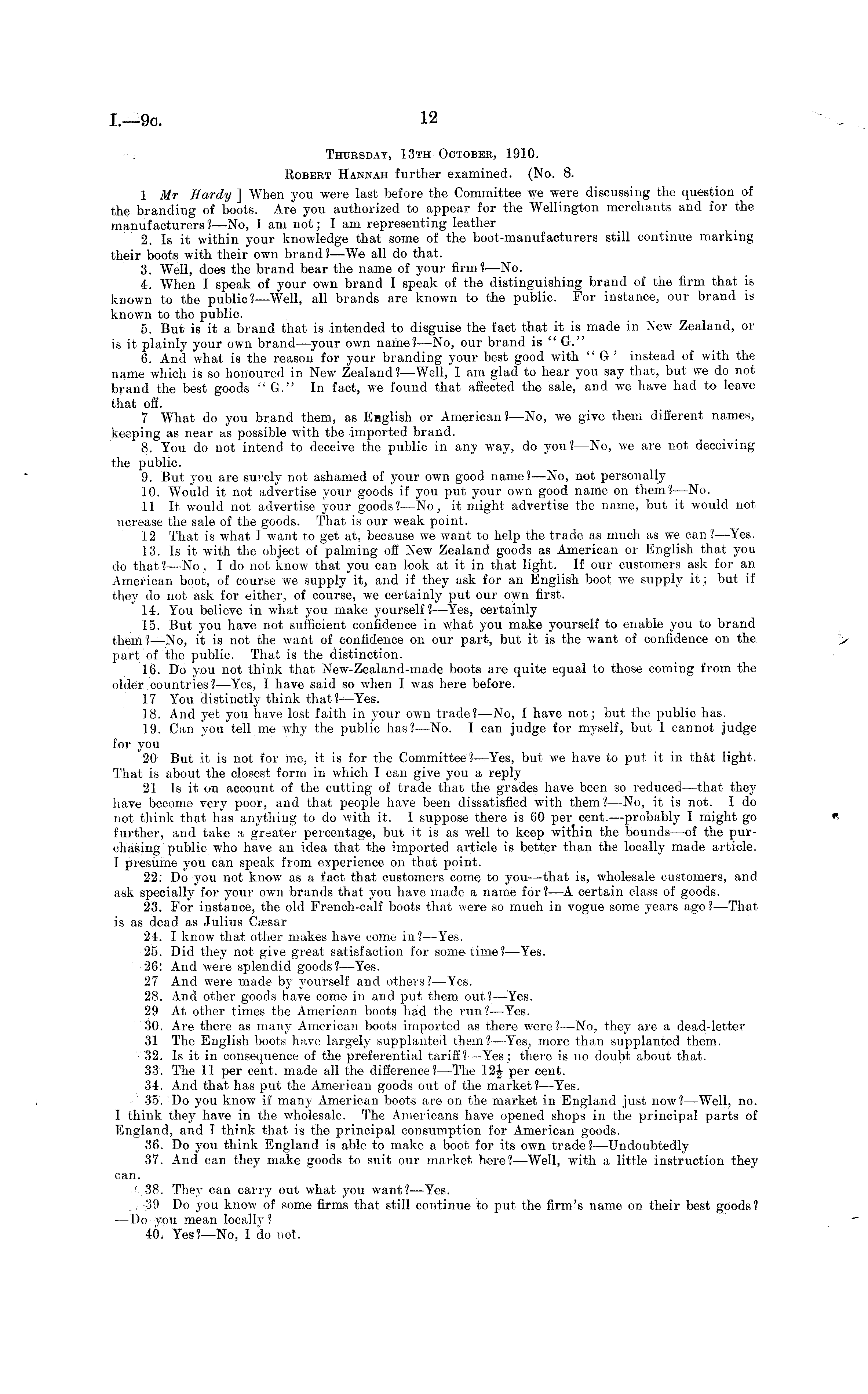 Thursuay, 13th October, 1910. Robert Hannah further examined. (No. 8. I Mr Hardy ] When you were last before the Committee we were discussing the question of the branding of boots. Are you authorized to appear for the Wellington merchants and for the manufacturers? —No, I am not; I am representing leather 2. Is it within your knowledge that some of the boot-manufacturers still continue marking their boots with their own brand? —We all do that. 3. Well, does the brand bear the name of your firm?—No. 4. When I speak of your own brand I speak of the distinguishing brand of the firm that is known to the public?—Well, all brands are known to the public. For instance, our brand is known to the public. 5. But is it a brand that is intended to disguise the fact that it is made in New Zealand, or is it plainly your own brand —your own name?—No, our brand is " G." 6. And what is the reason for your branding your best good with "G ' instead of with the name which is so honoured in New Zealand?—Well, I am glad to hear you say that, but we do not brand the best goods "G." In fact, we found that affected the sale, and we have had to leave that off. 7 What do you brand them, as English or American ?—No, we give them different names, keeping as near as possible with the imported brand. 8. You do not intend to deceive the public in any way, do you? —No, we are not deceiving the public. 9. But you are surely not ashamed of your own good name? —No, not personally 10. Would it not advertise your goods if you put your own good name on them?—No. II It would not advertise your goods? —No, it might advertise the name, but it would not ucrease the sale of the goods. That is our weak point. 12 That is what I want to get at, because we want to help the trade as much as we can?—Yes. 13. Is it with the object of palming off New Zealand goods as American or English that you do that ?—No, Ido not know that you can look at it in that light. If our customers ask for an American boot, of course we supply it, and if they ask for an English boot we supply it; but if they do not ask for either, of course, we certainly put our own first. 14. You believe in what you make yourself?—Yes, certainly 15. But you have not sufficient confidence in what you make yourself to enable you to brand them? —No, it is not the want of confidence on our part, but it is the want of confidence on the part of the public. That is the distinction. 16. Do you not think that New-Zealand-made boots are quite equal to those coming from the older countries? —Yes, I have said so when I was here before. 17 You distinctly think that?—Yes. 18. And yet you have lost faith in your own trade?-—No, I have not; but the public has. 19. Can you tell me why the public lias?—No. I can judge for myself, but 1 cannot judge for you 20 But it is not for me, it is for the Committee?—Yes, but we have to put it in that light. That is about the closest form in which I can give you a reply 21 Is it on account of the cutting of trade that the grades have been so reduced —that they have become very poor, and that people have been dissatisfied with them ?—No, it is not. I do not think that has anything to do with it. I suppose there is 60 per cent. —probably I might go further, and take a greater percentage, but it is as well to keep within the bounds —of the purchasing public who have an idea that the imported article is better than the locally made article. I presume you can speak from experience on that point. 22: Do you not know as a fact that customers come to you —that is, wholesale customers, and ask specially for your own brands that you have made a name for? —A certain class of goods. 23. For instance, the old French-calf boots that were so much in vogue some years ago?—That is as dead as Julius Caesar 24. I know that other makes have come in?—Yes. 25. Did they not give great satisfaction for some time? —Yes. 26: And were splendid goods?—Yes. 27 And were made by }-ourself and others?—Yes. 28. And other goods have come in and put them out ?—Yes. 29 At other times the American boots had the run? —Yes. 30. Are there as many American boots imported as there were? —No, they are a dead-letter 31 The English boots have largely supplanted them? —Yes, more than supplanted them. 32. Is it in consequence of the preferential tariff?—Yes; there is no doubt about that. 33. The 11 per cent, made all the difference? —The 12| per cent. 34. And that has put the American goods out of the market? —Yes. 35. Do you know if many American boots are on the market in England just now?—Well, no. I think they have in the wholesale. The Americans have opened shops in the principal parts of England, and I think that is the principal consumption for American goods. 36. Do you think England is able to make a boot for its own trade?—Undoubtedly 37. And can they make goods to suit our market here?—Well, with a little instruction they can. 38. They can carry out what you want?—Yes. [39 Do you know of some firms that still continue to put the firm's name on their best goods? —Do you mean locally? 40. Yes?—No, I do not.