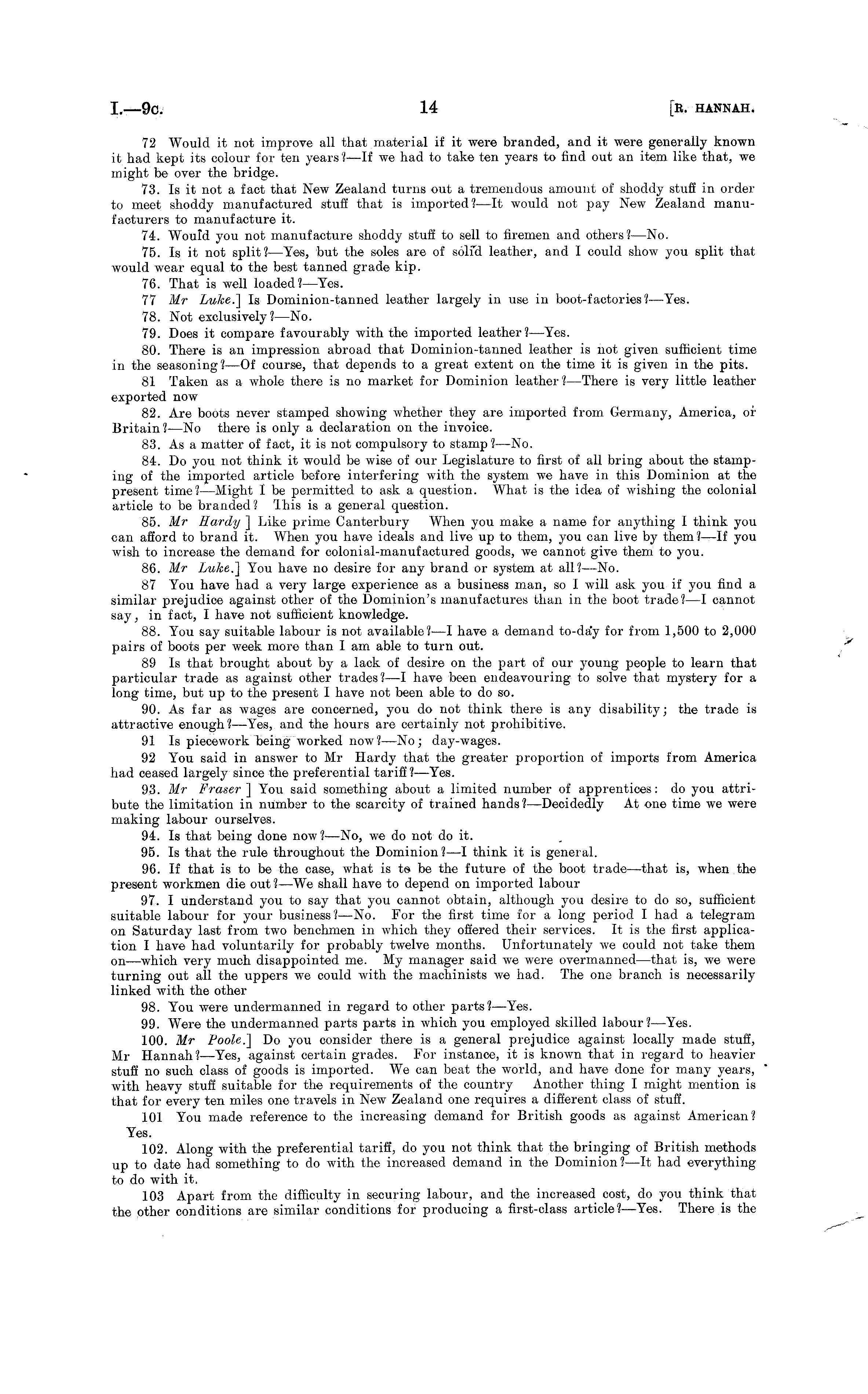 72 Would it not improve all that material if it were branded, and it were generally known it had kept its colour for ten years?—lf we had to take ten years to find out an item like that, we might be over the bridge. 73. Is it not a fact that New Zealand turns out a tremendous amount of shoddy stuff in order to meet shoddy manufactured stuff that is imported?—lt would not pay New Zealand manufacturers to manufacture it. 74. Would you not manufacture shoddy stuff to sell to firemen and others?—No. 75. Is it not split? —Yes, but the soles are of solfd leather, and I could show you split that would wear equal to the best tanned grade kip. 76. That is well loaded?—Yes. 77 Mr Luke.] Is Dominion-tanned leather largely in use in boot-factories?—Yes. 78. Not exclusively?—No. 79. Does it compare favourably with the imported leather? —Yes. 80. There is an impression abroad that Dominion-tanned leather is not given sufficient time in the seasoning? —Of course, that depends to a great extent on the time it is given in the pits. 81 Taken as a whole there is no market for Dominion leather ?—There is very little leather exported now 82. Are boots never stamped showing whether they are imported from Germany, America, or Britain ?—No there is only a declaration on the invoice. 83. As a matter of fact, it is not compulsory to stamp? —No. 84. Do you not think it would be wise of our Legislature to first of all bring about the stamping of the imported article before interfering with the system we have in this Dominion at the present time?—Might Ibe permitted to ask a question. What is the idea of wishing the colonial article to be branded? This is a general question. 85. Mr Hardy ] Like prime Canterbury When you make a name for anything I think you can afford to brand it. When you have ideals and live up to them, you can live by them?—lf you wish to increase the demand for colonial-manufactured goods, we cannot give them to you. 86. Mr Luke.] You have no desire for any brand or system at all?—No. 87 You have had a very large experience as a business man, so I will ask you if you find a similar prejudice against other of the Dominion's manufactures than in the boot trade?—l cannot say, in fact, I have not sufficient knowledge. 88. You say suitable labour is not available?—l have a demand to-da'y for from 1,500 to 2,000 pairs of boots per week more than I am able to turn out. 89 Is that brought about by a lack of desire on the part of our young people to learn that particular trade as against other trades?—l have been endeavouring to solve that mystery for a long time, but up to the present I have not been able to do so. 90. As far as wages are concerned, you do not think there is any disability; the trade is attractive enough? —Yes, and the hours are certainly not prohibitive. 91 Is piecework being worked now?—No; day-wages. 92 You said in answer to Mr Hardy that the greater proportion of imports from America had ceased largely since the preferential tariff ?—Yes. 93. Mr Eraser] You said something about a limited number of apprentices: do you attribute the limitation in number to the scarcity of trained hands?—Decidedly At one time we were making labour ourselves. 94. Is that being done now ?—No, we do not do it. 95. Is that the rule throughout the Dominion? —I think it is general. 96. If that is to be the case, what is to be the future of the boot trade—that is, when the present workmen die out ?—We shall have to depend on imported labour 97. I understand you to say that you cannot obtain, although you desire to do so, sufficient suitable labour for your business? —No. For the first time for a long period I had a telegram on Saturday last from two benchmen in which they offered their services. It is the first application I have had voluntarily for probably twelve months. Unfortunately we could not take them on —which very much disappointed me. My manager said we were overmanned —that is, we were turning out all the uppers we could with the machinists we had. The one branch is necessarily linked with the other 98. You were undermanned in regard to other parts?—Yes. 99. Were the undermanned parts parts in which you employed skilled labour?—Yes. 100. Mr Poole.] Do you consider there is a general prejudice against locally made stuff, Mr Hannah? —Yes, against certain grades. For instance, it is known that in regard to heavier stuff no such class of goods is imported. We can beat the world, and have done for many years, with heavy stuff suitable for the requirements of the country Another thing I might mention is that for every ten miles one travels in New Zealand one requires a different class of stuff. 101 You made reference to the increasing demand for British goods as against American? Yes. 102. Along with the preferential tariff, do you not think that the bringing of British methods up to date had something to do with the increased demand in the Dominion? —It had everything to do with it. 103 Apart from the difficulty in securing labour, and the increased cost, do you think that the other conditions are similar conditions for producing a first-class article?—Yes. There is the