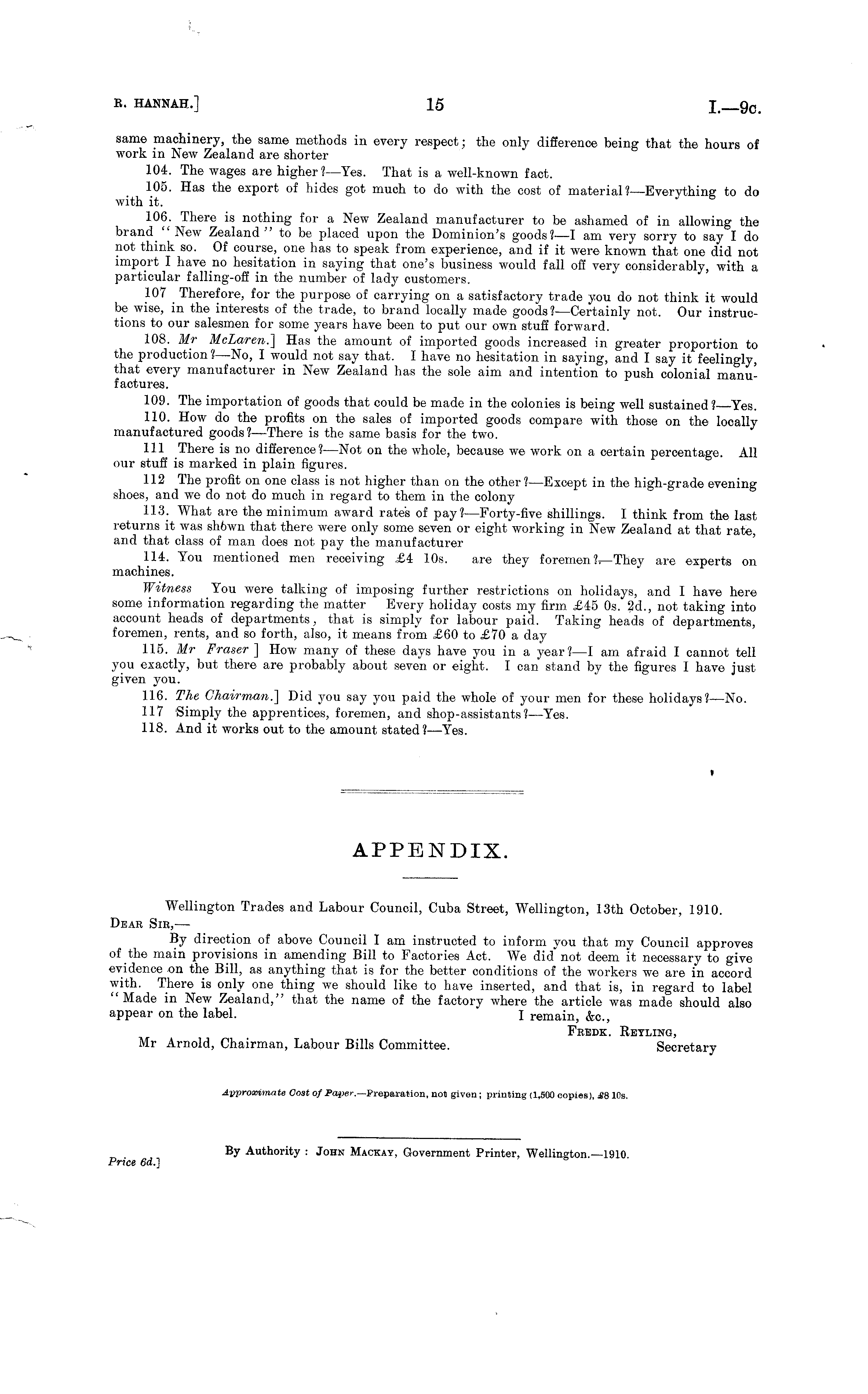 Wellington Trades and Labour Council, Cuba Street, Wellington, 13th October, 1910. Dear Sir, — By direction of above Council I am instructed to inform you that my Council approves of the main provisions in amending Bill to Factories Act. We did" not deem it necessary to give evidence on the Bill, as anything that is for the better conditions of the workers we are in accord with. There is only one thing we should like to have inserted, and that is, in regard to label "Made in New Zealand," that the name of the factory where the article was made should also appear on the label. I remain, &c, Fredk. Reyling, Mr Arnold, Chairman, Labour Bills Committee. Secretary Approximate Cost of Paper— Preparation, not given; printing (1,500 copies), £810s.
