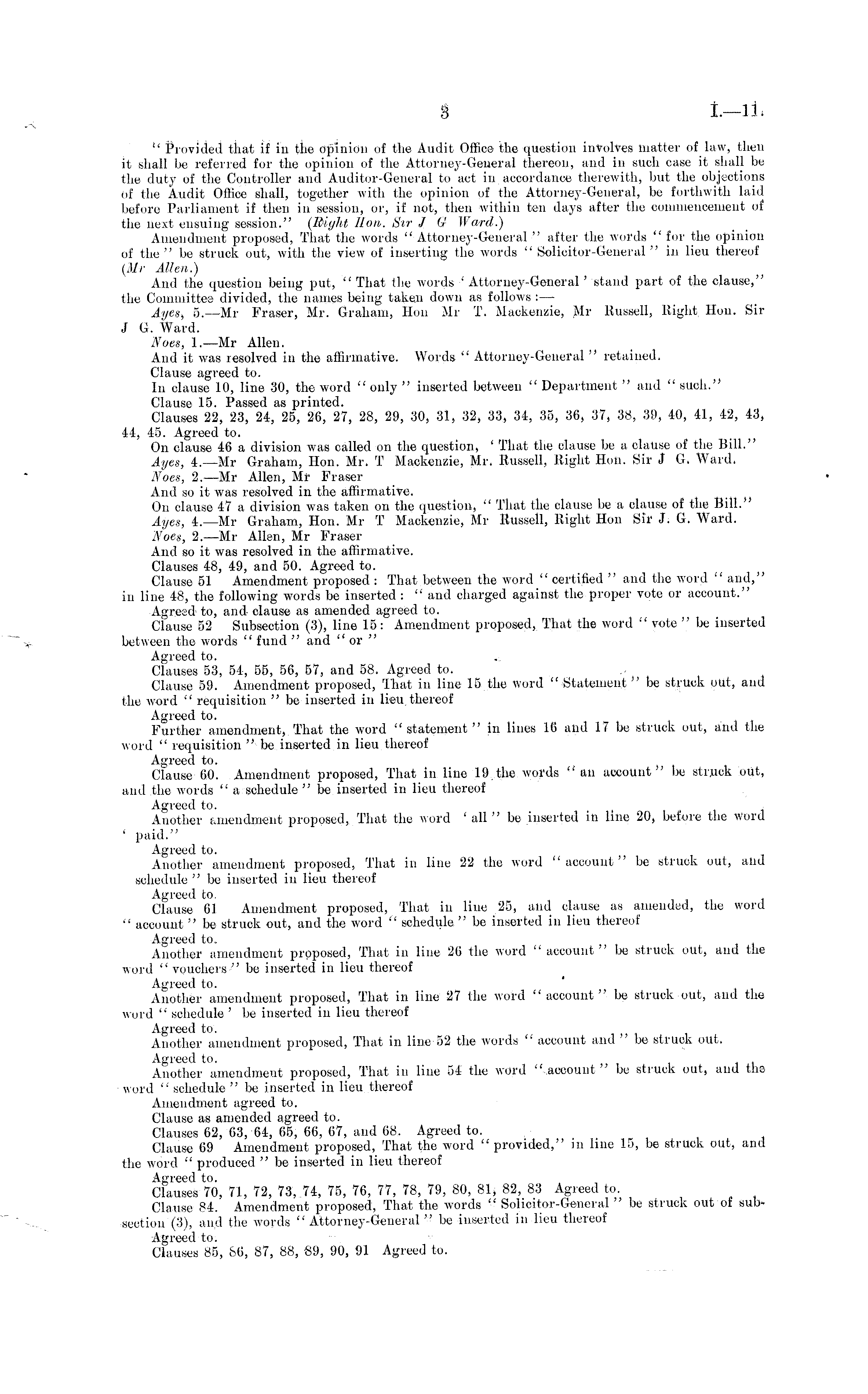 " Provided that if in the Opinion of the Audit Office the question involves matter of law, then it shall be referred for the opinion of the Attorney-General thereon, and in such case it shall be the duty of the Controller and Auditor-General to act in accordance therewith, but the objections of the Audit Office shall, together with the opinion of the Attorney-General, be forthwith laid before Parliament if then in session, or, if not, then within ten days after the commencement of the next ensuing session." (Right lion. Sir J G Ward.) Amendment proposed, That the words " Attorney-General " after the words " for the opinion of the" be struck out, with the view of inserting the words "Solicitor-General" in lieu thereof (Mr Allen.) And the question being put, " That the words ' Attorney-General ' stand part of the clause," the Committee divided, the names being taken down as follows : — Ayes, s.—Mr Fraser, Mr. Graham, Hou Mr T. Mackenzie, Mr Russell, Right Hon. Sir J G. Ward. Noes, I.—Mr Allen. And it was resolved in the affirmative. Words " Attorney-General " retained. Clause agreed to. In clause 10, line 30, the word " only " inserted between " Department " and " such." Clause 15. Passed as printed. Clauses 22, 23, 24, 25, 26, 27, 28, 29, 30, 31, 32, 33, 34, 35, 36, 37, 38, 39, 40, 41, 42, 43, 44, 45. Agreed to. On clause 46 a division was called on the question, ' That the clause be a clause of the Bill." Ayes, 4.—Mr Graham, Hon. Mr. T Mackenzie, Mr. Russell, Right Hou. Sir J G. Ward. Noes, 2. —Mr Allen, Mr Fraser And so it was resolved in the affirmative. On clause 47 a division was taken on the question, " That the clause be a clause of the Bill." Ayes, 4.—Mr Graham, Hon. Mr T Mackenzie, Mr Russell, Right Hou Sir J. G. Ward. Noes, 2.—Mr Allen, Mr Fraser And so it was resolved in the affirmative. Clauses 48, 49, and 50. Agreed to. Clause 51 Amendment proposed : That between the word " certified " and the word " and," in line 48, the following words be inserted : " and charged against the proper vote or account." Agreed to, and clause as amended agreed to. Clause 52 Subsection (3), line 15 : Amendment proposed, That the word " vote "be inserted between the words " fund " and "or " Agreed to. Clauses 53, 54, 55, 56, 57, and 58. Agreed to. Clause 59. Amendment proposed, lhat in line 15 the Word "Statement "be struck out, and the word " requisition " be inserted in lieu, thereof Agreed to. Further amendment, That the word "statement" in lines 16 and 17 be struck out, and the word " requisition " be inserted in lieu thereof Agreed to. Clause 60. Amendment proposed, That in line 19 the words "an account ' be struck out, and the words " a schedule " be inserted in lieu thereof Agreed to. Another amendment proposed, That the word 'all" be inserted in line 20, before the word ' paid." Agreed to. Another amendment proposed, That in line 22 the word "account" be struck out, and schedule " be inserted in lieu thereof Agreed to. Clause 61 Amendment proposed, That in line 25, and clause as amended, the word " account " be struck out, and the word " schedule " be inserted in lieu thereof Agreed to. Another amendment proposed, That in line 26 the word " account" be struck out, and the word "vouchers" be inserted in lieu thereof Agreed to. Another amendment proposed, That in line 27 the word "account" be struck out, and the word " schedule ' be inserted in lieu thereof Agreed to. Another amendment proposed, That in line 52 the words " account and ' be struck out. Agreed to. Another amendment proposed, That in line 54 the word "account" be struck out, and the word " schedule " be inserted in lieu thereof Amendment agreed to. Clause as amended agreed to. Clauses 62, 63, 64, 65, 66, 67, and 68. Agreed to. Clause 69 Amendment proposed, That the word "provided," in line 15, be struck out, and the word " produced " be inserted in lieu thereof Agreed to. Clauses 70, 71, 72, 73, 74, 75, 76, 77, 78, 79, 80, 81, 82, 83 Agreed to Clause 84. Amendment proposed, That the words " Solicitor-General be struck out of subsection (3), and the words "Attorney-General" be inserted in lieu thereof Agreed to. Clauses 85, 86, 87, 88, 89, 90, 91 Agreed to.