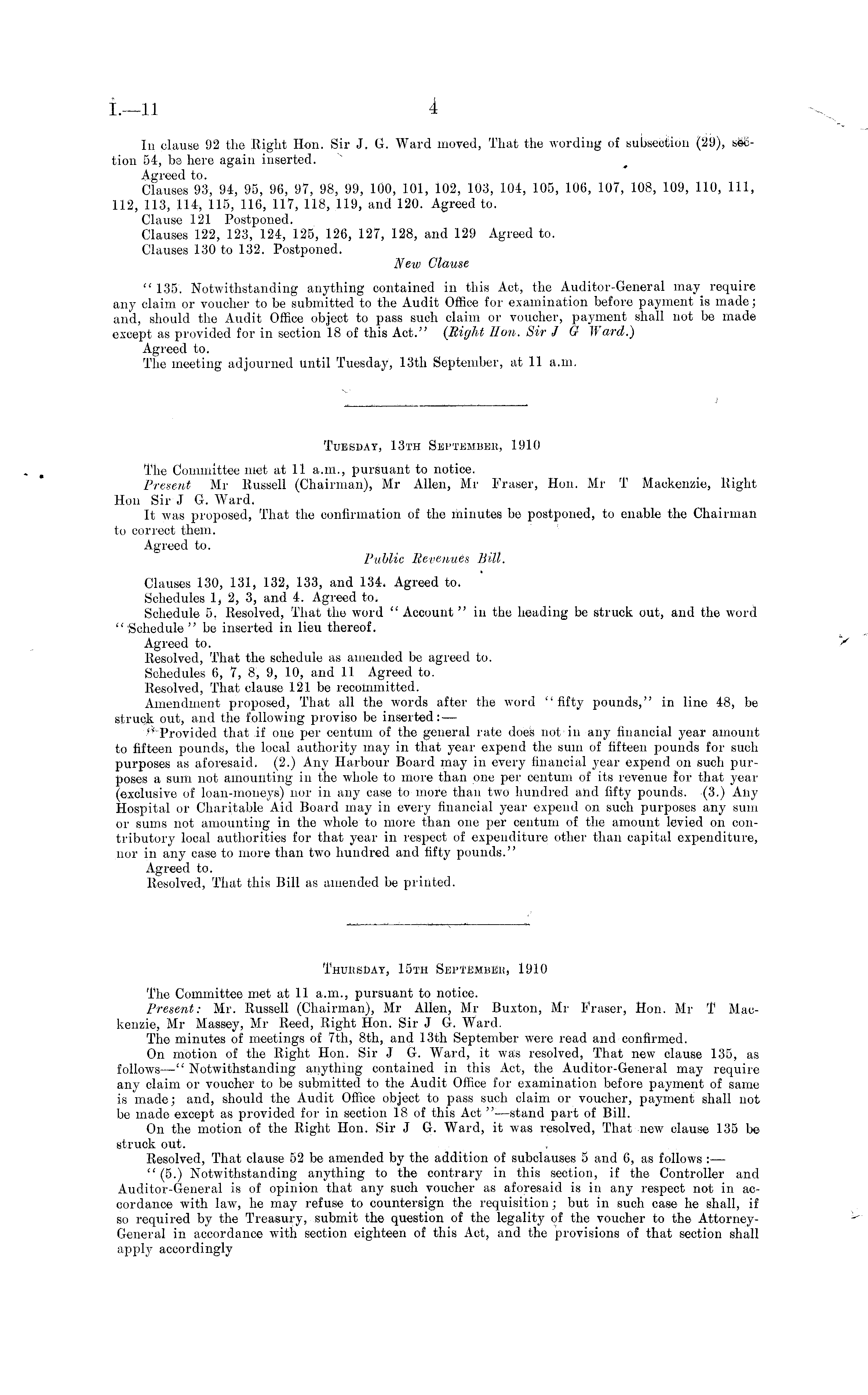 Tuesday, 13th September, 1910 The Committee met at 11 a.m., pursuant to notice. Present Mr Russell (Chairman), Mr Allen, Mr Fraser, Hon. Mr T Mackenzie, Eight Hon Sir J G. Ward. It was proposed, That the confirmation of the minutes be postponed, to enable the Chairman to correct them. Agreed to. Public Revenues Bill. Clauses 130, 131, 132, 133, and 134, Agreed to. Schedules 1, 2, 3, and 4. Agreed to. Schedule 5, Resolved, That the word " Account " in the heading be struck out, and the word "'Schedule " be inserted in lieu thereof. Agreed to. Eesolved, That the schedule as amended be agreed to. Schedules 6, 7, 8, 9, 10, and 11 Agreed to. Eesolved, That clause 121 be recommitted. Amendment proposed, That all the words after the word "fifty pounds," in line 48, be struck out, and the following proviso be inserted: — ■'Provided that if one per centum of the general rate does not in any financial year amount to fifteen pounds, the local authority may in that year expend the sum of fifteen pounds for such purposes as aforesaid. (2.) Any Harbour Board may in every financial year expend on such purposes a sum not amounting in the whole to more than one per centum of its revenue for that year (exclusive of loan-moneys) nor in any case to more than two hundred and fifty pounds. (3.) Any Hospital or Charitable Aid Board may in every financial year expend on such purposes any sum or sums not amounting in the whole to more than one per centum of the amount levied on contributory local authorities for that year in respect of expenditure other than capital expenditure, nor in any case to more than two hundred and fifty pounds." Agreed to. Eesolved, That this Bill as amended be printed.