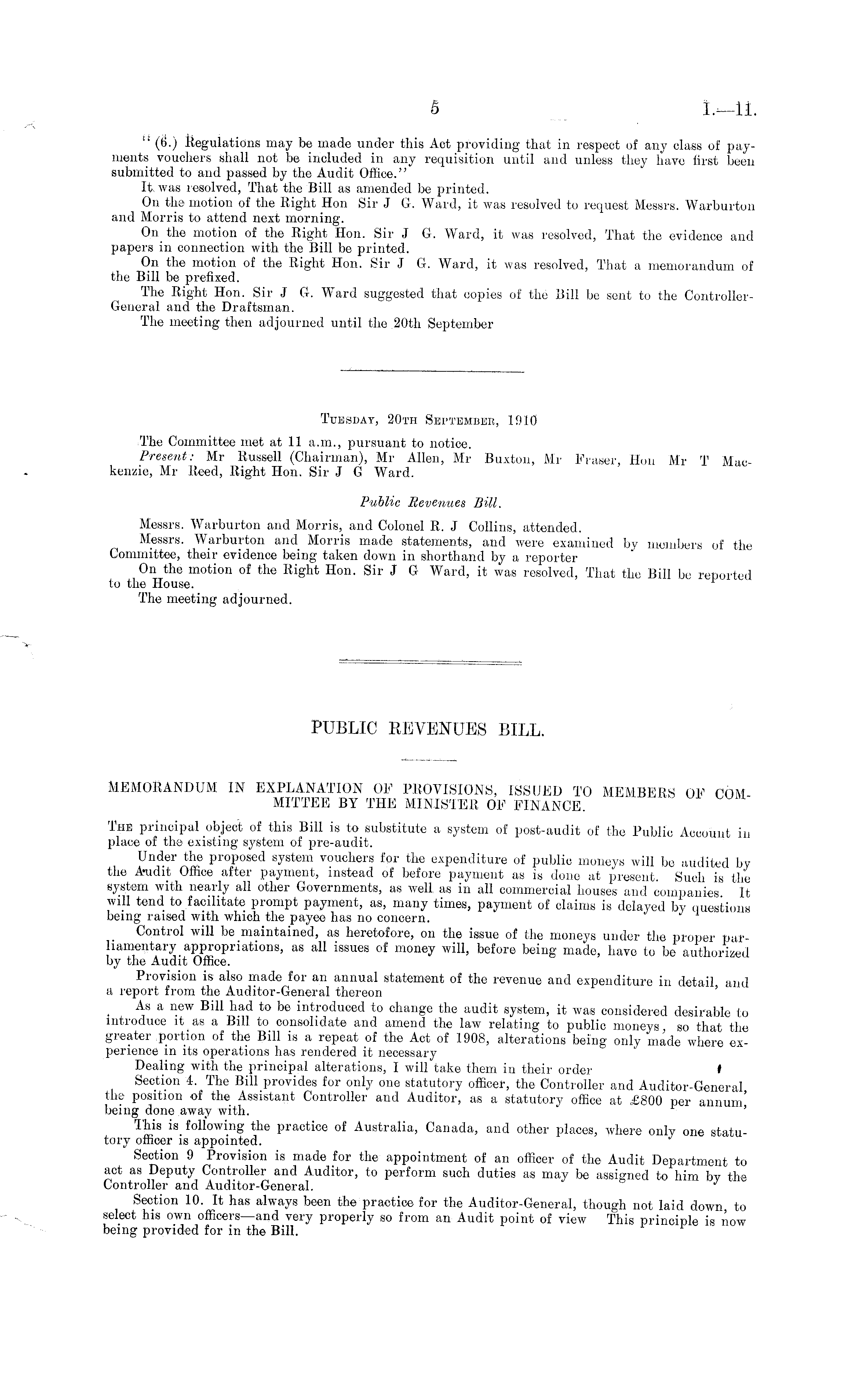 " (6.) Regulations may be made under this Act providing that in respect of any class of payments vouchers shall not be included in any requisition until and unless they have first been submitted to and passed by the Audit Office." It was resolved, That the Bill as amended be printed. On the motion of the Right Hon Sir J G. Ward, it was resolved to request Messrs. Warburton and Morris to attend next morning. On the motion of the Right Hon. Sir J G. Ward, it was resolved, That the evidence and papers in connection with the Bill be printed. On the motion of the Right Hon. Sir J G. Ward, it was resolved, That a memorandum of the Bill be prefixed. The Right Hon. Sir J G. Ward suggested that copies of the Bill be sent to the ControllerGeneral and the Draftsman. The meeting then adjourned until the 20th September