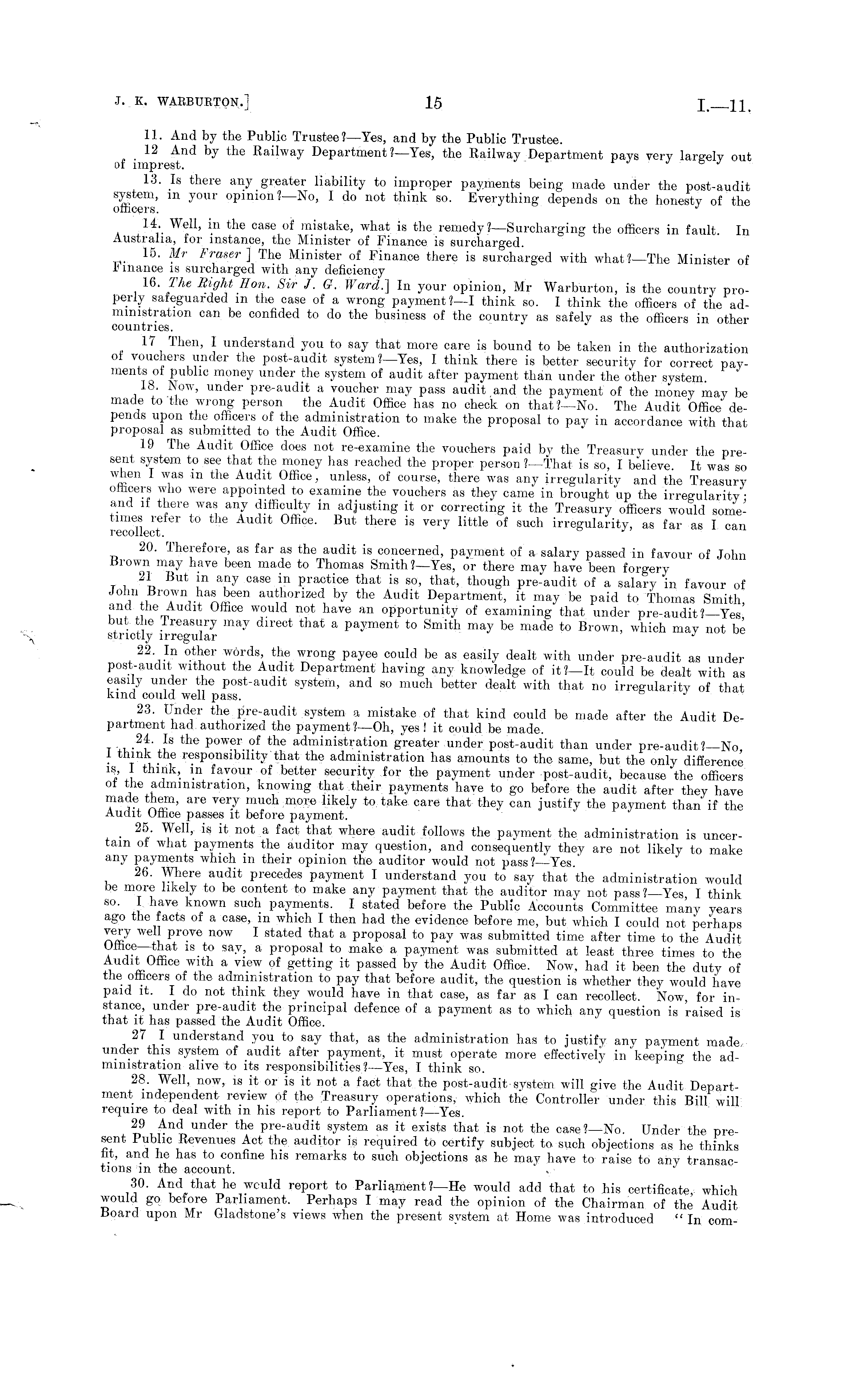 11. And by the Public Trustee ?—Yes, and by the Public Trustee. 12 And by the Railway Department ?—Yes, the Railway Department pays very largely out of imprest. J s J 13. Is there any greater liability to improper payments being made under the post-audit system, m your opinion ?—No, Ido not think so. Everything depends on the honesty of the officers. ' li. Well, in the case of mistake, what is the remedy?— Surcharging the officers in fault. In Australia, for instance, the Minister of Finance is surcharged. 15. Mr Fraser] The Minister of Finance there is surcharged with what?—The Minister of l< mance is surcharged with any deficiency 16. The Bight Hon. Sir J. G. Ward.} In your opinion, Mr Warburton, is the country properly safeguarded in the case of a wrong payment?—l think so. I think the officers of the administration can be confided to do the business of the country as safely as the officers in other countries. 17 Then, I understand you to say that more care is bound to be taken in the authorization of vouchers under the post-audit system ?—Yes, I think there is better security for correct payments ot public money under the system of audit after payment than under the other system 18. Now, under pre-audit a voucher may pass audit and the payment of the money may be made to the wrong person the Audit Office has no check on that?— No. The Audit Office depends upon the officers of the administration to make the proposal to pay in accordance with that proposal as submitted to the Audit Office. " 19 The Audit Office does not re-examine the vouchers paid by the Treasury under the present system to see that the money has reached the proper person ?—That is so, I believe It was so when I was in the Audit Office, unless, of course, there was any irregularity and the Treasury officers who were appointed to examine the vouchers as they came in brought up the irregularity"and if there was any difficulty in adjusting it or correcting it the Treasury officers would somerecoTlect 6 EU * " VeiT Httle ° f SU ° h irre g ularit y- as far as I can 20. Therefore, as far as the audit is concerned, payment of a salary passed in favour of John Brown may have been made to Thomas Smith?— Yes, or there may have been forgery 21 But in any case in practice that is so, that, though pre-audit of a salary in favour of John Brown has been authorized by the Audit Department, it may be paid to Thomas Smith, and the Audit Office would not have an opportunity of examining that under pre-audit?—Yes but the Treasury may direct that a payment to Smith may be made to Brown, which may not be strictly irregular 22. In other words, the wrong payee could be as easily dealt with under pre-audit as under post-audit without the Audit Department having any knowledge of it?—lt could be dealt with as easily under the post-audit system, and so much better dealt with that no irregularity of that kind could well pass. 23. Under the pre-audit system a mistake of that kind could be made after the Audit Department had authorized the payment?—Oh, yes'i it could be made. u,- 2 f' ? the P ° Wer ° f the administration greater under post-audit than under pre-audit ?—No • iv. res P onsi bility that the administration has amounts to the same, but the only difference lSj, I think, in favour of better security for the payment under post-audit, because the officers ot the administration, knowing that their payments have to go before the audit after they have made them, are very much more likely to. take care that they can justify the payment than if the Audit Office passes it before payment. . 25 : Well > is it; not a fact that where audit follows the payment the administration is uncertain ot what payments the auditor may question, and consequently they are not likely to make any payments which in their opinion the auditor would not pass?— Yes. 26. Where audit precedes payment I understand you to say that the administration would be more likely to be content to make any payment that the auditor may not pass?— Yes I think so. 1 have known such payments. I stated before the Public Accounts Committee many years ago the facts of a case, in which I then had the evidence before me, but which I could not perhaps very well prove now I stated that a proposal to pay was submitted time after time to the Audit a j 6 1S *° Say ' a P ro P osal to make a payment was submitted at least three times to the Audit Office with a view of getting it passed by the Audit Office. Now, had it been the duty of the officers of the administration to pay that before audit, the question is whether they would have paid it. I do not think they would have in that case, as far as I can recollect. Now, for instance, under pre-audit the principal defence of a payment as to which any question is raised is that it has passed the Audit Office. 27 I understand you to say that, as the administration has to justify any payment made under this system of audit after payment, it must operate more effectively in'keeping the administration alive to its responsibilities?— Yes, I think so. 28. Well, now, is it or is it not a fact that the post-audit system will give the Audit Department independent review of the Treasury operations, which the Controller under this Bill will require to deal with in his report to Parliament?— Yes. 29 And under the pre-audit system as it exists that is not the case?— No. Under the present Public Revenues Act the auditor is required to certify subject to such objections as he thinks fit, and he has to confine his remarks to such objections as he may have to raise to any transactions in the account. 30. And that he weuld report to Parliament?—He would add that to his certificate which would go before Parliament. Perhaps I may read the opinion of the Chairman of the Audit Board upon Mr Gladstone's views when the present system at Home was introduced "In com-