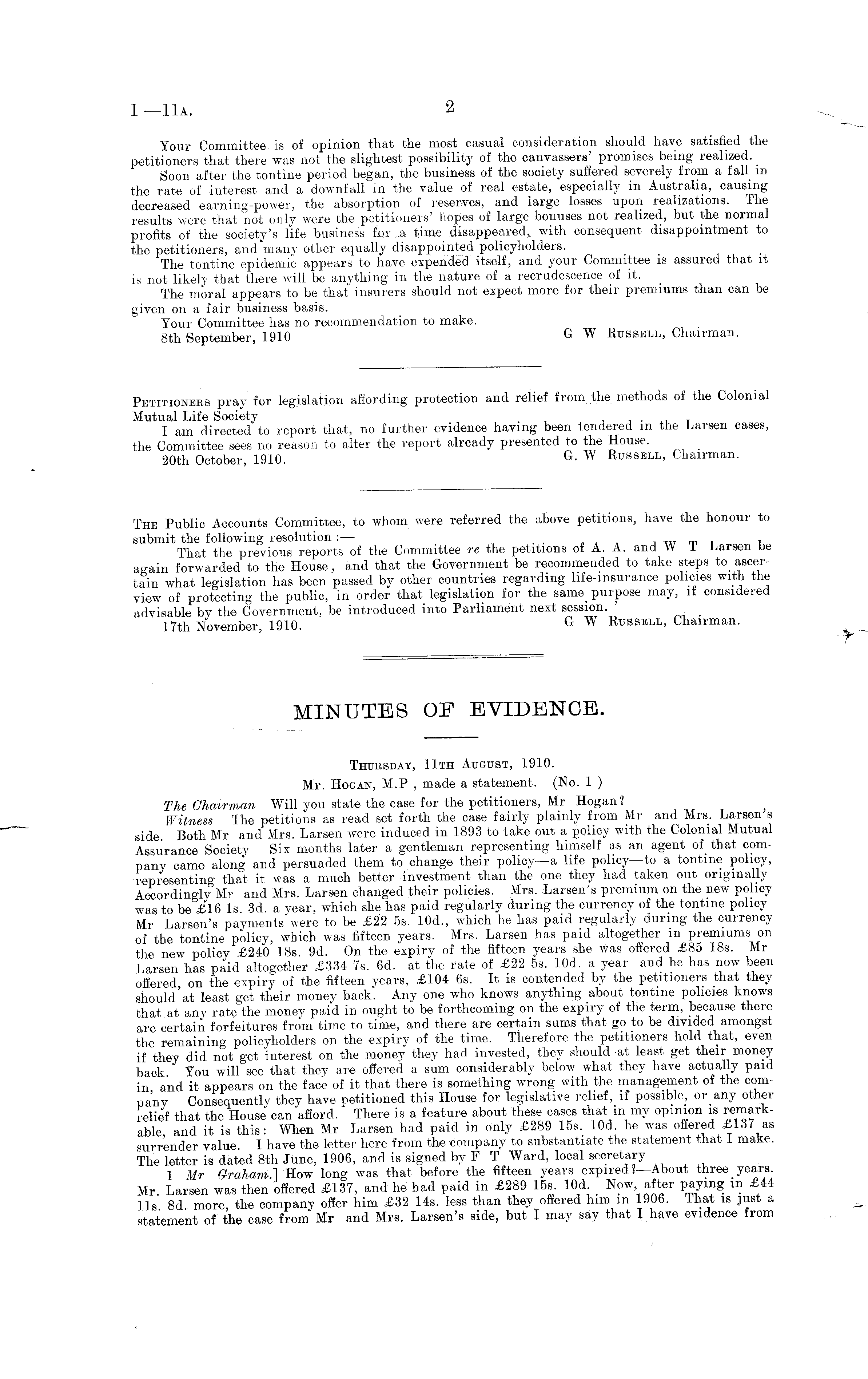 MINUTES OF EVIDENCE. Thursday, 11th August, 1910. Mr. Hogan, M.P , made a statement. (No. 1 ) The Chairman Will you state the case for the petitioners, Mr Hogan ? Witness The petitions as read set forth the case fairly plainly from Mr and Mrs. Larsen s side Both Mr and Mrs. Larsen were induced in 1893 to take out a policy with the Colonial Mutual Assurance Society Six months later a gentleman representing himself as an agent of that company came along and persuaded them to change their policy—a life policy—to a tontine policy, representing that it was a much better investment than the one they had taken out originally Accordingly Mr and Mrs. Larsen changed their policies. Mrs. Larseu's premium on the new policy was to be £16 Is 3d a year, which she has paid regularly during the currency of the tontine policy Mr Larsen's payments were to be £22 ss. 10d,, which he has paid regularly during the currency of the tontine policy, which was fifteen years. Mrs. Larsen has paid altogether in premiums on the new policy £240 18s 9d. On the expiry of the fifteen years she was offered £85 18s. Mr Larsen has paid altogether £334 7s. fid. at the rate of £22 ss. 10d. a year and he has now been offered on the expiry of the fifteen years, £104 6s. It is contended by the petitioners that they should'at least get their money back" Any one who knows anything about tontine policies knows that at any rate the money paid in ought to be forthcoming on the expiry of the term, because there •ire certain forfeitures from time to time, and there are certain sums that go to be divided amongst the remaining policyholders on the expiry of the time. Therefore the petitioners hold that, even if they did not get interest on the money they had invested, they should at least get their money back ' You will see that they are offered a sum considerably below what they have actually paid in and it appears on the face of it that there is something wrong with the management of the company Consequently they have petitioned this House for legislative relief, if possible, or any other relief that the House can afford. There is a feature about these cases that in my opinion is remarkable and it is this: When Mr Larsen had paid in only £289 15s. 10d. he was offered £137 as surrender value I have the letter here from the company to substantiate the statement that I make. The letter is dated Bth June, 1906, and is signed by F T Ward, local secretary 1 Mr Graham -1 How long was that before the fifteen years expired'—About three years. Mr Larsen was then offered £137, and he had paid in £289 15s. 10d. Now after paying m £44 11s 8d more, the company offer him £32 14s. less than they offered him in 1906. That is just a statement of the case from' Mr and Mrs. Larsen's side, but I may say that I have evidence from