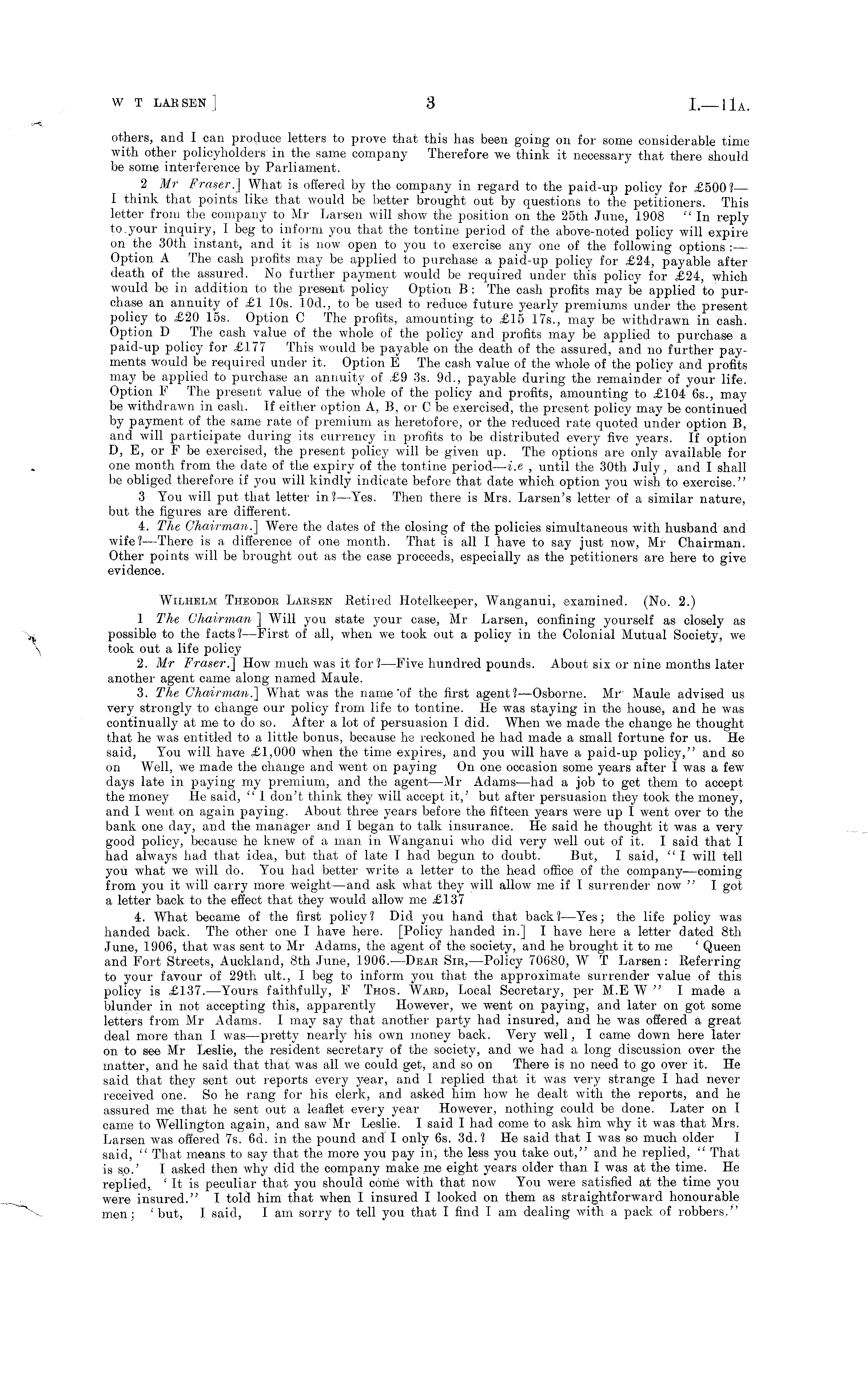 others, and I can produce letters to prove that this has been going on for some considerable time with other policyholders in the same company Therefore we think it necessary that there should be some interference by Parliament. 2 Mr Fraser.] What is offered by the company in regard to the paid-up policy for £500? I think that points like that would be better brought out by questions to the petitioners. This letter from the company to Mr Larsen will show the position' on the 25th June, 1908 "In reply to.your inquiry, I beg to inform you that the tontine period of the above-noted policy will expire on the 30th instant, and it is now open to you to exercise any one of the following options : Option A The cash profits may be applied to purchase a paid-up policy for =£24, payable after death of the assured. No further payment would be required under this policy for .£24, which would be in addition to the present policy Option B: The cash profits may be applied to purchase an annuity of £1 10s. 10d., to be used to reduce future yearly premiums under the present policy to £20 15s. Option C The profits, amounting to £15 175., may be withdrawn in cash. Option D The cash value of the whole of the policy and profits may be applied to purchase a paid-up policy for £177 This would be payable on the death of the assured, and no further payments would be required under it. Option E The cash value of the whole of the policy and profits may be applied to purchase an annuity of £9 3s. 9d., payable during the remainder of your life. Option F The present value of the whole of the policy and profits, amounting to £104 65., may be withdrawn in cash. If either option A, B, or Cbe exercised, the present policy may be continued by payment of the same rate of premium as heretofore, or the reduced rate quoted under option B, and will participate during its currency in profits to be distributed every five years. If option D, E, or Fbe exercised, the present policy will be given up. The options are only available for one month from the date of the expiry of the tontine period— i.c , until the 30th July, and I shall be obliged therefore if you will kindly indicate before that date which option you wish to exercise." 3 You will put that letter in? —Yes. Then there is Mrs. Larsen's letter of a similar nature, but the figures are different. 4. The Chairman.] Were the dates of the closing of the policies simultaneous with husband and wife? —There is a difference of one month. That is all I have to say just now, Mr Chairman. Other points will be brought out as the case proceeds, especially as the petitioners are here to give evidence. Wilhelm Thkodor Laesen Retired Hotelkeeper, Wanganui, examined. (No. 2.) 1 The Chairman ] Will you state your case, Mr Larsen, confining yourself as closely as possible to the facts? —First of all, when we took out a policy in the Colonial Mutual Society, we took out a life policy 2. Mr Fraser.] How much was it for ?—Five hundred pounds. About six or nine months later another agent came along named Maule. 3. The Chairman.] What was the name'of the first agent?—Osborne. Mi , Maule advised us very strongly to change our policy from life to tontine. He was staying in the house, and he was continually at me to do so. After a lot of persuasion I did. When we made the change he thought that he was entitled to a little bonus, because he reckoned he had made a small fortune for us. He said, You will have £1,000 when the time expires, and you will have a paid-up policy," and so on Well, we made the change and went on paying On one occasion some years after I was a few days late in paying my premium, and the agent —Mr Adams —had a job to get them to accept the money He said, " 1 don't think they will accept it,' but after persuasion they took the money, and I went on again paying. About three years before the fifteen years were up I went over to the bank one day, and the manager and I began to talk insurance. He said he thought it was a very good policy, because he knew of a man in Wanganui who did very well out of it. I said that I had always had that idea, but that of late I had begun to doubt. But, I said, " I will tell you what we will do. You had better write a letter to the head office of the company —coming from you it will carry more weight —and ask what they will allow me if I surrender now " I got a letter back to the effect that they would allow me £137 4. What became of the first policy? Did you hand that back?— Yes; the life policy was handed back. The other one I have here. [Policy handed in.] I have here a letter dated Bth June, 1906, that was sent to Mr Adams, the agent of the society, and he brought it to me ' Queen and Fort Streets, Auckland, Bth June, 1906. —Dear Sir, —Policy 70680, W T Larsen: Referring to your favour of 29th ult., I beg to inform you that the approximate surrender value of this policy is £137. —Yours faithfully, F Thos. Ward, Local Secretary, per M.E W " I made a blunder in not accepting this, apparently However, we went on paying, and later on got some letters from Mr Adams. I may say that another party had insured, and he was offered a great deal more than I was —pretty nearly his own money back. Very well, I came down here later on to see Mr Leslie, the resident secretary of the society, and we had a long discussion over the matter, and he said that that was all we could get, and so on There is no need to go over it. He said that they sent out reports every j r ear, and I replied that it was very strange I had never received one. So he rang for his clerk, and asked him how he dealt with the reports, and he assured me that he sent out a leaflet every year However, nothing could be done. Later on I came to Wellington again, and saw Mr Leslie. I said I had come to ask him why it was that Mrs. Larsen was offered 7s. 6d. in the pound and I only 6s. 3d. 1 He said that I was so much older I said, " That means to say that the 