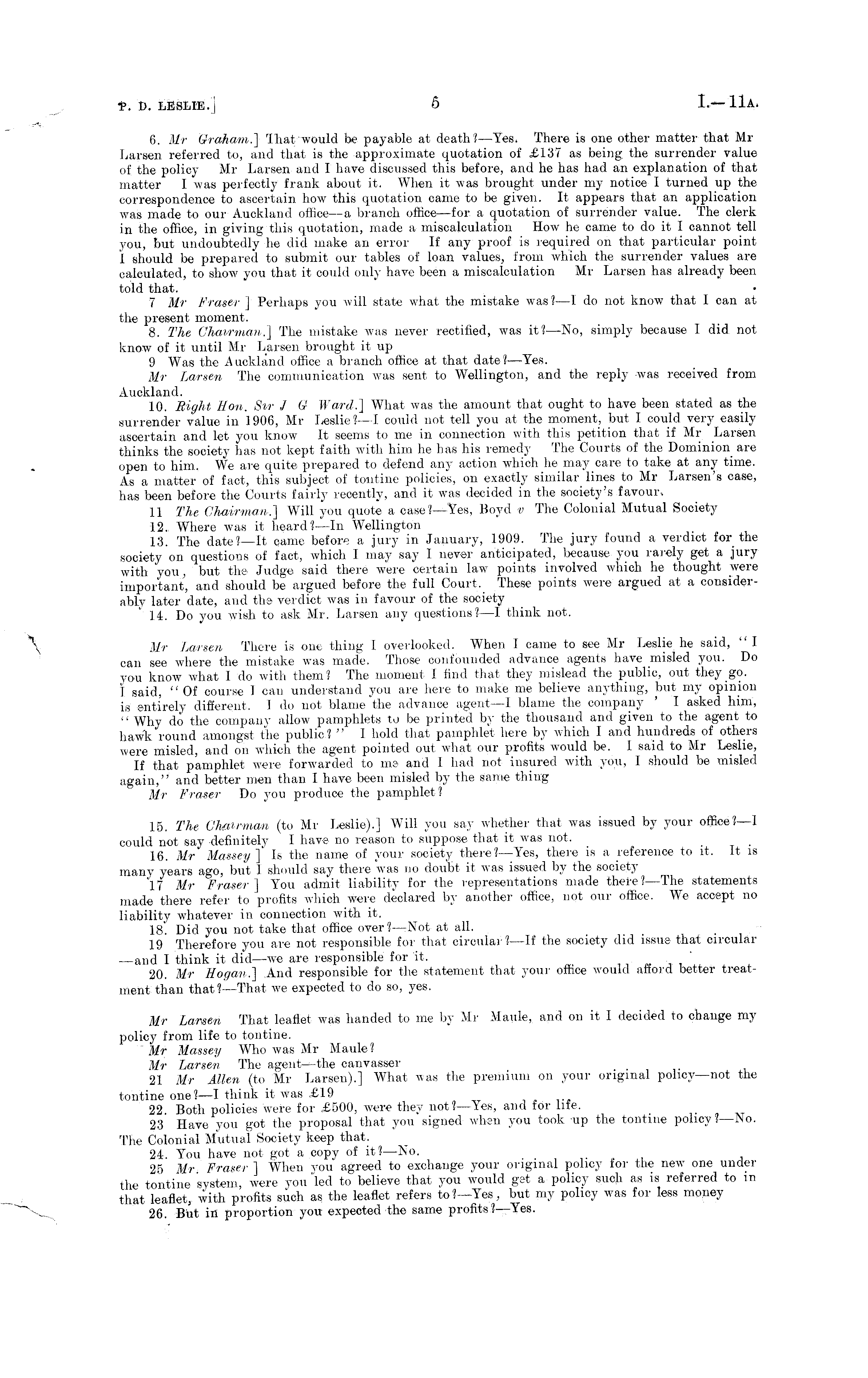 6. Mr Graham.] That would be payable at death? —Yes, There is one other matter that Mr Larsen referred to, and that is the approximate quotation of £137 as being the surrender value of the policy Mr Larsen and I have discussed this before, and he has had an explanation of that matter I was perfectly frank about it. When it was brought under my notice I turned up the correspondence to ascertain how this quotation came to be given. It appears that an application was made to our Auckland office —a branch office —for a quotation of surrender value. The clerk in the office, in giving this quotation, made a miscalculation How he came to do it I cannot tell you, but undoubtedly lie did make an error If any proof is required on that particular point 1 should be prepared to submit our tables of loan values, from which the surrender values are calculated, to show you that it could only have been a miscalculation Mr Larsen has already been told that. 7 Mr Fraser ] Perhaps you will state what the mistake w T as?—l do not know that I can at the present moment. 8. The Chairman.'] The mistake was never rectified, was it?—No, simply because I did not know of it until Mr Larsen brought it up 9 Was the Auckland office a branch office at that date?— Yes. Mr Larsen The communication was sent to Wellington, and the reply was received from Auckland. 10. Bight Eon. Sir J G Ward.] What was the amount that ought to have been stated as the surrender value in 1906, Mr Leslie I—l1 —I could not tell you at the moment, but I could very easily ascertain and let you know It seems to me in connection with this petition that if Mr Larsen thinks the society has not kept faith witli him he has his remedy The Courts of the Dominion are open to him.. We are quite prepared to defend any action which lie may care to take at any time. As a matter of fact, this subject of tontine policies, on exactly similar lines to Mr Larsen's case, has been before the Courts fairly recently, and it was decided in the society's favour, 11 The Chairman.] Will you quote a case?— Yes, Boyd v The Colonial Mutual Society 12. Where was it heard?—ln Wellington 13. The date? —It came before a jury in January, 1909. The jury found a verdict for the society on questions of fact, which 1 may say 1 never anticipated, because you rarely get a jury with you , but the Judge said there were certain law points involved which he thought were important, and should be argued before the full Court. These points were argued at a considerably later date, and the verdict was in favour of the society 14. Do you wish to ask Mr. Larsen any questions? —1 think not. Mr Larsen. There is one thing 1 overlooked. When I came to see Mr Leslie he said, "I can see where the mistake was made. Those confounded advance agents have misled you. Do you know what 1 do with them? The moment I find that they mislead the public, out they go. I said, "Of course 1 can understand you are here to make me believe anything, but my opinion is entirely different. I do not blame "the advance agent—l blame the company ' I asked him, " Why do the company allow pamphlets to be printed by the thousand and given to the agent to hawk round amongst the public? " I hold that pamphlet here by which I and hundreds of others were misled, and on which the agent pointed out what our profits would be. 1 said to Mr Leslie, If that pamphlet were forwarded to me and I had not insured with you, I should be misled again," and better men than I have been misled by the same thing Mr Fraser Do you produce the pamphlet? 15. The Chairman (to Mr Leslie).] Will you say whether that was issued by your office? —I could not say definitely I have no reason to suppose that it was not. 16. Mr' Massey] Is the name of your society there?— Yes, there is a reference to it. It is many years ago, but 1 should say there was no doubt it was issued by the society 17 Mr Fraser] You admit liability for the representations made there? —The statements made there refer to profits which were declared by another office, not our office. We accept no liability whatever in connection with it. 18. Did you not take that office over?— Not at all. 19 Therefore you are not responsible for that circular?—lf the society did issue that circular —and I think it did—we are responsible for it, 20. Mr Hogan.] And responsible for the statement that your office would afford better treatment than that? —That we expected to do so, yes. Mr Lamen That leaflet was handed to me by Mr Maule, and on it I decided to change my policy from life to tontine. Mr Massey Who was Mr Maule? Mr Larsen The agent —the canvasser 21 Mr Allen (to Mr Larsen).] What was the premium on your original policy—not the tontine one?—l think it was .£l9 22 Both policies were for £500, were they not?— Yes, and for life. 23 Have you got the proposal that you signed when you took up the tontine policy?— No. The Colonial Mutual Society keep that. 24 You have not got a copy of it?— No. 25 Mr Fraser ] When you agreed to exchange your original policy for the new one under the tontine system, were you "led to believe that you would gat a policy such as is referred to in that leaflet, with profits such as the leaflet refers to?— Yes , but my policy was for less money 26. But in proportion you expected the same profits?— Yes.