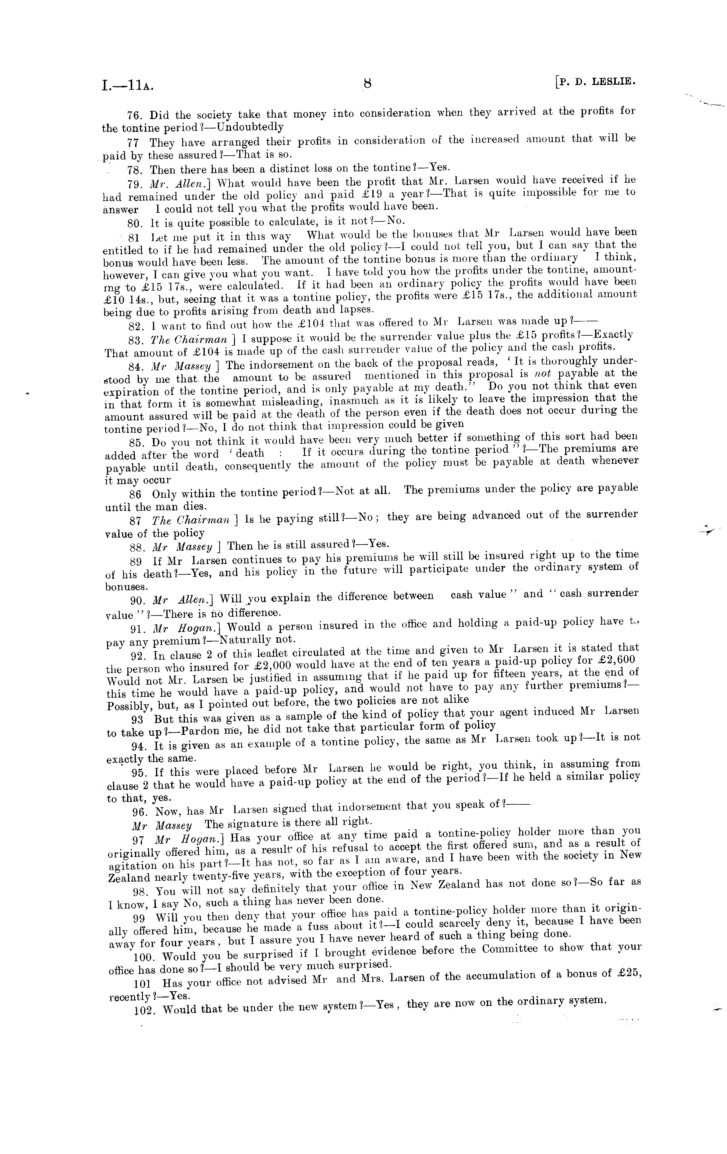 76. Did the society take that money into consideration when they arrived at the profits for the tontine period ?—Undoubtedly 77 They have arranged their profits in consideration of the increased amount that will be paid by these assured? —That is so. 78. Then there has been a distinct loss on the tontine? —Yes. 79 Mr Allen,] What would have been the profit that Mr. Larsen would have received if he had remained under the old policy and paid £19 a year?— That is quite impossible for me to answer I could not tell you what the profits would have been. 80. It is quite possible to calculate, is it not? —No. 81 Let me put it in this way What would be the bonuses that Mr Larsen would have been entitled to if he had remained under the old policy?—! could not tell you, but I can say that the bonus would have been less. The amount of the tontine bonus is more than the ordinary J think, however I can give you what you want. 1 have told you how the profits under the tontine, amounting to £15 17s , were calculated. If it had been an ordinary policy the profits would have been £10 145., but, seeing that it was a tontine policy, the profits were £15 175., the additional amount being due to profits arising from death and lapses. 82. I want to find out how the £104 that was offered to Mr Larsen was made up? 83' The Chairman ] I suppose it would be the surrender value plus the £15 profits ?—Exactly That amount of £104 is made up of the cash surrender value of the policy and the cash profits. 84 Mr Massey 1 The indorsement on the back of the proposal reads, 'It is thoroughly understood by me that the amount to be assured mentioned in this proposal is not payable at the expiration of the tontine period, and is only payable at my death." Do you not think that even in that form it is somewhat misleading, inasmuch as it is likely to leave the impression that the amount assured will be paid at the death of the person even if the death does not occur during the tontine period t— No, Ido not think thai impression could be given 85 Do you not think it would have been very much better if something of this sort had been added after the word ' death : If it occurs during the tontine period "J— The premiums are payable until death, consequently the amount of the policy must be payable at death whenever it may occur , 86 Only within the tontine period?— Not at all. The premiums under the policy are payable until the man dies. 87 The Chairman ] Is he paying still?— No ; they are being advanced out of the surrender value of the policy 88 Mr Massey j Then he is still assured ?—Yes. 89' If Mr Larsen continues to pay his premiums he will still be insured right up to the time of his death?— Yes, and his policy in the future will participate under the ordinary system of bonuses. ~ , ~ , , 90. Mr Allen.] Will you explain the difference between cash value and cash surrender value "?—There is no difference. 91. Mr Uogan.] Would a person insured in the office and holding a paid-up policy have t> pay any premium? —Naturally not. 92 In clause 2 of this leaflet circulated at the time and given to Mr Larsen it is stated that the Derson who insured for £2,000 would have at the end of ten years a paid-up policy for £2,600 Would not Mr Larsen be justified in assuming that if he paid up for fifteen years, at the end of tMs time he would have a paid-up policy, and would not have to pay any further premiums ?- Possibly, but, as I pointed out before, the two policies are not alike 93 But this /as given as a sample of the kind of policy that your agent induced Mr Larsen to take up?— Pardon me, he did not take that particular form of policy 9I It is given as an example of a tontine policy, the same as Mr Larsen took up J-It is not exactly the «c . a ing f m clause 2 that he SdCa paid-up policy at the end of the period ?-If he held a similar policy to that, yes. . , », 96. Now, has Mr Larsen signed that indorsement that you speak of I Mr Massey The signature is there all right. Q7 Mr Loan.] Has your office at any time paid a tontine-policy holder more than you I irnnw I «ay No such a thing has never been done. Z' Will you then deny that your office has paid a tontine-policy holder more than it origin"CO Would ,ou be »rp3 if 1 brought evidence Wore .he Commit*, to ,ho,v that your office has done so ?—1 should be very much surprised. 101 Ha! your office not advised Mr and Mrs. Larsen of the accumulation of a bonus of £25, reCen m that be under the new system?-Yes, they are now on the ordinary system.