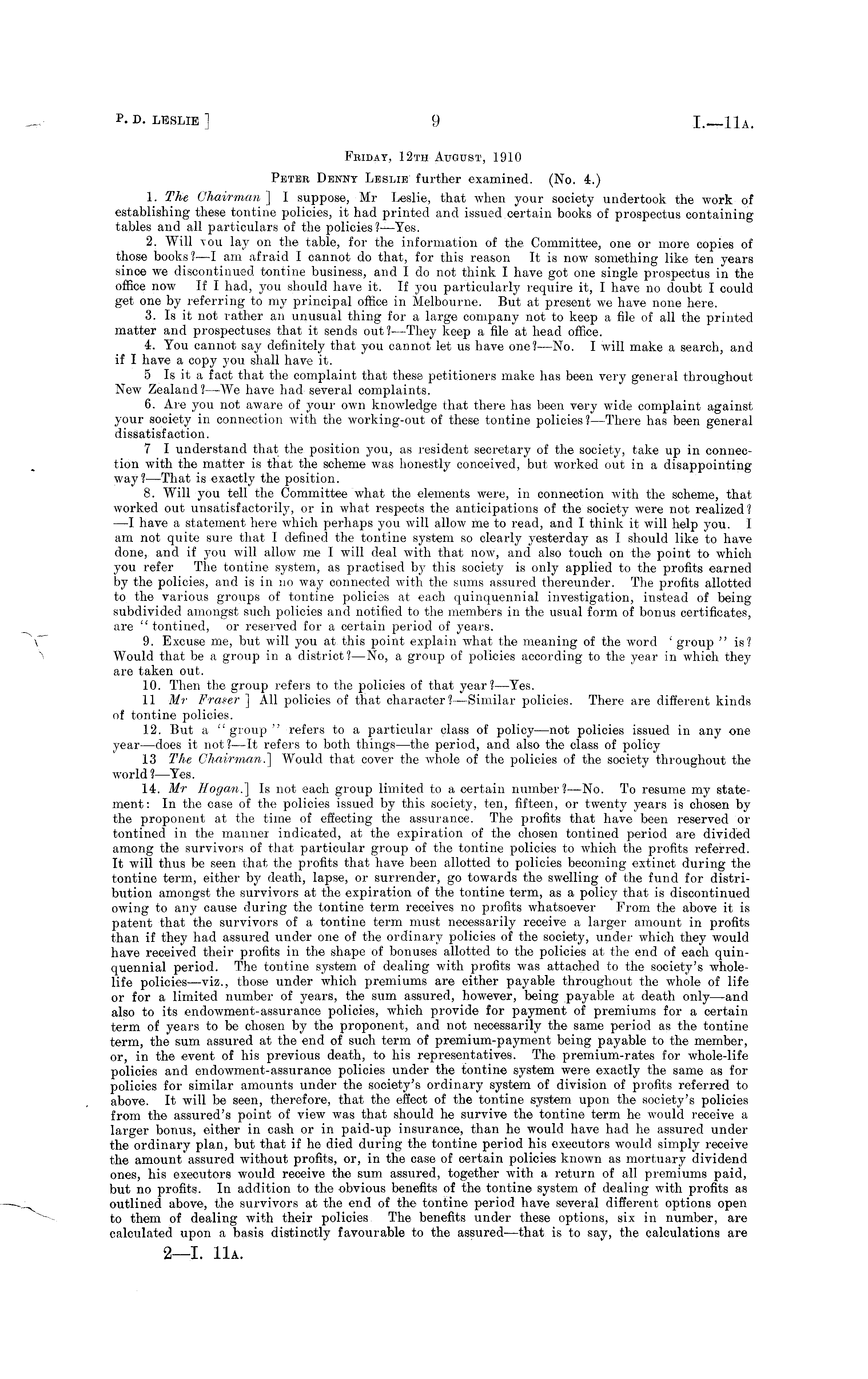 Friday, 12th August, 1910 Peter Denny Leslie further examined. (No. 4.) 1. The Chairman} I suppose, Mr Leslie, that when your society undertook the work of establishing these tontine policies, it had printed and issued certain books of prospectus containing tables and all particulars of the policies?— Yes. 2. Will \ou lay on the table, for the information of the Committee, one or more copies of those books?—l am afraid I cannot do that, for this reason It is now something like ten years since we discontinued tontine business, and I do not think I have got one single prospectus in the office now If I had, you should have it. If you particularly require it, I have no doubt I could get one by referring to my principal office in Melbourne. But at present we have none here. 3. Is it not rather an unusual thing for a large company not to keep a file of all the printed matter and prospectuses that it sends out ?—They keep a file at head office. 4. You cannot say definitely that you cannot let us have one? —No. I will make a search, and if I have a copy you shall have it. 5 Is it a fact that the complaint that these petitioners make has been very general throughout New Zealand?—We have had several complaints. 6. Are you not aware of your own knowledge that there has been very wide complaint against your society in connection with the working-out of these tontine policies?— There has been general dissatisfaction. 7 I understand that the position you, as resident secretary of the society, take up in connection with the matter is that the scheme was honestly conceived, but worked out in a disappointing way?— That is exactly the position. 8. Will you tell the Committee what the elements were, in connection with the scheme, that worked out unsatisfactorily, or in what respects the anticipations of the society were not realized? —I have a statement here which perhaps you will allow me to read, and I think it will help you. 1 am not quite sure that I defined the tontine system so clearly yesterday as 1 should like to have done, and if 3-011 will allow me I will deal with that now, and also touch on the point to which you refer The tontine system, as practised bj r this society is only applied to the profits earned by the policies, and is in no way connected with the sums assured thereunder. The profits allotted to the various groups of tontine policies at each quinquennial investigation, instead of being subdivided amongst such policies and notified to the members in the usual form of bonus certificates, are " tontined, or reserved for a certain period of years. 9. Excuse me, but will you at this point explain what the meaning of the word ' group " is? Would that be a group in a district? —No, a group of policies according to the year in which they are taken out. 10. Then the group refers to the policies of that year?— Yes. 11 Mr V rater ] All policies of that character?— Similar policies. There are different kinds of tontine policies. 12. But a " group " refers to a particular class of policy —not policies issued in any one year —does it not ?—lt refers to both things —the period, and also the class of policy 13 The Chairman.'] Would that cover the whole of the policies of the society throughout the world?— Yes. 14. Mr Hogan.] Is not each group limited to a certain number? —No. To resume my statement: In the case of the policies issued by this society, ten, fifteen, or twenty years is chosen by the proponent at the time of effecting the assurance. The profits that have been reserved or tontined in the manner indicated, at the expiration of the chosen tontined period are divided among the survivors of that particular group of the tontine policies to which the profits referred. It will thus be seen that the profits that have been allotted to policies becoming extinct during the tontine term, either by death, lapse, or surrender, go towards the swelling of the fund for distribution amongst the survivors at the expiration of the tontine term, as a policy that is discontinued owing to any cause during the tontine term receives no profits whatsoever From the above it is patent that the survivors of a tontine term must necessarily receive a larger amount in profits than if they had assured under one of the ordinary policies of the society, under which they would have received their profits in the shape of bonuses allotted to the policies at the end of each quinquennial period. The tontine system of dealing with profits was attached to the society's wholelife policies—viz., those under which premiums are either payable throughout the whole of life or for a limited number of years, the sum assured, however, being payable at death only—and also to its endowment-assurance policies, which provide for payment of premiums for a certain term of years to be chosen by the proponent, and not necessarily the same period as the tontine term, the sum assured at the end of such term of premium-payment being payable to the member, or, in the event of his previous death, to his representatives. The premium-rates for whole-life policies and endowment-assurance policies under the tontine system were exactly the same as for policies for similar amounts under the society's ordinary system of division of profits referred to above. It will be seen, therefore, that the effect of the tontine system upon the society's policies from the assured's point of view was that should he survive the tontine term he would receive a larger bonus, either in cash or in paid-up insurance, than he would have had he assured under the ordinary plan, but that if he died during the tontine period his executors would simply receive the amount assured without profits, or, in the case of certain policies known as mortuary dividend ones, his executors would receive the sum assured, together with a return of all premiums paid, but no profits. In addition to the obvious benefits of the tontine system of dealing with profi