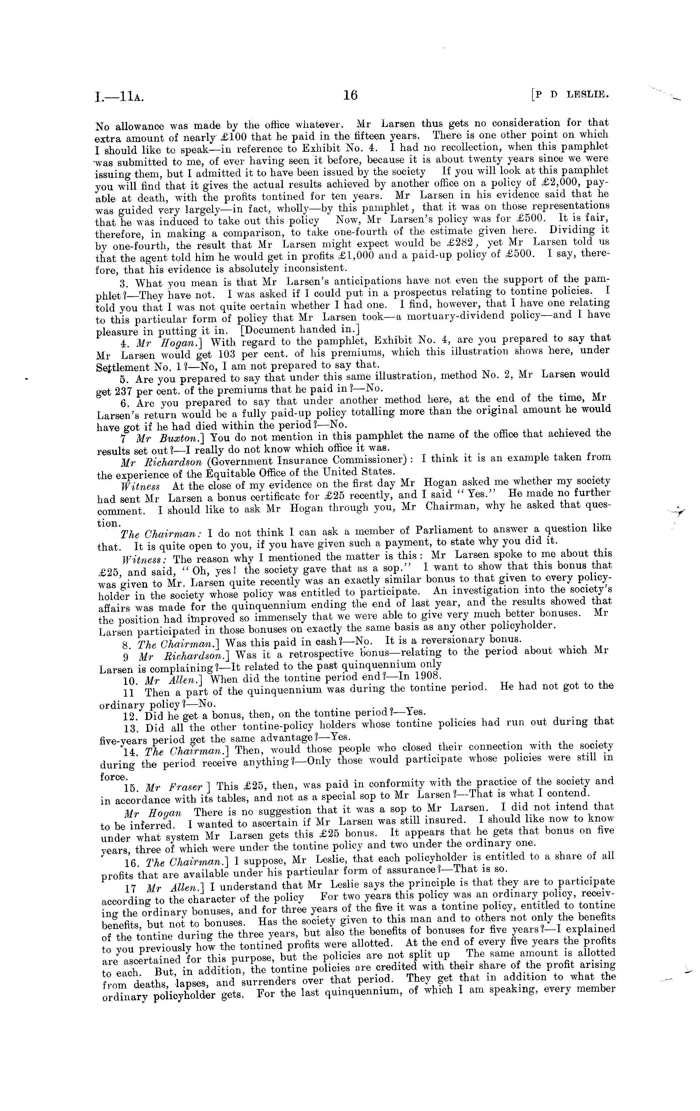 No allowance was made by the office whatever. Mr Larsen thus gets no consideration for that extra amount of nearly £100 that he paid in the fifteen years. There is one other point on which I should like to speak —in reference to Exhibit No. 4. I had no recollection, when this pamphlet ■was submitted to me, of ever having seen it before, because it is about twenty years since we were issuing them, but I admitted it to have been issued by the society If you will look at this pamphlet you will find that it gives the actual results achieved by another office on a policy of £2,000, payable at death, with the profits tontined for ten years. Mr Larsen in his evidence said that he was guided very largely—in fact, wholly—by this pamphlet, that it was on those representations that he was induced to take out this policy Now, Mr Larsen's policy was for £500. It is fair, therefore, in making a comparison, to take one-fourth of the estimate given here. Dividing it by one-fourth, the result that Mr Larsen might expect would be £282 , yet Mr Larsen told us that the agent told him he would get in profits £1,000 and a paid-up policy of £500. I say, therefore, that his evidence is absolutely inconsistent. 3. What you mean is that Mr Larsen's anticipations have not even the support of the pamphlet?'—They have not. I was asked if I could put in a prospectus relating to tontine policies. I told you that I was not quite certain whether I had one. I find, however, that I have one relating to this particular form of policy that Mr Larsen took—a mortuary-dividend policy—and I have pleasure in putting it in. [Document handed in.] 4 Mr Hogan.] With regard to the pamphlet, Exhibit No. 4, are you prepared to say that Mr Larsen would get 103 per cent, of his premiums, which this illustration shows here, under Settlement No. 1?— No, lam not prepared to say that. 5. Are you prepared to say that under this same illustration, method No. 2, Mr Larsen would get 237 per cent, of the premiums that he paid in ?—No. , , , ,• „ 6 Are you prepared to say that under another method here, at the end of the time, Mr Larsen's return would be a fully paid-up policy totalling more than the original amount he would have got if he had died within the period I —No. 7 Mr Buxton.] You do not mention in this pamphlet the name ot the office that achieved the results set out?—l really do not know which office it was. Mr Bichardson (Government Insurance Commissioner) : I think it is an example taken from the experience of the Equitable Office of the United States. Witness At the close of my evidence on the first day Mr Hogan asked me whether my society had sent Mr Larsen a bonus certificate for £25 recently, and I said " Yes.'' He made no further comment. I should like to ask Mr Hogan through you, Mr Chairman, why he asked that ques>n 'The Chairman: Ido not think I can ask a member of Parliament to answer a question like that It is quite open to you, if you have given such a payment, to state why you did it. Witness ■ The reason why I mentioned the matter is this : Mr Larsen spoke to me about this £25 and said " Oh, yes! the society gave that as a sop." I want to show that this bonus that was given to Mr. Larsen quite recently was an exactly similar bonus to that given to every policyholder in the society whose policy was entitled to participate. An investigation into the society b affairs was made for the quinquennium ending the end of last year, and the results showed that the position had improved so immensely that we were able to give very much better bonuses. Mr Larsen participated in those bonuses on exactly the same basis as any other policyholder. 8 The Chairman.] Was this paid in cash?— No. It is a reversionary bonus. 9' Mr Bichardson.] Was it a retrospective bonus—relating to the period about which Mr Larsen is complaining J— lt related to the past quinquennium only 10 Mr Allen.] When did the tontine period end /—ln 1908. ll' Then a part of the quinquennium was during the tontine period. He had not got to the ordinary policy? —No. , , 12 Did he get a bonus, then, on the tontine period <—Xes. 13. Did all the other tontine-policy holders whose tontine policies had run out during that five-years period get the same advantage? —Yes. _ ..,.,. • j. 14 The Chairman 1 Then, would those people who closed their connection with the society during'the period receive anything ?—Only those would participate whose policies were still m f ° rCe is Mr Fraser ] This £25, then, was paid in conformity with the practice of the society and in accordance with its tables, and not as a special sop to Mr Larsen I—That is what I contend Mr Hogan There is no suggestion that it was a sop to Mr Larsen. I did not intend that to be inferred. I wanted to ascertain if Mr Larsen was still insured. I should like now to know under what system Mr Larsen gets this £25 bonus. It appears that he gets that bonus on five years three of which were under the tontine policy and two under the ordinary one. 16 The Chairman;] I suppose, Mr Leslie, that each policyholder is entitled to a share of all profits that are available under his particular form of assurance I—That is so 17 Mr Allen 1 I understand that Mr Leslie says the principle is that they are to participate according to the character of the policy For two years this policy was an ordinary policy, receivh7 he ordinary bonuses, and for three years of the five it was a tontine policy, entitled to tontine benefits bu not to bonuses. Has the society given to this man and to others not only the benefits of The tontine during the three years, but also the benefits of bonuses or five years ?-I explained to v7u previously how the tontined profits were allotted. At the end of every five years the profits are ascertained for this purpose, but the policies are not split up The same amount is allotted to each! But in addition, the tontine policies are credited with their shar