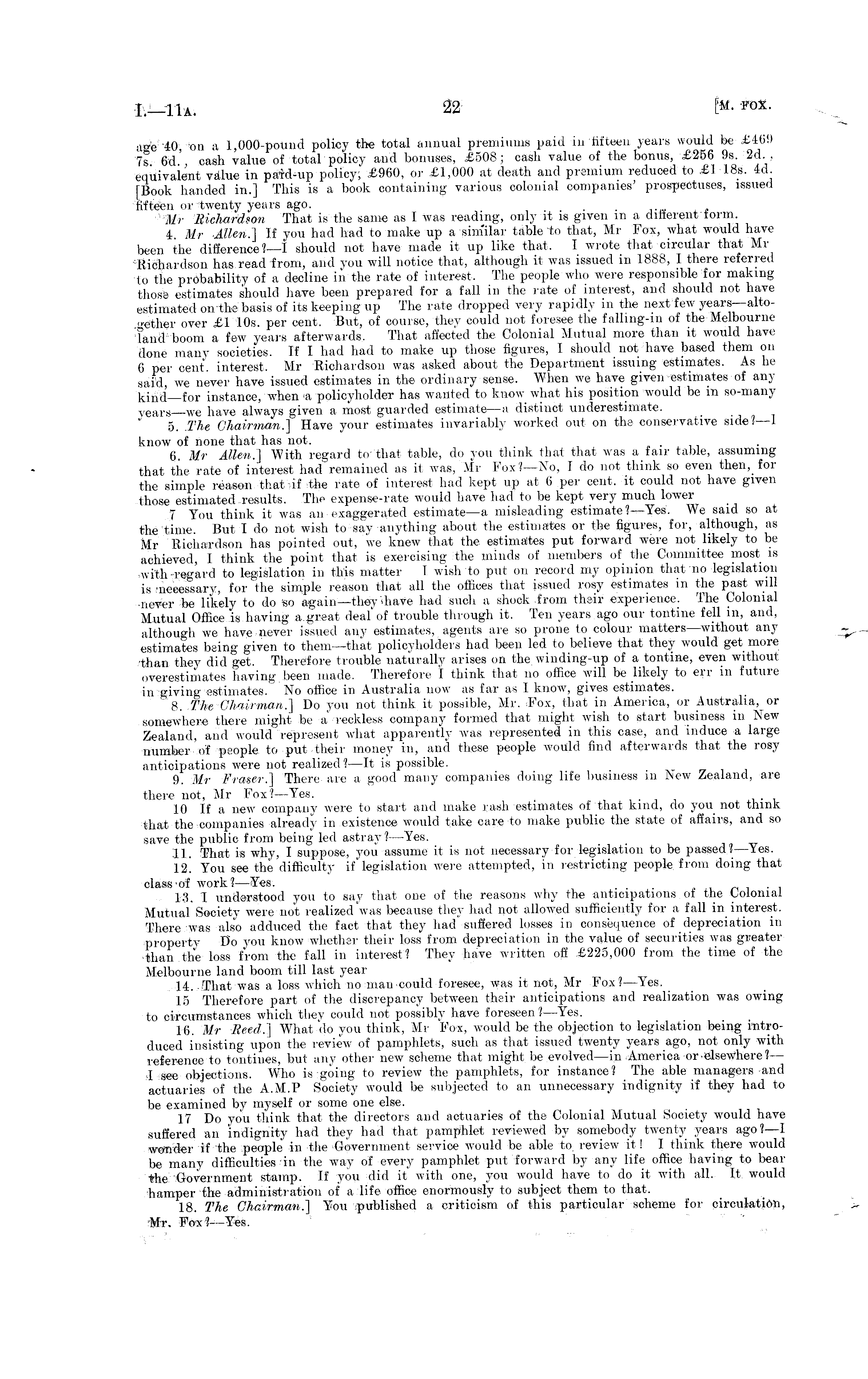 ■ige 40 on a 1,000-pound policy the total annual premiums paid in fifteen years would be £469 7s 6d' cash value of total policy and bonuses, £508; cash value of the bonus, £256 9s. 2d. . equivalent value in paid-up policy; £960, or £1,000 at death and premium reduced to £J 18s. 4d [Book handed in.] This is a book containing various colonial companies' prospectuses, issued fifteen or twenty years ago. . Mr Richardson That is the same as I was reading, only it is given in a ditierent lorm. 4. Mr Allen.] If you had had to make up a similar table to that, Mr Fox, what would have been the difference? —I should not have made it up like that. I wrote that circular that Mr Richardson has read from, and you will notice that, although it was issued in 1888, I there referred to the probability of a decline in the rate of interest. The people who were responsible for making those estimates should have been prepared for a fall in the rate of interest, and should not have estimated on the basis of its keeping up The rate dropped very rapidly in the next few years—altogether over £1 10s. per cent. But, of course, they could not foresee the fallmg-m of the Melbourne land boom a few years afterwards. That affected the Colonial Mutual more than it would have done many societies. If I had had to make up those figures, I should not have based them on 6 per cent, interest. Mr Richardson was asked about the Department issuing estimates. As he said, we never have issued estimates in the ordinary sense. When we have given estimates of any kind—for instance, when a policyholder has wanted to know what his position would be in go-many ~e arß_ we have always given a most guarded estimate—a distinct underestimate. 5. The Chairman.] Have your estimates invariably worked out on the conservative side? —1 know of none that has not. 6. Mr Allen.) With regard to that table, do you think that that was a fair table, assuming that the rate of interest had remained as il was, Mr Fox?—No, Ido not think so even then, for the simple reason that if the rate of interest had kept up at 6 per cent, it could not have given those estimated results. The expense-rate would have had to be kept very much lower 7 You think it was an exaggerated estimate—a misleading estimate?— Yes. We said so at the time. But Ido not wish to say anything about the estimates or the figures, for, although, as Mr Richardson has pointed out, we knew that the estimates put forward were not likely to be achieved, I think the point that is exercising the minds of members of the Committee most is with regard to legislation in this matter 1 wish to put on record my opinion that no legislation is 'necessary, for the simple reason that all the oilices that issued rosy estimates in the past will never be likely to do so again—they have had such a shock from their experience. The Colonial Mutual Office "is having a great deal'of trouble through it. Ten years ago our tontine fell in, and, although we have never issued any estimates, agents are so prone to colour matters—without any estimates being given to them—that policyholders had been led to believe that they would get more than they did get. Therefore trouble naturally arises on the wiiiding-up of a tontine, even without overestimates having been made. Therefore 1 think that no office will be likely to err in future in giving estimates. No office in Australia now as far as I know, gives estimates. 8. The Chairman.] Do you not think it possible, Mr. Fox, that in America, or Australia, or somewhere there might be a reckless company formed that might wish to start business in New Zealand, and would represent what apparently was represented in this case, and induce a large number'of people to put their money in, and these people would find afterwards that the rosy anticipations were not realized? —It is possible. 9. Mr Fraser.} There are a good many companies doing life business in New Zealand, are there not, Mr Fox?— Yes. 10 If a new company were to start and make rash estimates of that kind, do you not think that the companies already in existence would take care to make public the state of affairs, and so save the public from being led astray?- -Yes. 11. That is why, I suppose, you assume it is not necessary for legislation to be passed?— Yes. 12! You see the difficulty if'legislation were attempted, in restricting people from doing that class of work?— Yes. 13. I understood you to say that one of the reasons why the anticipations of the Colonial Mutual Society were not realized was because they had not allowed sufficiently for a, fall in interest. There was also adduced the fact that they had suffered losses in consequence of depreciation in property Do you know whether their loss from depreciation in the value of securities was greater than the loss from the fall in interest? They have written off £225,000 from the time of the Melbourne land boom till last year 14. That was a loss which no man could foresee, was it not, Mr Fox? —Yes. 15 Therefore part of the discrepancy between their anticipations and realization was owing to circumstances which they could not possibly have foreseen? —Yes. 16. Mr Reed.] What do you think, Mr Fox, would be the objection to legislation being introduced insisting upon the review of pamphlets, such as that issued twenty years ago, not only with reference to tontines, but any other new scheme that might be evolved —in America or elsewhere? — I see objections. Who is going to review the pamphlets, for instance? The able managers and actuaries of the A.M.P Society would be subjected to an unnecessary indignity if they had to be examined by myself or some one else. 17 Do you think that the directors and actuaries of the Colonial Mutual Society would have suffered an indignity had they had that pamphlet reviewed by somebody twenty years ago?—l wonder if the people" in the Government service would be able to review it! I think there would 