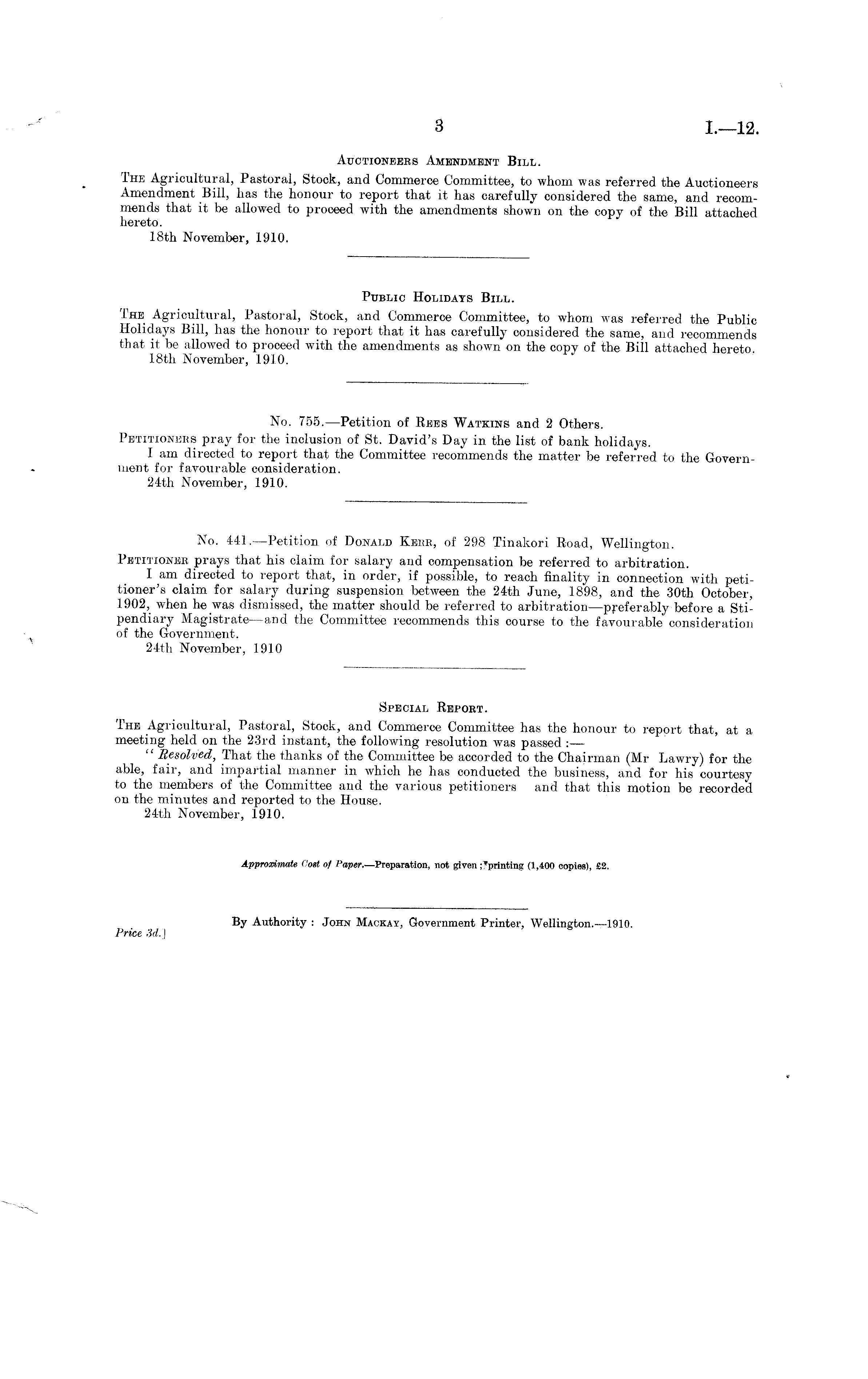 Special Report. The Agricultural, Pastoral, Stock, and Commerce Committee has the honour to report that, at a meeting held on the 23rd instant, the following resolution was passed :— "Resolved, That the thanks of the Committee be accorded to the Chairman (Mr Lawry) for the able, fair, and impartial manner in which he has conducted the business, and for his courtesy to the members of the Committee and the various petitioners and that this motion be recorded on the minutes and reported to the House. 24th November, 1910. Approximate Cost of Paper.— Preparation, not given Sprinting (1,400 copies), £2.