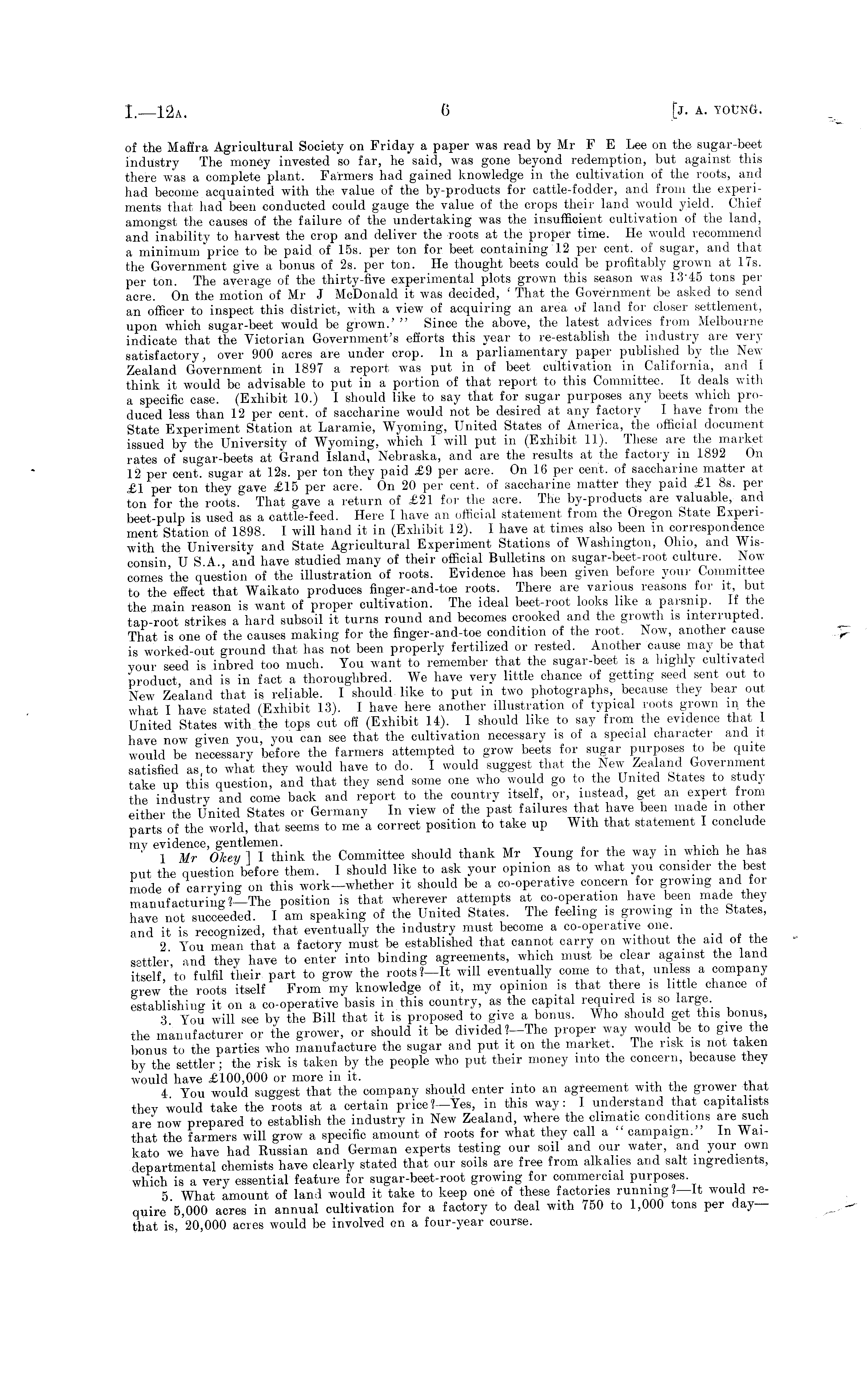 of the Mafira Agricultural Society on Friday a paper was read by Mr F E Lee on the sugar-beet industry The money invested so far, he said, was gone beyond redemption, but against this there was a complete plant. Farmers had gained knowledge in the cultivation of the roots, and had become acquainted with the value of the by-products for cattle-fodder, and from the experiments that had been conducted could gauge the value of the crops their land would yield. Chief amongst the causes of the failure of the undertaking was the insufficient cultivation of the land, and inability to harvest the crop and deliver the roots at the proper time. He would recommend a minimum'price to be paid of 15s. per ton for beet containing 12 per cent, of sugar, and that the Government give a bonus of 2s. per ton. He thought beets could be profitably grown at 17s. per ton. The average of the thirty-five experimental plots grown this season was 1345 tons per acre. On the motion of Mr J McDonald it was decided, ' That the Government be asked to send an officer to inspect this district, with a view of acquiring an area of land for closer settlement, upon which sugar-beet would be grown.' " Since the above, the latest advices from Melbourne indicate that the Victorian Government's efforts this year to re-establish the industry are very satisfactory, over 900 acres are under crop. In a parliamentary paper published by the New Zealand Government in 1897 a report was put in of beet cultivation in California, and I think it would be advisable to put in a portion of that report to this Committee. It deals with a specific case. (Exhibit 10.) I should like to say that for sugar purposes any beets which produced less than 12 per cent, of saccharine would not be desired at any factory I have from the State Experiment Station at Laramie, Wyoming, United States of America, the official document issued by the University of Wyoming, which I will put in (Exhibit 11). These are the market rates of sugar-beets at Grand Island, Nebraska, and are the results at the factory in 1892 On 12 per cent, sugar at 12s. per ton they paid £9 per acre. On 1C per cent, of saccharine matter at £1 per ton they gave £15 per acre. " On 20 per cent, of saccharine matter they paid £1 Bs. per ton for the roots. That gave a return of £21 for the acre. The by-products are valuable, and beet-pulp is used as a cattle-feed. Here I have an official statement from the Oregon State Experiment Station of 1898. I will hand it in (Exhibit 12). 1 have at times also been in correspondence with the University and State Agricultural Experiment Stations of Washington, Ohio, and Wisconsin USA, and have studied many of their official Bulletins on sugar-beet-root culture. Now comes the question of the illustration of roots. Evidence has been given before your Committee to the effect that Waikato produces fmger-and-toe roots. There are various reasons for it but the main reason is want of proper cultivation. The ideal beet-root looks like a parsnip. It the tap-root strikes a hard subsoil it turns round and becomes crooked and the growth is interrupted. That is one of the causes making for the finger-and-toe condition of the root. Now, another cause is worked-out ground that has not been properly fertilized or rested. Another cause may be that your seed is inbred too much. You want to remember that the sugar-beet is a highly cultivated product and is in fact a thoroughbred. We have very little chance of getting seed sent out to New Zealand that is reliable. I should like to put in two photographs, because they bear out what I have stated (Exhibit 13). I have here another illustration of typical roots grown in the United States with the tops cut off (Exhibit 14). I should like to say from the evidence that 1 have now given you, you can see that the cultivation necessary is of a special character and it would be necessary before the farmers attempted to grow beets for sugar purposes to be quite satisfied as,to what they would have to do. I would suggest that the New Zealand Government take up this question, and that they send some one who would go to the United States to study the industry and come back and report to the country itself, or, instead, get an expert from either the United States or Germany In view of the past failures that have been made in other parts of the world, that seems to me a correct position to take up With that statement I conclude my evidence, gentlemen. . . , , ' 1 Mr Okey 1 I think the Committee should thank Mr Young for the way in which he has BUt the question before them. I should like to ask your opinion as to what you consider the best mode of carrying on this work—whether it should be a co-operative concern for growing and tor manufacturing?—The position is that wherever attempts at co-operation have been made they hive not succeeded. I am speaking of the United States. The feeling is growing in the States, and it is recognized, that eventually the industry must become a co-operative one. _ 2 You mean that a factory must be established that cannot carry on without the aid ot tne settler and they have to enter into binding agreements, which must be clear against the land itself 'to fulfil their part to grow the roots?—lt will eventually come to that, unless a company grew' the roots itself From my knowledge of it, my opinion is that there is little chance of establishing it on a co-operative basis in this country, as the capital required is so large. 3 You will see by the Bill that it is proposed to give a bonus. Who should get this bonus, the manufacturer or the grower, or should it be divided?-The proper way would be to give the bonus to the parties who manufacture the sugar and put it on the market The risk is not taken by the settler; the risk is taken by the people who put their money into the concern, because they would have £100,000 or more in it. _ 4 You would suggest that the company should enter into an agreement with the g