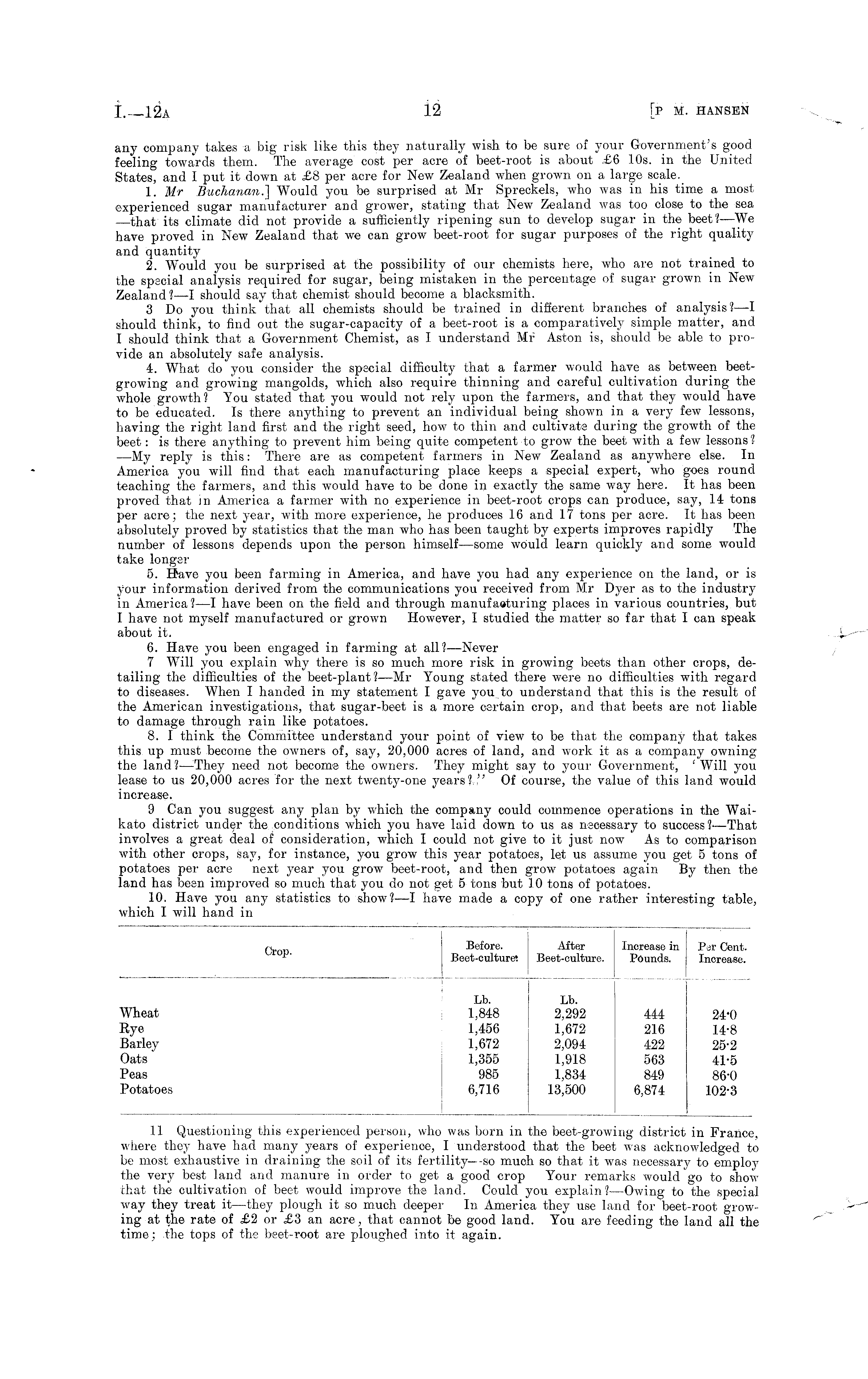 any company takes a big risk like this they naturally wish to be sure of your Government's good feeling towards them. The average cost per acre of beet-root is about £6 10s. in the United States, and I put it down at £8 per acre for New Zealand when grown on a large scale. 1. Mr Buchanan.] Would you be surprised at Mr Spreckels, who was in his time a most experienced sugar manufacturer and grower, stating that New Zealand was too close to the sea —that its climate did not provide a sufficiently ripening sun to develop sugar in the beet? —We have proved in New Zealand that we can grow beet-root for sugar purposes of the right quality and quantity 2. Would you be surprised at the possibility of our chemists here, who are not trained to the special analysis required for sugar, being mistaken in the percentage of sugar grown in New Zealand? —I should say that chemist should become a blacksmith. 3 Do you think "that all chemists should be trained in different branches of analysis? —I should think, to find out the sugar-capacity of a beet-root is a comparatively simple matter, and I should think that a Government Chemist, as I understand Mr Aston is, should be able to provide an absolutely safe analysis. 4. What do you consider the special difficulty that a farmer would have as between beetgrowing and growing mangolds, which also require thinning and careful cultivation during the whole growth? You stated that you would not rely upon the farmers, and that they would have to be educated. Is there anything to prevent an individual being shown in a very few lessons, having the right land first and the right seed, how to thin and cultivate during the growth of the beet: is there anything to prevent him being quite competent to grow the beet with a few lessons? —My reply is this: There are as competent farmers in New Zealand as anywhere else. In America you will find that each manufacturing place keeps a special expert, who goes round teaching the farmers, and this would have to be done in exactly the same way here. It has been proved that in America a farmer with no experience in beet-root crops can produce, say, 14 tons per acre; the next year, with more experience, he produces 16 and 17 tons per acre. It has been absolutely proved by statistics that the man who has been taught by experts improves rapidly The number of lessons depends upon the person himself—some would learn quickly and some would take longer 5. Have you been farming in America, and have you had any experience on the land, or is your information derived from the communications you received from Mr Dyer as to the industry in America ?—I have been on the field and through manufaoturing places in various countries, but I have not myself manufactured or grown However, I studied the matter so far that I can speak about it. 6. Have you been engaged in farming at all?— Never 7 Will you explain why there is so much more risk in growing beets than other crops, detailing the difficulties of the beet-plant?—Mr Young stated there were no difficulties with regard to diseases. When I handed in my statement I gave you to understand that this is the result of the American investigations, that sugar-beet is a more certain crop, and that beets are not liable to damage through rain like potatoes. 8. I think the Committee understand your point of view to be that the company that takes this up must become the owners of, say, 20,000 acres of land, and work it as a company owning the land ?—They need not become the owners. They might say to your Government, ' Will you lease to us 20,000 acres for the next twenty-one years?." Of course, the value of this land would increase. 9 Can you suggest any plan by which the company could commence operations in the Waikato district under the conditions which you have laid down to us as necessary to success?— That involves a great deal of consideration, which I could not give to it just now As to comparison with other crops, say, for instance, you grow this year potatoes, let us assume you get 5 tons of potatoes per acre next j'ear you grow beet-root, and then grow potatoes again By then the land has been improved so much that you do not get 5 tons but 10 tons of potatoes. 10. Have you any statistics to show? —I have made a copy of one rather interesting table, which I will hand in