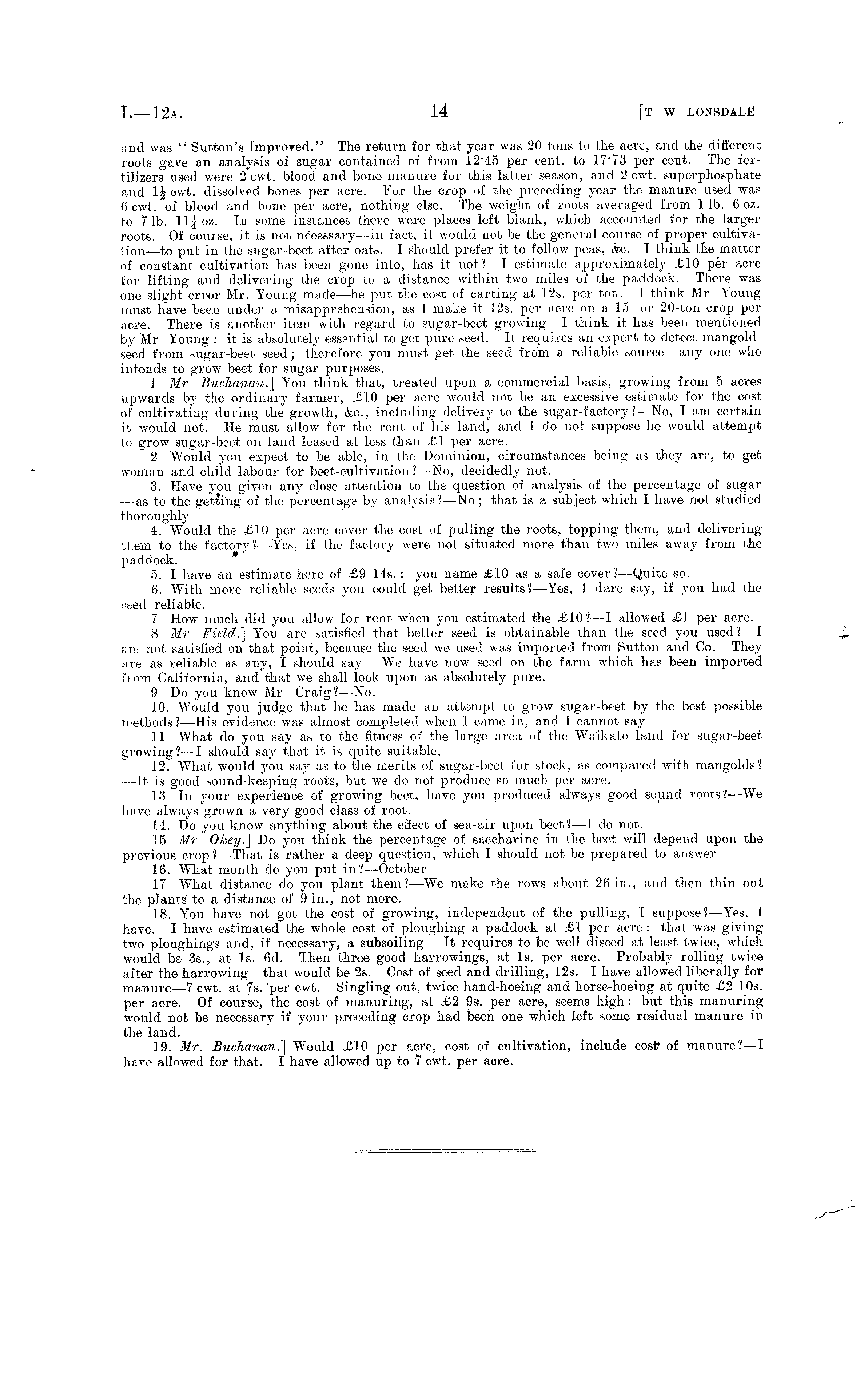 and was " Sutton's Improved." The return for that year was 20 tons to the acre, and the different roots gave an analysis of sugar contained of from 12 - 45 per cent, to 1773 per cent. The fertilizers used were 2 cwt. blood and bone manure for this latter season, and 2 cwt, superphosphate and 1| cwt. dissolved bones per acre, lor the crop of the preceding year the manure used was 6 cwt. of blood and bone per acre, nothing else. The weight of roots averaged from 1 lb. 6 oz. to 71b. lljoz. In some instances there were places left blank, which accounted for the larger roots. Of course, it is not necessary—in fact, it would not be the general course of proper cultivation—to put in the sugar-beet after oats. I should prefer it to follow peas, &c. I think the matter of constant cultivation has been gone into, has it not? I estimate approximately £10 per acre for lifting and delivering the crop to a distance within two miles of the paddock. There was one slight error Mr. Young made —he put the cost of carting at 12s. per ton. I think. Mr Young must have been under a misapprehension, as I make it 12s. per acre on a 15- or 20-ton crop per acre. There is another item with regard to sugar-beet growing—l think it has been mentioned by Mr Young :it is absolutely essential to get pure seed. It requires an expert to detect mangoldseed from sugar-beet seed; therefore you must get the seed from a reliable source—any one who intends to grow beet for sugar purposes. 1 Mr Buchanan.] You think that, treated upon a commercial basis, growing from 5 acres upwards by the ordinary farmer, £10 per acre would not be an excessive estimate for the cost of cultivating during the growth, &c, including delivery to the sugar-factory? —No, I am certain it would not. He must allow for the rent of his land, and I do not suppose he would attempt to grow sugar-beet on land leased at less than £1 per acre. 2 Would you expect to be able, in the Dominion, circumstances being as they are, to get woman and child labour for beet-cultivation? —No, decidedly not. 3. Have you given any close attention to the question of analysis of the percentage of sugar —as to the getfing of the percentage by analysis? —No; that is a subject which I have not studied thoroughly 4. Would the £10 per acre cover the cost of pulling the roots, topping them, and delivering them to the factory?— Yes, if the factory were not situated more than two miles away from, the paddock. 5. I have an estimate here of £9 I4s. : you name £10 as a safe cover? —Quite so. 6. With more reliable seeds you could get better results? —Yes, I dare say, if you had the seed reliable. 7 How much did you allow for rent when you estimated the £10?— I allowed £1 per acre. 8 Mr Field.] You are satisfied that better seed is obtainable than the seed you used?—l am not satisfied on that point, because the seed we used was imported from Sutton and Co. They are as reliable as any, I should say We have now seed on the farm which has been imported from California, and that we shall look upon as absolutely pure. 9 Do you know Mr Craig? —No. 10. W r ould you judge that he has made an attempt to grow sugar-beet by the best possible methods? —His evidence was almost completed when I came in, and I cannot say II What do you say as to the fitness of the large area of the Waikato land for sugar-beet growing?—l should say that it is quite suitable. 12. What would you say as to the merits of sugar-beet for stock, as compared with mangolds? —It is good sound-keeping roots, but we do not produce so much per acre. 13 In your experience of growing beet, have you produced always good sound roots?—We have always grown a very good class of root. 1.4. Do you know anything about the effect of sea-air upon beet?—l do not. 15 Mr Okey.] Do you think the percentage of saccharine in the beet will depend upon the previous crop?— That is rather a deep question, which I should not be prepared to answer 16. What month do you put in? —October 17 What distance do you plant them?—We make the rows about 26 in., and then thin out the plants to a distance of 9 in., not more. 18. You have not got the cost of growing, independent of the pulling, I suppose?— Yes, I have. I have estimated the whole cost of ploughing a paddock at £1 per acre : that was giving two ploughings and, if necessary, a subsoiling It requires to be well disced at least twice, which would be 35., at Is. 6d. Ihen three good harrowings, at Is. per acre. Probably rolling twice after the harrowing—that would be 2s. Cost of seed and drilling, 12s. I have allowed liberally for manure—7 cwt. at 7s. 'per cwt. Singling out, twice hand-hoeing and horse-hoeing at quite £2 10s. per acre. Of course, the cost of manuring, at £2 9s. per acre, seems high; but this manuring would not be necessary if your preceding crop had been one which left some residual manure in the land. 19. Mr. Buchanan.] Would £10 per acre, cost of cultivation, include cost of manure?—l have allowed for that. I have allowed up to 7 cwt. per acre.