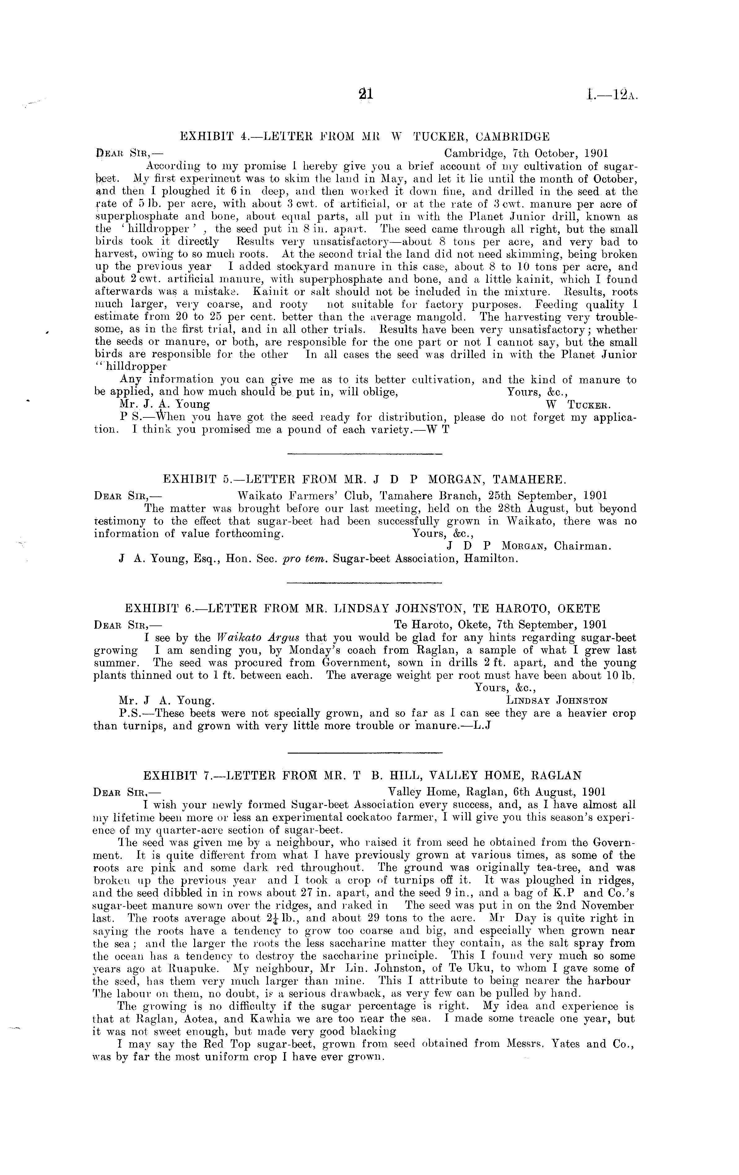 EXHIBIT 7.—LETTER FROM MR. T B. HILL, VALLEY HOME, RAGLAN Dear Sir, — Valley Home, Raglan, 6th August, 1901 I wish your newly formed Sugar-beet Association every success, and, as I have almost all my lifetime been more or less an experimental cockatoo farmer, I will give you this season's experience of my quarter-acre section of sugar-beet. 'lire seed was given me by a neighbour, who raised it from seed he obtained from the Government. It is quite different from what I have previously grown at various times, as some of the roots are pink and some dark red throughout. The ground was originally tea-tree, and was broken up the previous year and I took a crop of turnips off it. It was ploughed in ridges, and the seed dibbled in in rows about 27 in. apart, and the seed 9 in., and a bag of K.P and Co.'s sugar-beet manure sown over the ridges, and raked in The seed was put in on the 2nd November last. The roots average about 2|lb., and about 29 tons to the acre. Mr Day is quite right in saying the roots have a tendency to grow too coarse and big, and especially when grown near the sea ; and the larger the roots the less saccharine matter they contain, as the salt spray from the ocean has a tendency to destroy the saccharine principle. This I found very much so some years ago at Ruapuke. My neighbour, Mr Lin. Johnston, of Te Uku, to whom I gave some of the seed, has them very much larger than mine. This I attribute to being nearer the harbour The labour on them, no doubt, is a serious drawback, as very few can be pulled by hand. The growing is no difficulty if the sugar percentage is right. My idea and experience is that at Raglan, Aotea, and Kawhia we are too near the sea. I made some treacle one year, but it was not sweet enough, but made very good blacking I may say the Red Top sugar-beet, grown from seed obtained from Messrs, Yates and Co., was by far the most uniform crop I have ever grown.
