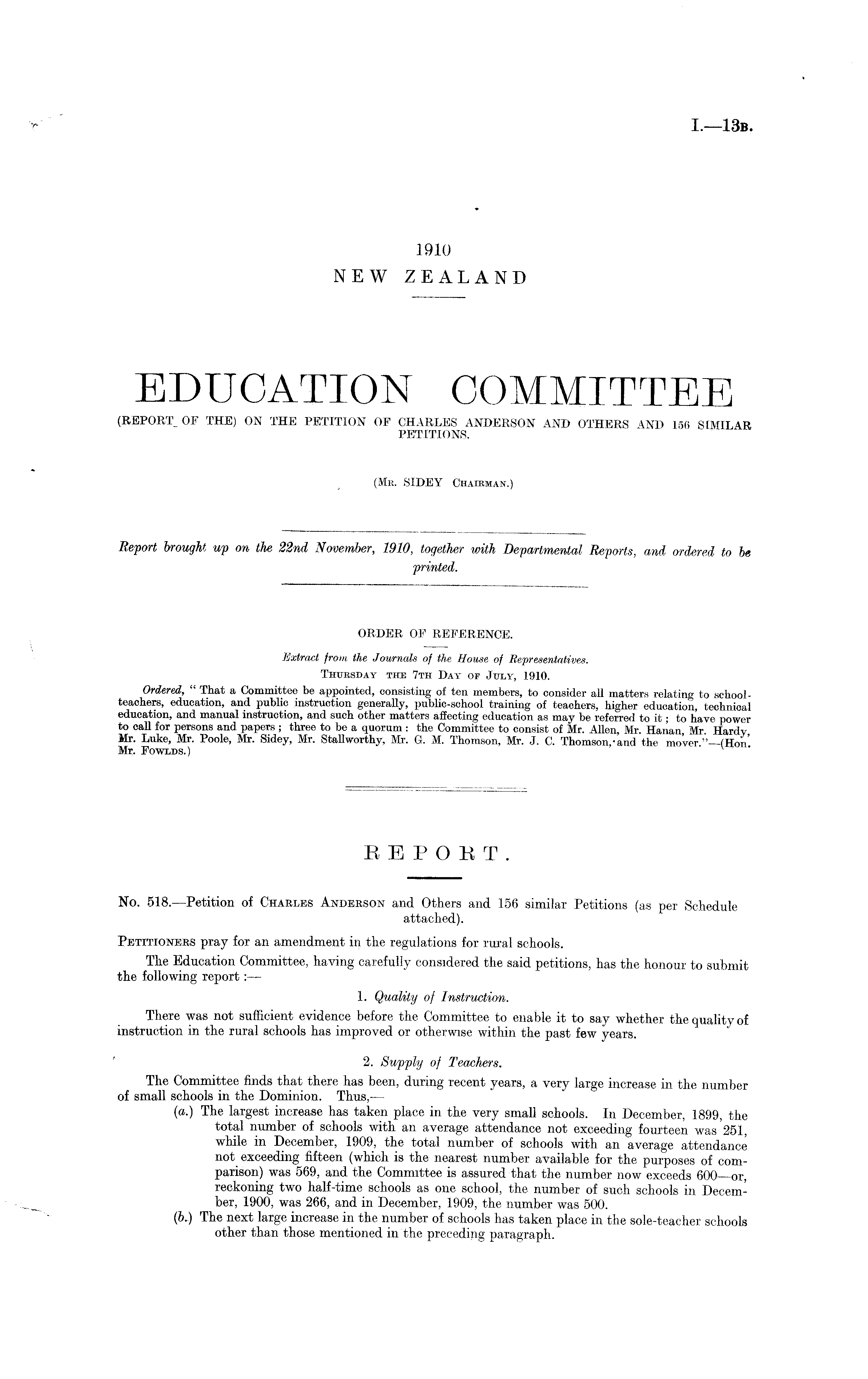 ORDER OF REFERENCE. Jixtrati from the Journals of the House of Representatives. Thursday the 7th Day of July, 1910. Ordered, " That a Committee be appointed, consisting of ten members, to consider all matters relating to .schoolteachers, education, and public instruction generally, public-school training of teachers, higher education, technical education, and manual instruction, and such other matters affecting education as may be referred to it • to have power to call for persons and papers ; three to be a quorum : the Committee to consist of Mr. Allen Mr Hanan Mr Hardy Mr. Luke, Mr. Poole, Mr. Sidoy, Mr. Stallworthy, Mr. G. M. Thomson, Mr. J. C. Thomson,-and the mover. , ' , —(Hon! Mr. FowLDS.)