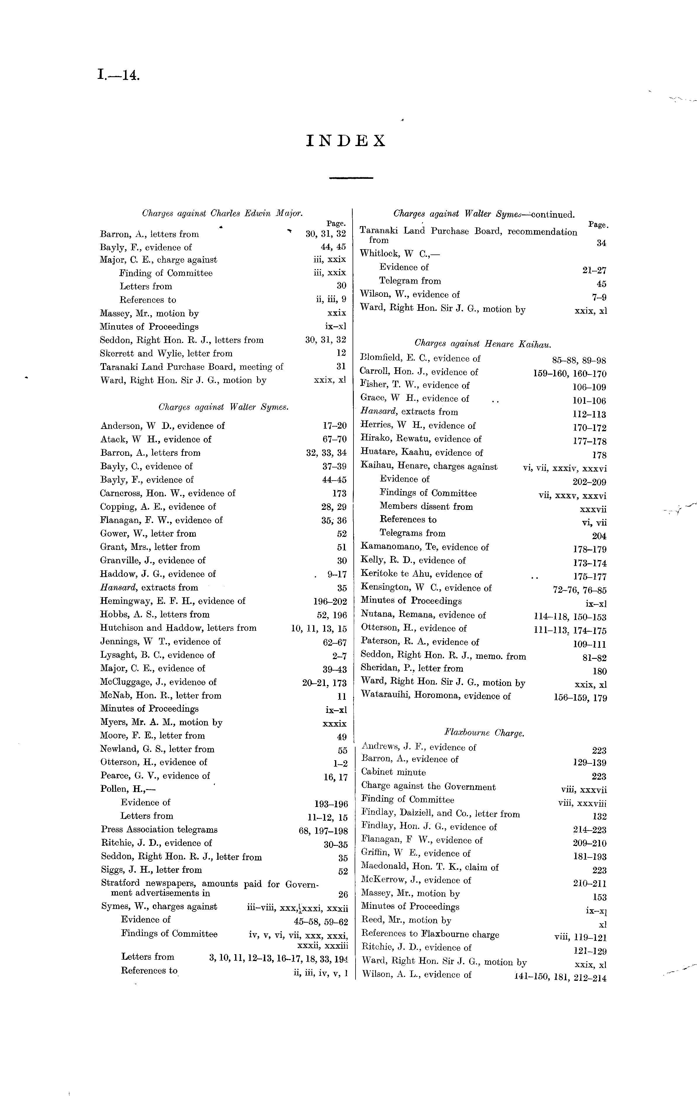 Charges against Walter Syrnes— continued. Taranaki Land Purchase Board, recommendation from 34 Whitlock, W C.,— Evidence of 21-27 Telegram from 45 Wilson, W., evidence of 7_g Ward, Right Hon. Sir J. G., motion by xxix, xl Charges against Henare Kaihau. Blomfield, E. C, evidence of 85-88, 89-98 Carroll, Hon. J., evidence of 159-160, 160-170 Fisher, T. W., evidence of 106-109 Grace, W H., evidence of .. 101-106 Hansard, extracts from 112-113 Herries, W H., evidence of 170-172 Hirako, Rewatu, evidence of 177-178 Huatare, Kaahu, evidence of 173 Kaihau, Henare, charges against vi, vii, xxxiv, xxxvi Evidence of 202-209 Findings of Committee vii, xxxv, xxxvi Members dissent from xxxvii References to v j v j; Telegrams from 204 Kamanomano, Te, evidence of 178-179 Kelly, R. D., evidence of 173-174 Keritoke te Ahu, evidence of .. 175-177 Kensington, W C, evidence of 72-76, 76-85 Minutes of Proceedings ; x _ x j Nutana, Remana, evidence of 114-118, 150-153 Otterson, H., evidence of 111-113. 174-175 Paterson, R. A., evidence of 109-111 Seddon, Right Hon. R. J., memo, from 81-82 Sheridan, P., letter from jgrj Ward, Right Hon. Sir J. G., motion by xxix, xl Watarauihi, Horomona, evidence of 156-159, 179 Flaxbonrne Charge. Andrews, J. P., evidence of 223 Barron, A., evidence of 129-139 Cabinet minute oq-} Charge against the Government v iii, xxxvii Finding of Committee viii, xxxviii Findlay, Dalziell, and Co., letter from 132 Findlay, Hon. J. G., evidence of 214-223 Flanagan, F W., evidence of 209-210 Griffin, W E., evidence of 181-193 Macdonald, Hon. T. X., claim of 223 McKerrow, J., evidence of 210-211 Massey, Mr., motion by Minutes of Proceedings ix-xi Reed, Mr., motion by , References to Flaxbourne charge v iii 119-121 Ritchie, J. D., evidence of 121-129 Ward, Right Hon. Sir J. G., motion by X xix xl Wilson, A. L., evidence of 141-150, 181, 212-214