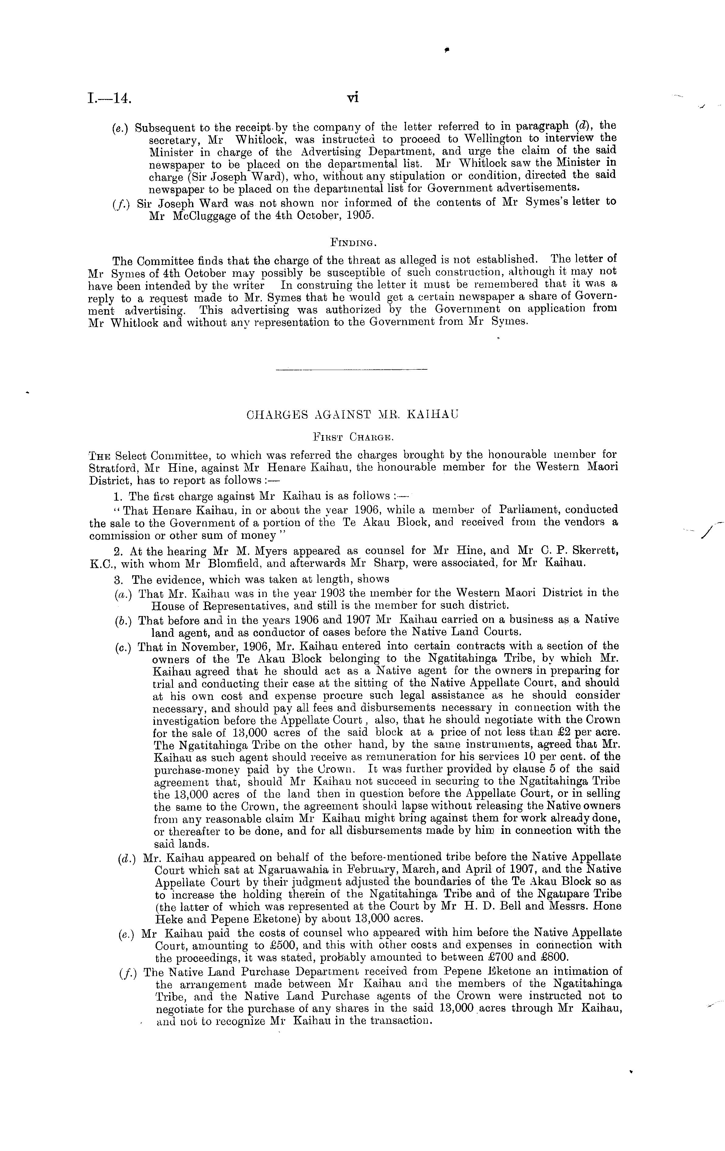 CHARGES AGAINST MR. KAIHAU First Chabge. The Select Committee, to which was referred the charges brought by the honourable member for Stratford, Mr Hine, against Mr Henare Kaihau, the honourable member for the Western Maori District, has to report as follows : — 1. The first charge against Mr Kaihau is as follows : — " That Henare Kaihau, in or about the year 1906, while a member of Parliament, conducted the sale to the Government of a portion of the Te Akau Block, and received from the vendors a commission or other sum of money " 2. At the hearing Mr M. Myers appeared as counsel for Mr Hine, and Mr 0. P. Skerrett, K.C., with whom Mr Blomfield, and afterwards Mr Sharp, were associated, for Mr Kaihau. 3. The evidence, which was taken at length, shows (a.) That Mr. Kaihau was in the year 1903 the member for the Western Maori District in the House of Representatives, and still is the member for such district. (b.) That before and in the years 1906 and 1907 Mr Kaihau carried on a business as a Native land agent, and as conductor of cases before the Native Land Courts. (c.) That in November, 1906, Mr. Kaihau entered into certain contracts with a section of the owners of the Te Akau Block belonging to the Ngatitahinga Tribe, by which Mr. Kaihau agreed that he should act as a Native agent for the owners in preparing for trial and conducting their case at the sitting of the Native Appellate Court, and should at his own cost and expense procure such legal assistance as he should consider necessary, and should pay all fees and disbursements necessary in connection with the investigation before the Appellate Court, also, that he should negotiate with the Crown for the sale of 13,000 acres of the said block at a price of not less than £2 per acre. The Ngatitahinga Tribe on the other hand, by the same instruments, agreed that Mr. Kaihau as such agent should receive as remuneration for his services 10 per cent, of the purchase-money paid by the Crown. It was further provided by clause sof the said agreement that, should Mr Kaihau not succeed in securing to the Ngatitahinga Tribe the 13,000 acres of the land then in question before the Appellate Court, or in selling the same to the Crown, the agreement should lapse without releasing the Native owners from any reasonable claim Mr Kaihau might bring against them for work already done, or thereafter to be done, and for all disbursements made by him in connection with the said lands. (d.) Mr. Kaihau appeared on behalf of the before-mentioned tribe before the Native Appellate Court which sat at Ngaruawahia in February, March, and April of 1907, and the Native Appellate Court by their judgment adjusted the boundaries of the Te Akau Block so as to increase the holding therein of the Ngatitahinga Tribe and of the Ngatipare Tribe (the latter of which was represented at the Court by Mr H. D. Bell and Messrs. Hone Heke and Pepene Eketone) by about 13,000 acres. (c.) Mr Kaihau paid the costs of counsel who appeared with him before the Native Appellate Court, amounting to £500, and this with other costs and expenses in connection with the proceedings, it was stated, probably amounted to between £700 and £800. (/.) The Native Land Purchase Department received from Pepene Eketone an intimation of the arrangement made between Mr Kaihau and the members of the Ngatitahinga Tribe, and the Native Land Purchase agents of the Crown were instructed not to negotiate for the purchase of any shares in the said 13,000 acres through Mr Kaihau, and not to recognize Mr Kaihau in the transaction.