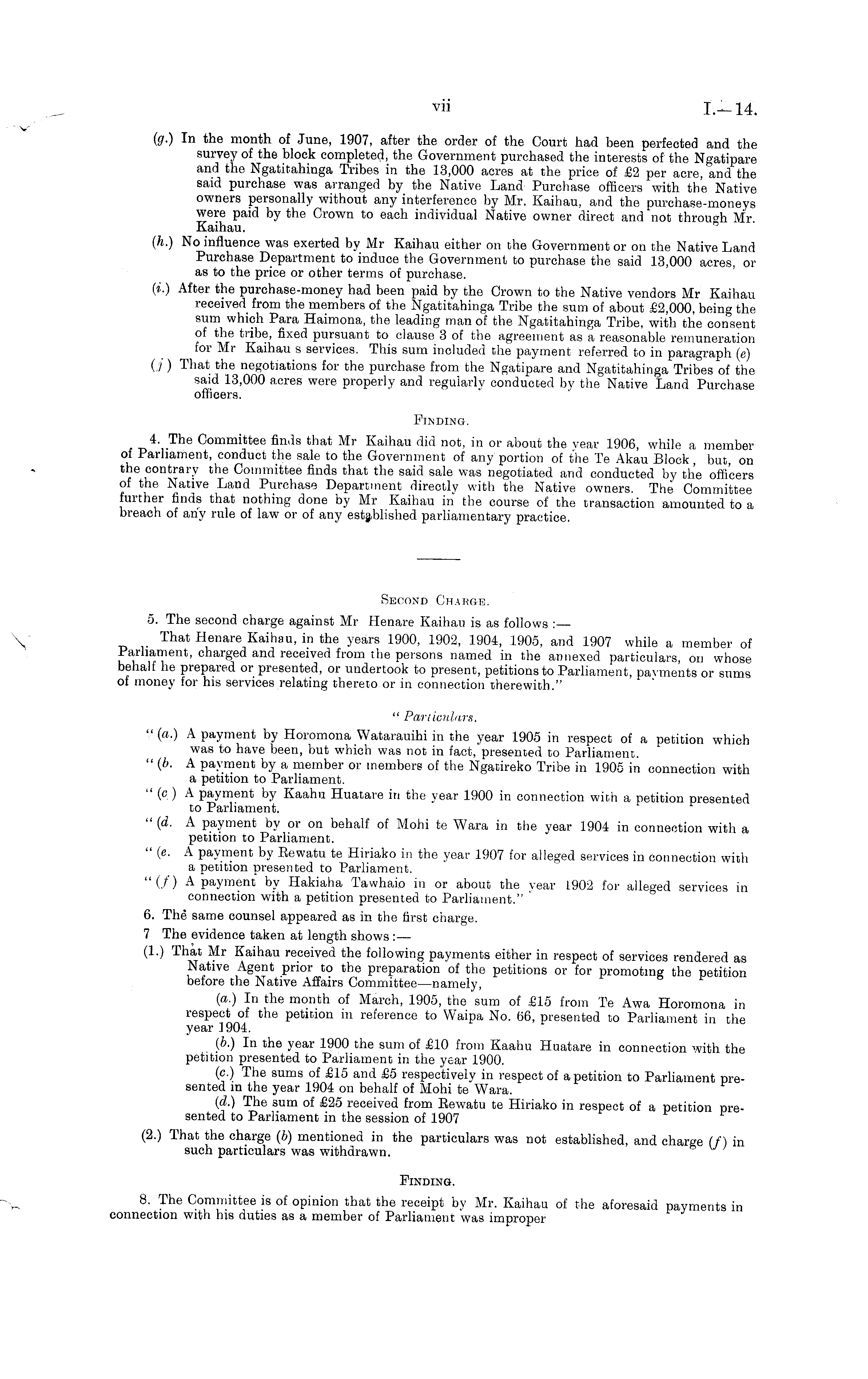 (g.) In the month of June, 1907, after the order of the Court had been perfected and the survey of the block completed, the Government purchased the interests of the Ngatipare and the Ngatitahinga Tribes in the 13,000 acres at the price of £2 per acre, and the said purchase was arranged by the Native Land Purchase officers with the Native owners personally without any interference by Mr. Kaihau, and the purchase-moneys were paid by the Crown to each individual Native owner direct and not through Mr Kaihau. (h.) No influence was exerted by Mr Kaihau either on the Government or on the Native Land Purchase Department to induce the Government to purchase the said 13,000 acres, or as to the price or other terms of purchase. (*.) After the purchase-money had been paid by the Crown to the Native vendors Mr Kaihau received from the members of the Ngatitahinga Tribe the sum of about £2,000, being the sum which Para Haimona, the leading man of the Ngatitahinga Tribe, with the consent of the tribe, fixed pursuant to clause 3 of the agreement as a reasonable remuneration for Mr Kaihau s services. This sum included the payment referred to in paragraph (c) {;] ) That the negotiations for the purchase from the Ngatipare and Ngatitahinga Tribes of the said 13,000 acres were properly and regularly conducted by the Native Land Purchase officers. Finding. 4. The Committee finds that Mr Kaihau did not, in or about the year 1906, while a member of Parliament, conduct the sale to the Government of any portion of the Te Akau Block but on the contrary the Committee finds that the said sale was negotiated and conducted by the officers of the Native Land Purchase Department directly with the Native owners. The Committee further finds that nothing done by Mr Kaihau in the course of the transaction amounted to a breach of any rule of law or of any established parliamentary practice.