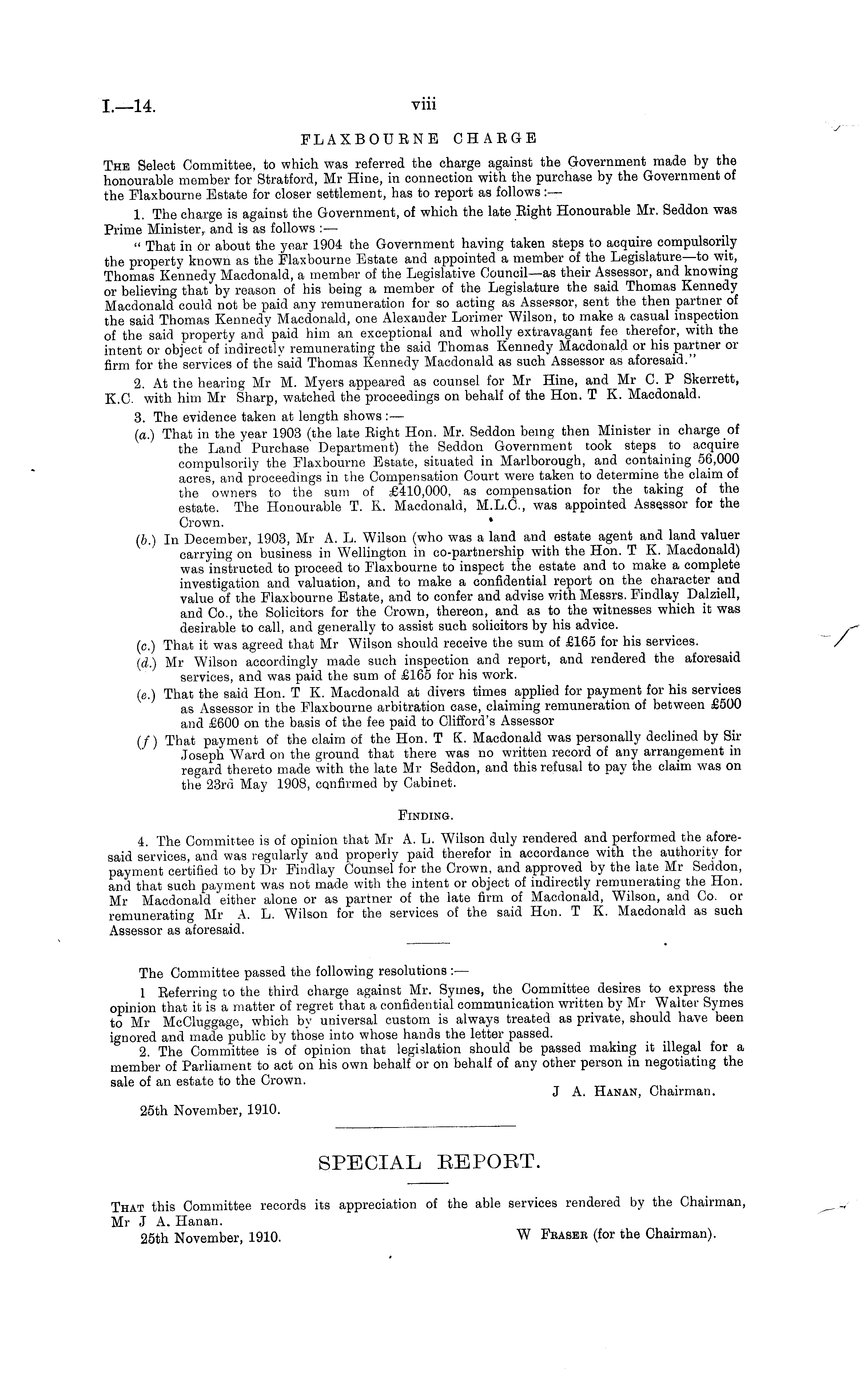 FLAXBOURNE CHARGE The Select Committee, to which was referred the charge against the Government made by the honourable member for Stratford, Mr Hine, in connection with the purchase by the Government of the Flaxbourne Estate for closer settlement, has to report as follows :— 1. The charge is against the Government, of which the late Right Honourable Mr. Seddon was Prime Minister, and is as follows : — " That in or about the year 1904 the Government having taken steps to acquire compulsorily the property known as the Flaxbourne Estate and appointed a member of the Legislature —to wit, Thomas Kennedy Macdonald, a member of the Legislative Council—as their Assessor, and knowing or believing that by reason of his being a member of the Legislature the said Thomas Kennedy Macdonald could not be paid any remuneration for so acting as Assessor, sent the then partner of the said Thomas Kennedy Macdonald, one Alexander Lorimer Wilson, to make a casual inspection of the said property and paid him an exceptional and wholly extravagant fee therefor, with the intent or object of indirectly remunerating the said Thomas Kennedy Macdonald or his partner or firm for the services of the said Thomas Kennedy Macdonald as such Assessor as aforesaid." 2. At the hearing Mr M. Myers appeared as counsel for Mr Hine, and Mr C. P Skerrett, K.C. with him Mr Sharp, watched the proceedings on behalf of the Hon. T K. Macdonald. 3. The evidence taken at length shows : — (a.) That in the year 1903 (the late Right Hon. Mr. Seddon being then Minister in charge of the Land' Purchase Department) the Seddon Government took steps to acquire compulsorily the Flaxbourne Estate, situated in Marlborough, and containing 56,000 acres, and proceedings in the Compensation Court were taken to determine the claim of the owners to the sum of £410,000, as compensation for the taking of the estate. The Honourable T. K. Macdonald, M.L.C., was appointed Assessor for the Crown. (b.) In December, 1903, Mr A. L. Wilson (who was a land and estate agent and land valuer carrying on business in Wellington in co-partnership with the Hon. T K. Macdonald) was instructed to proceed to Flaxbourne to inspect the estate and to make a complete investigation and valuation, and to make a confidential report on the character and value of the Flaxbourne Estate, and to confer and advise with Messrs. Findlay Dalziell, and Co., the Solicitors for the Crown, thereon, and as to the witnesses which it was desirable to call, and generally to assist such solicitors by his advice. (c.) That it was agreed that Mr Wilson should receive the sum of £165 for his services. (d.) Mr Wilson accordingly made such inspection and report, and rendered the aforesaid services, and was paid the sum of £165 for his work. (c.) That the said Hon. T K. Macdonald at divers times applied for payment for his services as Assessor in the Flaxbourne arbitration case, claiming remuneration of between £500 and £600 on the basis of the fee paid to Clifford's Assessor (/) That payment of the claim of the Hon. T K. Macdonald was personally declined by Sir Joseph Ward on the ground that there was no written record of any arrangement in regard thereto made with the late Mr Seddon, and this refusal to pay the claim was on the 23rd May 1908, confirmed by Cabinet. Finding. 4. The Committee is of opinion that Mr A. L. Wilson duly rendered and performed the aforesaid services, and was regularly and properly paid therefor in accordance with the authority for payment certified to by Dr Findlay Counsel for the Crown, and approved by the late Mr Seddon, and that such payment was not made with the intent or object of indirectly remunerating the Hon. Mr Macdonald either alone or as partner of the late firm of Macdonald, Wilson, and Co. or remunerating Mr A. L. Wilson for the services of the said Hon. T K. Macdonald as such Assessor as aforesaid.