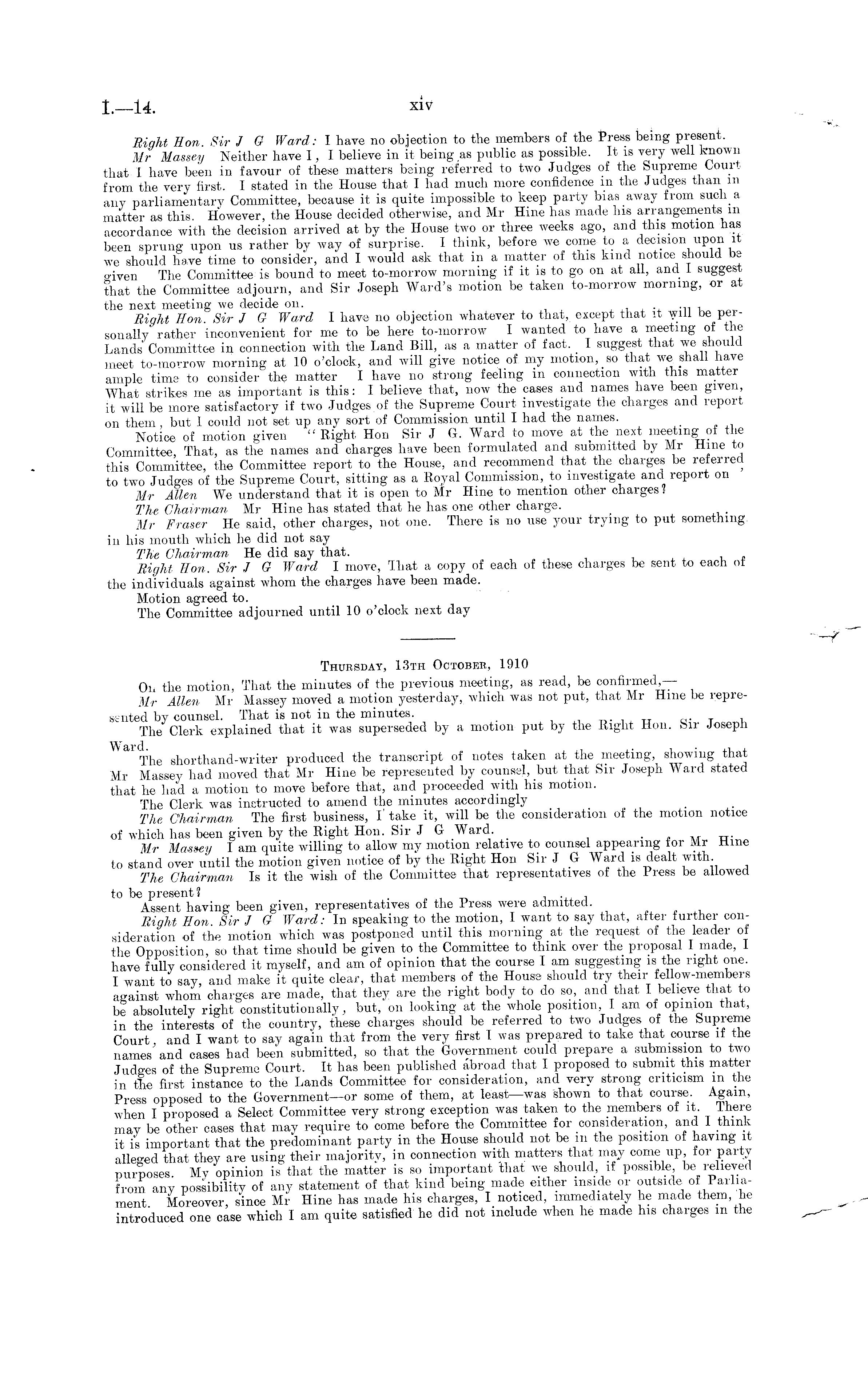 Thursday, I.3th October, 1910 On the motion, That the minutes of the previous meeting, as read, be confirmed,— Mr Allen Mr Massey moved a motion yesterday, which was not put, that Mr Hme be represented by counsel. That is not in the minutes. _ T . The Clerk explained that it was superseded by a motion put by the Right Hon. bir Josepli The shorthand-writer produced the transcript of notes taken at the meeting, showing that Mr Massey had moved that Mr Hine be represented by counsel, but that Sir Joseph Ward stated that he had a motion to move before that, and proceeded with his motion. The Clerk was instructed to amend the minutes accordingly The Chairman The first business, I take it, will be the consideration of the motion notice of which has been given by the Right Hon. Sir J G Ward _ Mr Massey lam quite willing to allow my motion relative to counsel appearing tor Mr Hme to stand over until the motion given notice of by the Right Hon Sir J G Ward is dealt with. The Chairman Is it the wish of the Committee that representatives of the Press be allowed to be present? Assent having been given, representatives of the Press were admitted. Right Hon Sir J G Ward: In speaking to the motion, I want to say that, after further consideration of the motion which was postponed until this morning at the request of the leader of the Opposition, so that time should be given to the Committee to think over the proposal I made, I have fully considered it myself, and am of opinion that the course I am suggesting is the right one. I want to say, and make it quite clear, that members of the House should try their fellow-members against whom charges are made, that they are the right body to do so, and that I believe that to be absolutely right constitutionally, but, on looking at the whole position, I am of opinion that, in the interests of the country, these charges should be referred to two Judges of the Supreme Court and I want to say again that from the very first I was prepared to take that course if the names'and cases had been submitted, so that the Government could prepare a submission to two ludo-es of the Supreme Court. It has been published abroad that 1 proposed to submit this matter in tie first instance to the Lands Committee for consideration, and very strong criticism in the Press opposed to the Government—or some of them, at least—was shown to that course. Again, when I proposed a Select Committee very strong exception was taken to the members of it There may be other cases that may require to come before the Committee for consideration, ami 1 think it is important that the predominant party in the House should not be m the position of having it alleged that they are using their majority, in connection with matters that may come up for party purposes My opinion is that the matter is so important that we should, if possible be relieved from any possibility of any statement of that kind being made either inside or outside of Parliament Moreover, since Mr Hine has made his charges, I noticed, immediately he made them he introduced one case which I am quite satisfied he did not include when he made his charges in the