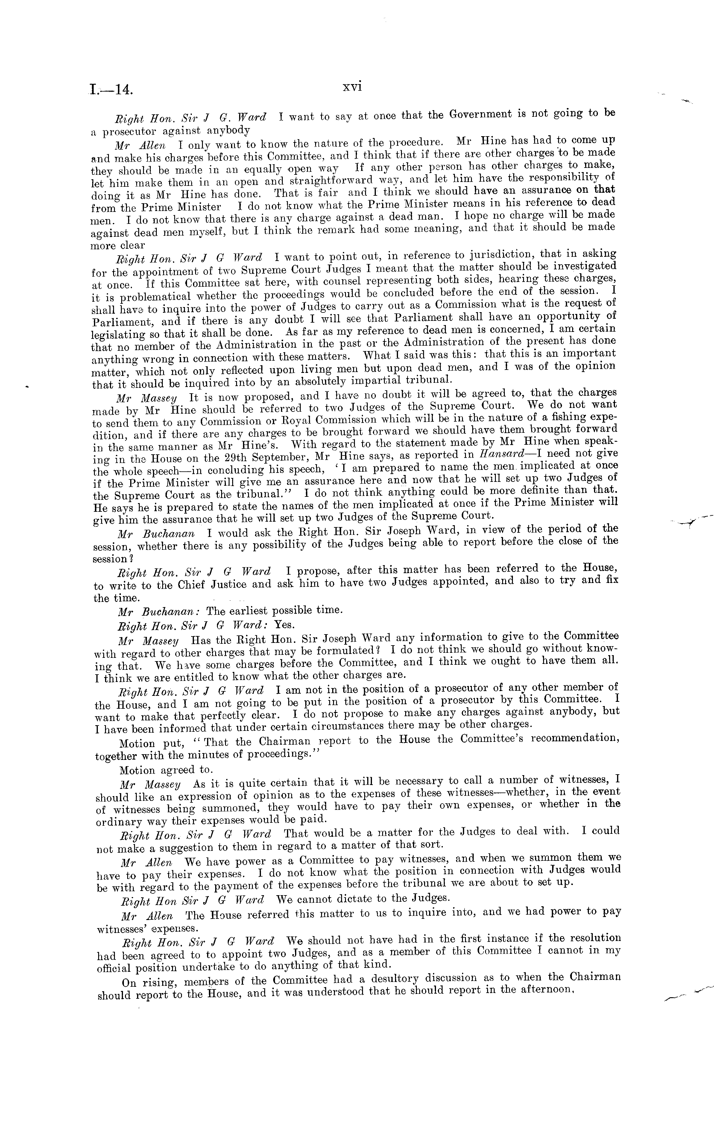 Right Hon. Sir J G. Ward I want to say at once that the Government is not going to be a prosecutor against anybody Mr Allen I only want to know the nature of the procedure. Mr Hine has had to come up and make his charges before this Committee, and I think that if there are other charges to be made they should be made in an equally open way If any other person has other charges to make, let'him make them in an open and straightforward way, and let him have the responsibility of doing it as Mr Hine has done. That is fair and I think we should have an assurance on that from the Prime Minister Ido not know what the Prime Minister means m his reference to dead men Ido not know that there is any charge against a dead man. I hope no charge will be made against dead men myself, but I think the remark had some meaning, and that it should be made more clear ; . Right Hon Sir J G Ward I want to point out, in reference to jurisdiction, that m asking for the'appointment of two Supreme Court Judges I meant that the matter should be investigated at once If this Committee sat here, with counsel representing both sides, hearing these charges it is problematical whether the proceedings would be concluded before the end of the session 1 shall have to inquire into the power of Judges to carry out as a Commission what is the request of Parliament and if there is any doubt I will see that Parliament shall have an opportunity ol legislating so that it shall be done. As far as my reference to dead men is concerned, lam certain that no member of the Administration in the past or the Administration of the present has done anything wrong in connection with these matters. What I said was this: that this is an important matter, which not only reflected upon living men but upon dead men, and I was of the opinion that it'should be inquired into by an absolutely impartial tribunal. Mr Massey It is now proposed, and I have no doubt it will be agreed to, that the charges made by Mr Hine should be referred to two Judges of the Supreme Court. We do not want to send them to any Commission or Royal Commission which will be in the nature of a fishing expedition, and if there are any charges to be brought forward we should have them brought forward in the same manner as Mr Hine's. With regard to the statement made by Mr Hme when speakin"- in the House on the 29th September, Mr Hine says, as reported m Hansard— need not give the whole speech—in concluding his speech, 'I am prepared to name the men implicated at once if the Prime Minister will give me an assurance here and now that he will set up two Judges of the Supreme Court as the tribunal." Ido not think anything could be more definite than that He says he is prepared to state the names of the men implicated at once if the Prime Minister will give him the assurance that he will set up two Judges of the Supreme Court. Mr Buchanan I would ask the Right Hon. Sir Joseph Ward, in view of the period of the session, whether there is any possibility of the Judges being able to report before the close of the session ? Right Hon Sir J G Ward I propose, after this matter has been referred to the House, to write to the Chief Justice and ask him to have two Judges appointed, and also to try and fix the time. Mr Buchanan: The earliest possible time. Right Hon. Sir J G Ward: Yes. Mr Massey Has the Right Hon. Sir Joseph Ward any information to give to the Committee with regard to other charges that may be formulated? I do not think we should go without knowing that. We have some charges before the Committee, and I think we ought to have them all. I think we are entitled to know what the other charges are. Right Hon Sir J G Ward lam not in the position of a prosecutor of any other member of the House and I am not going to be put in the position of a prosecutor by this Committee. I want to make that perfectly clear. I do not propose to make any charges against anybody, but I have been informed that under certain circumstances there may be other charges. Motion put, " That the Chairman report to the House the Committee's recommendation, together with the minutes of proceedings." Motion agreed to. Mr Massey As it is quite certain that it will be necessary to call a number of witnesses, I should like an expression of opinion as to the expenses of these witnesses—whether in the event of witnesses being summoned, they would have to pay their own expenses, or whether m the ordinary way their expenses would be paid. Right Hon. Sir J G Ward That would be a matter for the Judges to deal with. I could not make a suggestion to them in regard to a matter of that sort. Mr Allen We have power as a Committee to pay witnesses, and when we summon them we have to pay their expenses. I do not know what the position in connection with Judges would be with regard to the payment of the expenses before the tribunal we are about to set up. Right Hon Sir J G Ward We cannot dictate to the Judges. Mr Allen The House referred this matter to us to inquire into, and we had power to pay witnesses' expenses. Right Hon Sir J G Ward We should not have had in the first instance if the resolution had been agreed to to appoint two Judges, and as a member of this Committee I cannot in my official position undertake to do anything of that kind. On rising members of the Committee had a desultory discussion as to when the Chairman should report to the House, and it was understood that he should report in the afternoon,