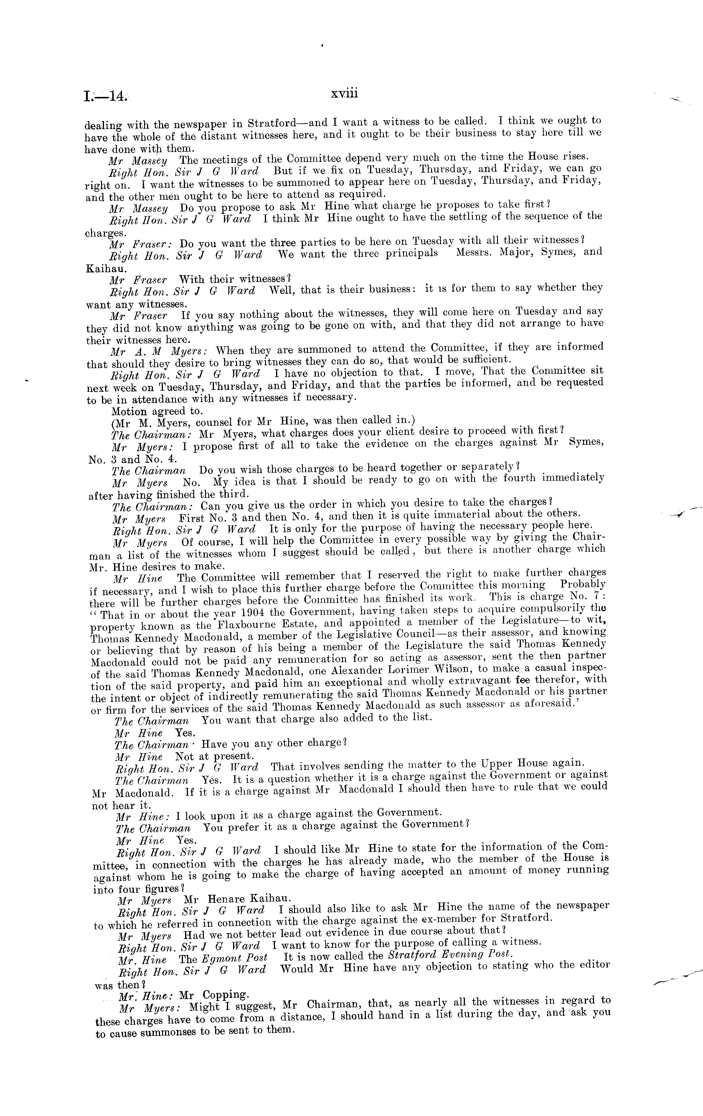 dealing with the newspaper in Stratford—and I want a witness to be called. I think we ought to have the whole of the distant witnesses here, and it ought to be their business to stay here till we have done with them. Mr Massey The meetings of the Committee depend very much on the time the House rises. Right Hon. Sir J G Ward But if we fix on Tuesday, Thursday, and Friday, we can go right on. I want the witnesses to be summoned to appear here on Tuesday, Thursday, and Friday, and the other men ought to be here to attend as required. Mr Massey Do you propose to ask Mr Hine what charge he proposes to take first I Right Hon. Sir J G Ward I think Mr Hine ought to have the settling of the sequence of the charges. . . Mr Fraser: Do you want the three parties to be here on Tuesday with all their witnesses 1 Right Hon. Sir J G Ward We want the three principals Messrs. Major, Symes, and Kaihau. Mr Fraser With their witnesses? Right Hon. Sir J G Ward Well, that is their business: it is for them to say whether they want any witnesses. Mr Fraser If you say nothing about the witnesses, they will come here on iuesday and say they did not know anything was going to be gone on with, and that they did not arrange to have t* to] *t* n^TC Mr A. M Myers: When they are summoned to attend the Committee, if they are informed that should they desire to bring witnesses they can do so, that would be sufficient. Right Hon Sir J G Ward I have no objection to that. I move, that the Committee sit next week on Tuesday, Thursday, and Friday, and that the parties be informed, and be requested to be in attendance with any witnesses if necessary. Motion agreed to. (Mr M. Myers, counsel for Mr Hine, was then called in.) The Chairman: Mr Myers, what charges does your client desire to proceed with first I Mr Myers: I propose first of all to take the evidence on the charges against Mr bymes, No. 3 and No. 4. The Chairman Do you wish those charges to be heard together or separately I _ Mr Myers No. My idea is that I should be ready to go on with the fourth immediately after having finished the third. The Chairman: Can you give us the order in which you desire to take the charges J Mr Myers First No. 3 and then No. 4, and then it is quite immaterial about the others. Right Hon Sir J G Ward It is only for the purpose of having the necessary people here._ Mr Myers Of course, I will help the Committee in every possible way by giving the Chairman a list'of the witnesses whom I suggest should be called, but there is another charge which M? ne //i e rae re %he m Cotnm.ittee will remember that I reserved the right to make further charges if necessary, and I wish to place this further charge before the Committee this morning Probably here will be further charges before the Committee has finished its work. This is charge No. 7 : " That in or about the year 1904 the Government, having taken steps to acquire compulsorily the property known as the "Flaxbourne Estate, and appointed a member of the Legislature-to wit, Thomas"Kennedy Macdonald, a member of the Legislative Council—as their assessor, and knowing o believing that by reason of his being a member of the Legislature the said Thomas Kennedy Macdonald could not be paid any remuneration for so acting as assessor, sent the then partner of the said Thomas Kennedy Macdonald, one Alexander Lorimer Wilson, to make a casual inspection of the said property, and paid him an exceptional and wholly extravagant fee therefor, with the intent or object of indirectly remunerating the said Thomas Kennedy Macdonald or his partner or firm for the services of the said Thomas Kennedy Macdonald as such assessor as aforesaid. The Chairman You want that charge also added to the list. Mr Hine Yes. The Chairman- Have you any other charge? Mr Hine Not at present. Right Hon Sir J G Ward That involves sending the matter to the Upper House again. _ The Chairman Yes. It is a question whether it is a charge against the Government or against Mr Macdonald. If it is a charge against Mr Macdonald I should then have to rule that we could not hear it. Mr Hine: I look upon it as a charge against the Government. The Chairman You prefer it as a charge against the Government? Rioht7/on Sir J G Ward I should like Mr Hine to state for the information of the Committee in connection with the charges he has already made, who the member of the House is Tgainst whom he is going to make the charge of having accepted an amount of money running into four figures? Mr Mners Mr Henare Kaihau. Riaht Hon Sir J G Ward I should also like to ask Mr Hme the name of the newspaper to which he referred in connection with the charge against the ex-member for Stratford. Mr Myers Had we not better lead out evidence in due course about that * Riaht Hon Sir J G Ward I want to know for the purpose of calling a witness. Mr Hine ' The Egmont Post It is now called the Stratford Evening Post._ Right Hon. Sir J G Ward Would Mr Hine have any objection to stating who the editor was then? Mr Myers \.At Mr Chairman, that, as nearly all the witnesses in regard to these charges have to S come from a distance, I should hand in a list during the day, and ask you to cause summonses to be sent to them.