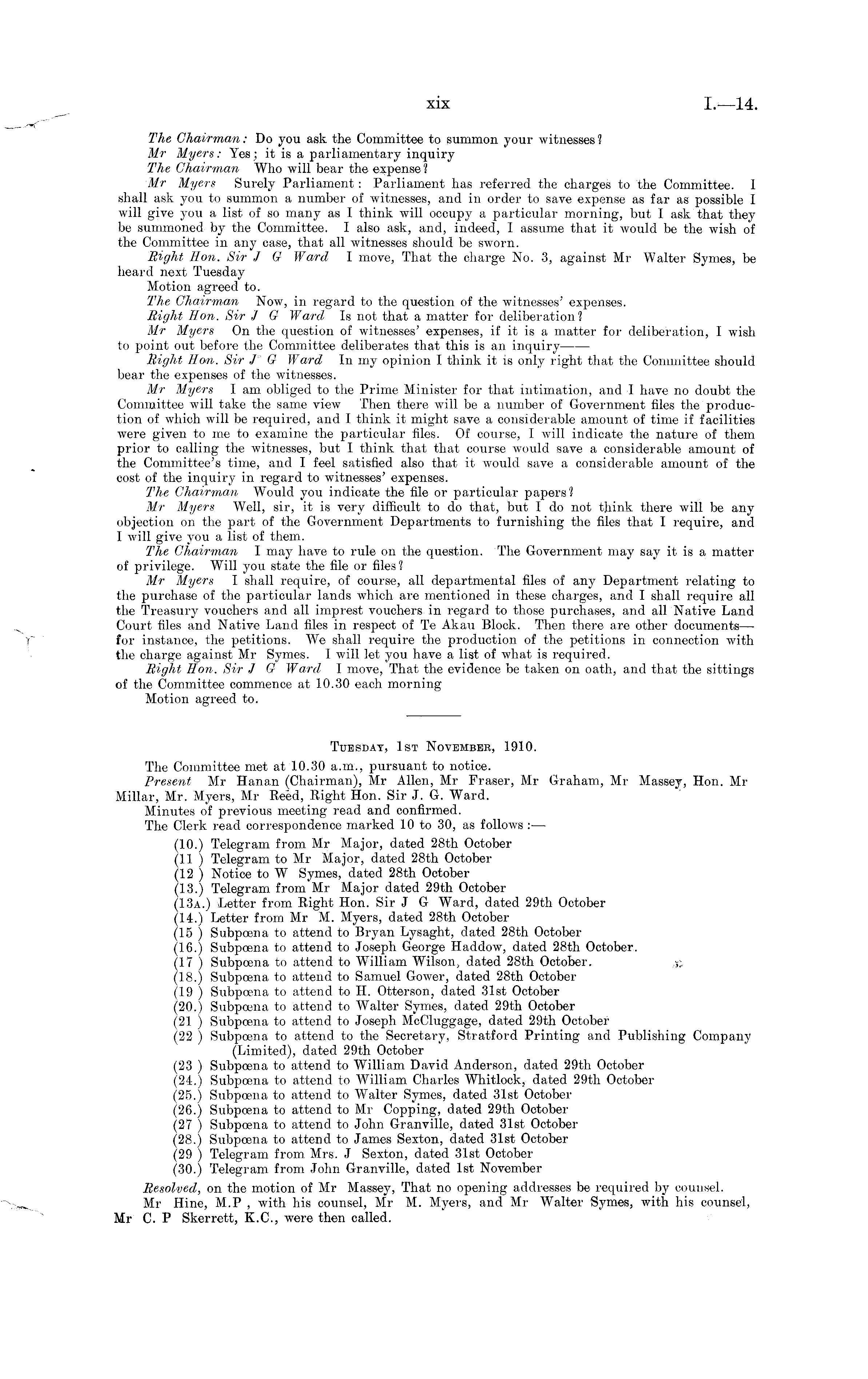 Tuesday, Ist November, 1910. The Committee met at 10.30 a.m., pursuant to notice. Present Mr Hanan (Chairman), Mr Allen, Mr Fraser, Mr Graham, Mr Massey, Hon. Mr Millar, Mr. Myers, Mr Reed, Right Hon. Sir J. G. Ward. Minutes of previous meeting read and confirmed. The Clerk read correspondence marked 10 to 30, as follows :— (10.) Telegram from Mr Major, dated 28th October (11 ) Telegram to Mr Major, dated 28th October (12 ) Notice to W Symes, dated 28th October (13.) Telegram from Mr Major dated 29th October (13a.) Letter from Right Hon. Sir J G Ward, dated 29th October (14.) Letter from Mr M. Myers, dated 28th October (15 ) Subpoena to attend to Bryan Lysaght, dated 28th October (16.) Subpoena to attend to Joseph George Haddow, dated 28th October. (17 ) Subpoena to attend to William Wilson, dated 28th October. (18.) Subpoena to attend to Samuel Gower, dated 28th October (19 ) Subpoena to attend to H. Otterson, dated 31st October (20.) Subpoena to attend to Walter Symes, dated 29th October (21 ) Subpoena to attend to Joseph McCluggage, dated 29th October (22 ) Subpoena to attend to the Secretar)', Stratford Printing and Publishing Company (Limited), dated 29th October (23 ) Subpoena to attend to William David Anderson, dated 29th October (24.) Subpoena to attend to William Charles Whitlock, dated 29th October (25.) Subpoena to attend to Walter Symes, dated 31st October (26.) Subpoena to attend to Mr Copping, dated 29th October (27 ) Subpoena to attend to John Granville, dated 31st October (28.) Subpoena to attend to James Sexton, dated 31st October (29 ) Telegram from Mrs. J Sexton, dated 31st October (30.) Telegram from John Granville, dated Ist November Resolved, on the motion of Mr Massey, That no opening addresses be required by counsel. Mr Hine, M.P , with his counsel, Mr M. Myers, and Mr Walter Symes, with his counsel, Mr C. P Skerrett, K.C., were then called.