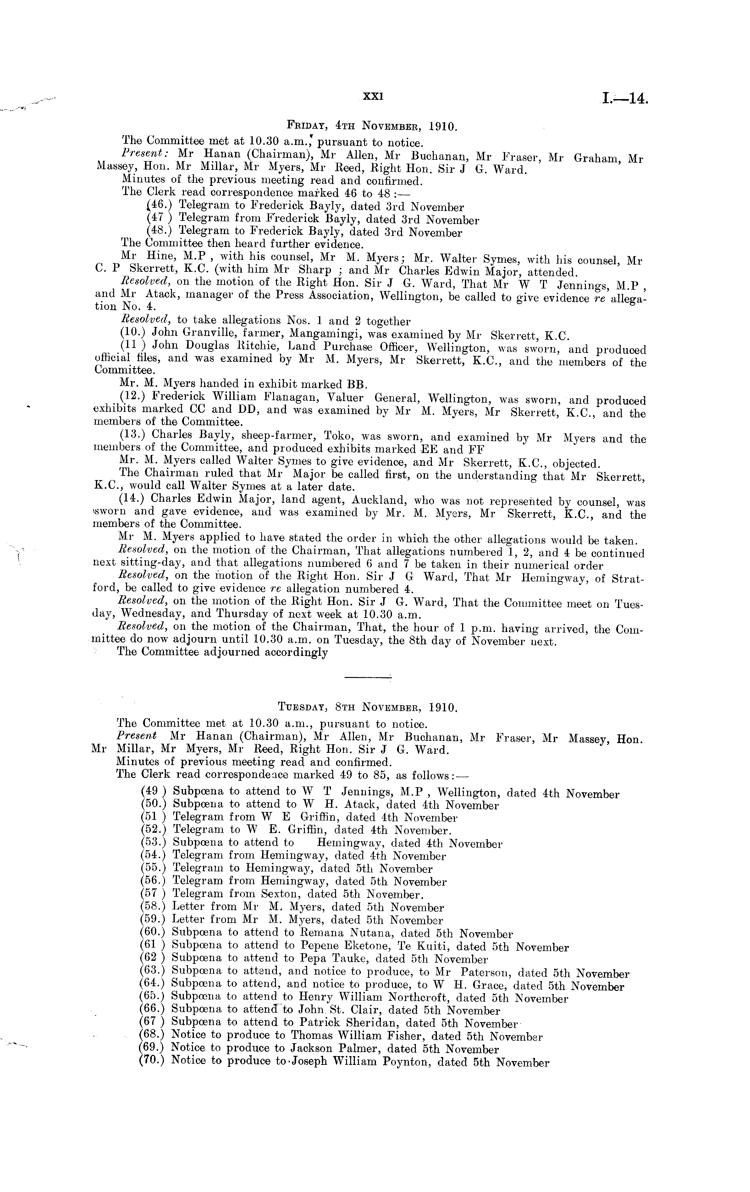 Tuesday, Bth November, 1910. The Committee met at 10.30 a.m., pursuant to notice. Present Mr Hanan (Chairman), Mr Allen, Mr Buchanan, Mr Fraser, Mr Massey Hon Mr Millar, Mr Myers, Mr Reed, Right Hon. Sir J G. Ward. Minutes of previous meeting read and confirmed. The Clerk read correspondeace marked 49 to 85, as follows: — (49 ) Subpoena to attend to W T Jennings, M.P , Wellington, dated 4th November (50.) Subpoena to attend to W H. Atack, dated 4th November (51 ) Telegram from W E Griffin, dated 4th November (52.) Telegram to W E. Griffin, dated 4th November. (53.) Subpoena to attend to Hemingway, dated 4th November (54.) Telegram from Hemingway, dated 4th November (55.) Telegram to Hemingway, dated sth November (56.) Telegram from Hemingway, dated sth November (57 ) Telegram from Sexton, dated sth November. (58.) Letter from Mr M. Myers, dated sth November (59.) Letter from Mr M. Myers, dated sth November (60.) Subpoena to attend to Remana Nutana, dated sth November (61 ) Subpoena to attend to Pepene Eketone, Te Kuiti, dated sth November (62 ) Subpoena to attend to Pepa Tauke, dated sth November (63.) Subpoena to attend, and notice to produce, to Mr Patersou, dated sth November (64.) Subpoena to attend, and notice to produce, to W H. Grace, dated sth November (65.) Subpoena to attend to Henry William Northcroft, dated sth November (66.) Subpoena to attend to John St. Clair, dated sth November (67 ) Subpoena to attend to Patrick Sheridan, dated sth November (68.) Notice to produce to Thomas William Fisher, dated sth November (69.) Notice to produce to Jackson Palmer, dated sth November (70.) Notice to produce to-Joseph William Poynton, dated sth November