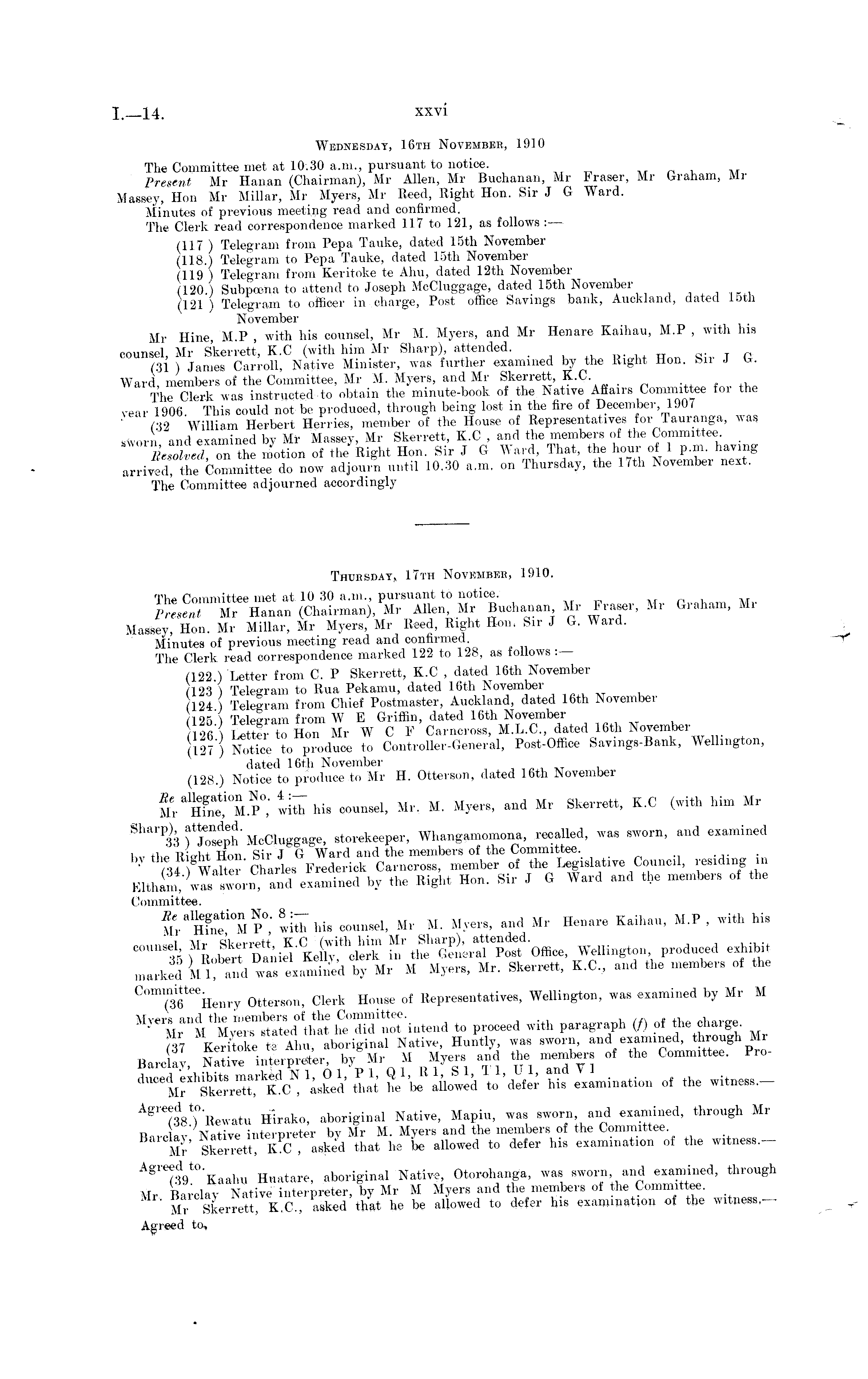 Wednesday, 16th November, 1910 The Committee met at 10.30 a.m., pursuant to notice. Present Mr Hanan (Chairman), Mr Allen, Mr Buchanan, Mr Fraser, Mr Graham, Mr Massey, Hon Mr Millar, Mr Myers, Mr Reed, Right Hon. Sir J G Ward. Minutes of previous meeting read and confirmed. The Clerk read correspondence marked 117 to 121, as follows : — (117 ) Telegram from Pepa Tauke, dated 15th November (118.) Telegram to Pepa Tauke, dated 15th November (119 ) Telegram from Keritoke te Ahu, dated 12th November (120.) Subpoena to attend to Joseph McCluggage, dated 15th November (121 ) Telegram to officer in charge, Post office Savings bank, Auckland, dated loth November Mr Hine, M.P , with his counsel, Mr M. Myers, and Mr Henare Kaihau, M.P , with his counsel, Mr Skerrett, X.C (with him Mr Sharp), attended. (31 ) James Carroll, Native Minister, was further examined by the Right Hon. hir J U. Ward members of the Committee, Mr M. Myers, and Mr Skerrett, K.C. ' The Clerk" was instructed to obtain the minute-book of the Native Affairs Committee for the year 1906 This could not be produced, through being lost in the fire of December 110 1 (32 'William Herbert Herries, member of the House of Representatives for Tauranga, was sworn and examined by Mr Massey, Mr Skerrett, X.C , and the members of the Committee Besolved on the notion of the Right Hon. Sir J G Ward, That, the hour of 1 p.m. having arrived, tieComiSttee do now adjourn until 10.30 a.m. on Thursday, the 17th November next. The Committee adjourned accordingly