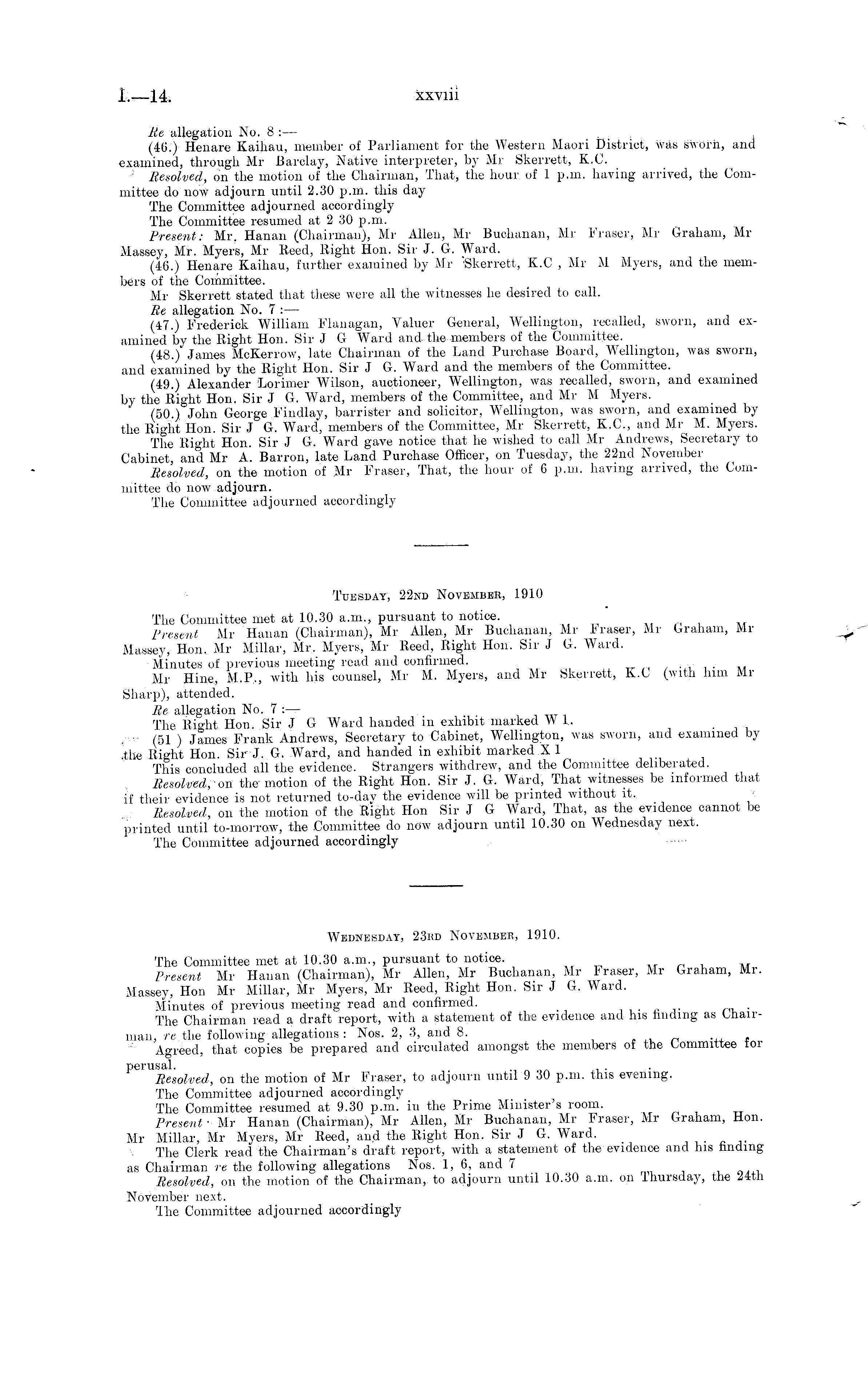 Re allegation No. 8 : — . (46.) Henare Kaihau, member of Parliament for the Western Maori District, was sworn, and examined, through Mr Barclay, Native interpreter, by Mr Skerrett, X.C Resolved, on the motion of the Chairman, That, the hour of 1 p.m. having arrived, the Committee do now adjourn until 2.30 p.m. this day The Committee adjourned accordingly The Committee resumed at 2 30 p.m. Present: Mr. Hanan (Chairman), Mr Allen, Mr Buchanan, Mr Fraser, Mr Graham, Mr Massey, Mr. Myers, Mr Reed, Right Hon. Sir J. G. Ward. (46.) Henare Kaihau, further examined by Mr Skerrett, X.C , Mr M Myers, and the members of the Committee. Mr Skerrett stated that these were all the witnesses he desired to call. Re allegation No. 7 : — (47.) Frederick William Flanagan, Valuer General, Wellington, recalled, sworn, and examined by the Right Hon. Sir J G Ward and the members of the Committee. (48.) James McKerrow, late Chairman of the Land Purchase Board, Wellington, was sworn, and examined by the Right Hon. Sir J G. Ward and the members of the Committee. (49.) Alexander 'Lorimer Wilson, auctioneer, Wellington, was recalled, sworn, and examined by the Right Hon. Sir J G. Ward, members of the Committee, and Mr M Myers. (50.) John George Findlay, barrister and solicitor, Wellington, was sworn, and examined by the Right Hon. Sir J G. Ward, members of the Committee, Mr Skerrett, X.C, and Mr M. Myers. The Right Hon. Sir J G. Ward gave notice that he wished to call Mr Andrews, Secretary to Cabinet, and Mr A. Barron, late Land Purchase Officer, on Tuesday, the 22nd November Resolved, on the motion of Mr Fraser, That, the hour of 6 p.m. having arrived, the Committee do now adjourn. The Committee adjourned accordingly