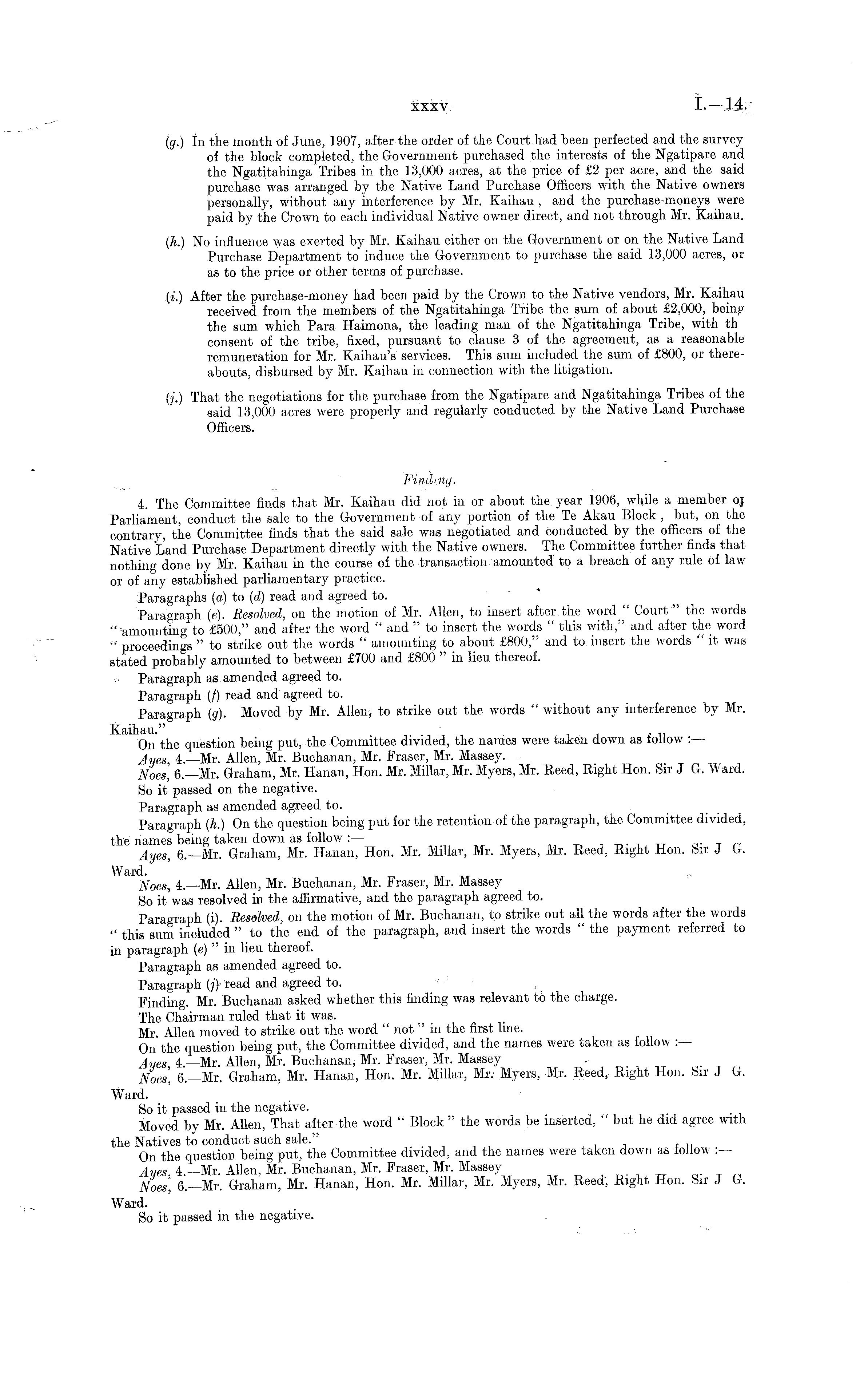 (g.) In the month of June, 1907, after the order of the Court had been perfected and the survey of the block completed, the Government purchased the interests of the Ngatipare and the Ngatitahinga Tribes in the 13,000 acres, at the price of £2 per acre, and the said purchase was arranged by the Native Land Purchase Officers with the Native owners personally, without any interference by Mr. Kaihau , and the purchase-moneys were paid by the Crown to each individual Native owner direct, and not through Mr. Kaihau. (h.) No influence was exerted by Mr. Kaihau either on the Government or on the Native Land Purchase Department to induce the Government to purchase the said 13,000 acres, or as to the price or other terms of purchase. (*.) After the purchase-money had been paid by the Crown to the Native vendors, Mr. Kaihau received from the members of the Ngatitahinga Tribe the sum of about £2,000 ; being the sum which Para Haimona, the leading man of the Ngatitahinga Tribe, with th consent of the tribe, fixed, pursuant to clause 3 of the agreement, as a reasonable remuneration for Mr. Kaihau's services. This sum included the sum of £800, or thereabouts, disbursed by Mr. Kaihau in connection with the litigation. (j.) That the negotiations for the purchase from the Ngatipare and Ngatitahinga Tribes of the said 13,000 acres were properly and regularly conducted by the Native Land Purchase Officers. Finding. 4. The Committee finds that Mr. Kaihau did not in or about the year 1906, while a member oj Parliament, conduct the sale to the Government of any portion of the Te Akau Block , but, on the contrary, the Committee finds that the said sale was negotiated and conducted by the officers of the Native Land Purchase Department directly with the Native owners. The Committee further finds that nothing done by Mr. Kaihau in the course of the transaction amounted to a breach of any rule of law or of any established parliamentary practice. Paragraphs (a) to (d) read and agreed to. Paragraph (c). Resolved, on the motion of Mr. Allen, to insert after the word " Court " the words "amounting to £500," and after the word " and " to insert the words " this with," and after the word " proceedings " to strike out the words " amounting to about £800," and to insert the words " it was stated probably amounted to between £700 and £800 " in lieu thereof. ■-■• Paragraph as amended agreed to. Paragraph (/) read and agreed to. Paragraph (g). Moved by Mr. Allen, to strike out the words " without any interference by Mr. Kaihau." On the question being put, the Committee divided, the names were taken down as tollow :— Ayes 4.—Mr. Allen, Mr. Buchanan, Mr. Fraser, Mr. Massey. N oeSi 6.—Mr. Graham, Mr. Hanan, Hon. Mr. Millar, Mr. Myers, Mr. Reed, Right Hon. Sir JG. Ward. So it passed on the negative. Paragraph as amended agreed to. Paragraph (/*.) On the question being put for the retention of the paragraph, the Committee divided, the names being taken down as follow :— Ayes, 6.—Mr. Graham, Mr. Hanan, Hon. Mr. Millar, Mr. Myers, Mr. Reed, Right Hon. Sir JG. Ward. Noes, 4.—Mr. Allen, Mr. Buchanan, Mr. Fraser, Mr. Massey So it'was resolved in the affirmative, and the paragraph agreed to. Paragraph (i). Resolved, on the motion of Mr. Buchanan, to strike out all the words after the words " this sum included " to the end of the paragraph, and insert the words " the payment referred to in paragraph (c) " in lieu thereof. Paragraph as amended agreed to. Paragraph (?) read and agreed to. Finding. Mr. Buchanan asked whether this finding was relevant to the charge. The Chairman ruled that it was. Mr. Allen moved to strike out the word " not " in the first line. On the question being put, the Committee divided, and the names were taken as follow :— Ayes 4 —Mr. Allen, Mr. Buchanan, Mr. Fraser, Mr. Massey floes] 6.—Mr. Graham, Mr. Hanan, Hon. Mr. Millar, Mr. Myers, Mr. Reed, Right Hon. Sir JG. Ward. So it passed in the negative. Moved by Mr. Allen, That after the word " Block " the words be inserted, " but he did agree with the Natives to conduct such sale." ..-,,,, , i j tv On the question being put, the Committee divided, and the names were taken down as follow :— A Y es 4—Mr Allen, Mr. Buchanan, Mr. Fraser, Mr. Massey Noes, 6 —Mr. Graham, Mr. Hanan, Hon. Mr. Millar, Mr. Myers, Mr. Reed, Right Hon. Sir JG. Ward. So it passed in the negative.