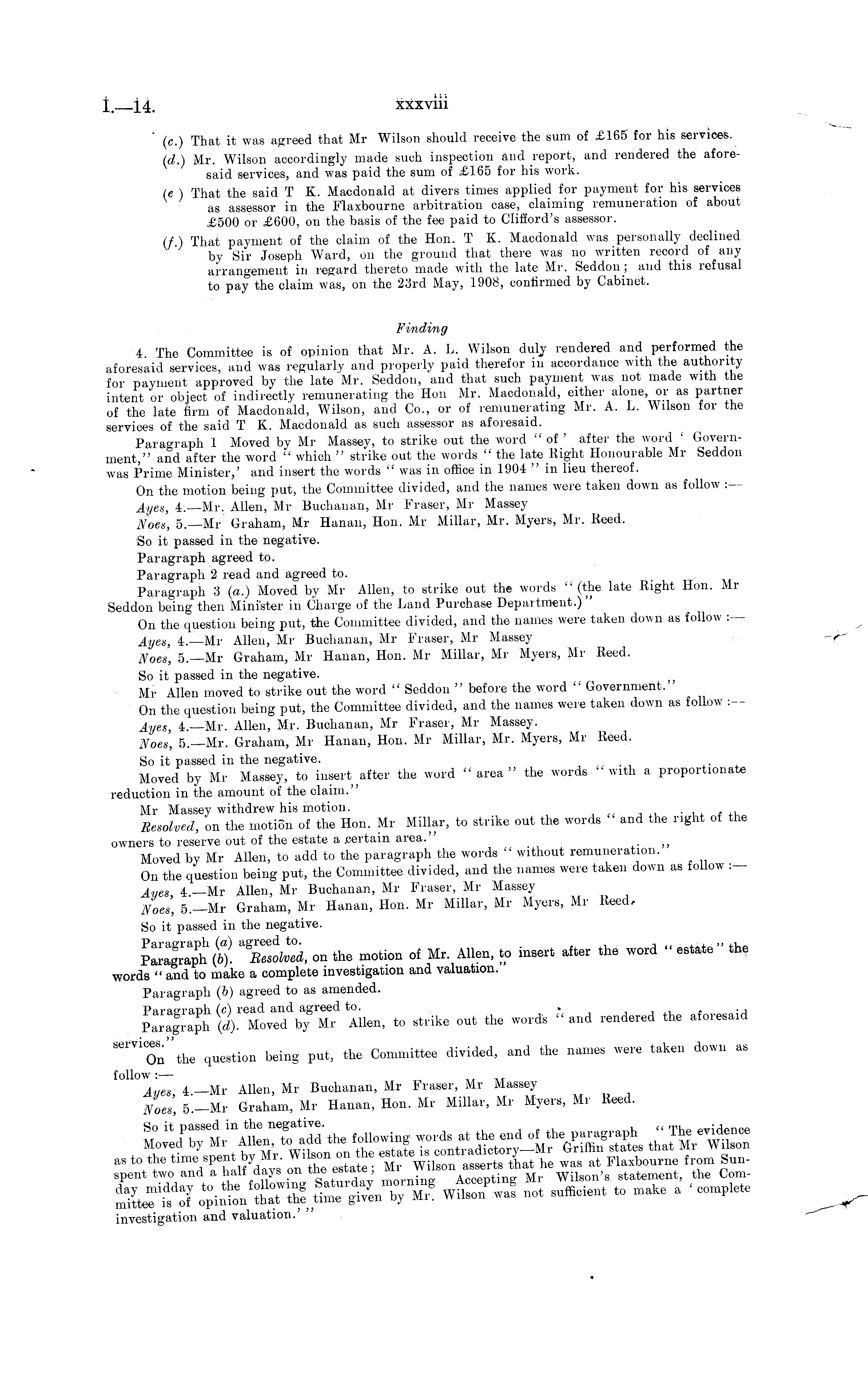 ' (c.) That it was agreed that Mr Wilson should receive the sum of £165 for his services. (d.) Mr. Wilson accordingly made such inspection and report, and rendered the aforesaid services, and was paid the sum of £165 for his work. te ) That the said T K. Macdonald at divers times applied for payment for his services as assessor in the Flaxbourne arbitration case, claiming remuneration of about £500 or £600, on the basis of the fee paid to Clifford's assessor. (/.) That payment of the claim of the Hon. T K. Macdonald was personally declined by Sir Joseph Ward, on the ground that there was no written record of any arrangement in regard thereto made with the late Mr. Seddon; and this refusal to pay the claim was, on the 23rd May, 1908, confirmed by Cabinet. Finding 4 The Committee is of opinion that Mr. A. L. Wilson duly rendered and performed the aforesaid services, and was regularly and properly paid therefor in accordance with the authority for payment approved by the late Mr. Seddon, and that such payment was not made with the intent or object of indirectly remunerating the Hon Mr. Macdonald, either alone, or as partner of the late firm of Macdonald, Wilson, and Co., or of remunerating Mr. A. L. Wilson for the services of the said T K. Macdonald as such assessor as aforesaid. Paragraph 1 Moved by Mr Massey, to strike out the word "of after the word ' Government," and after the word " which " strike out the words " the late Right Honourable Mr Seddon was Prime Minister,' and insert the words " was in office in 1904 " in lieu thereof. On the motion being put, the Committee divided, and the names were taken down as follow :— Ayes, 4.—Mr. Allen, Mr Buchanan, Mr Fraser, Mr Massey Noes, s.—Mr' Graham, Mr Hanan, Hon. Mr Millar, Mr. Myers, Mr. Reed. So it passed in the negative. Paragraph agreed to. Paragraph 2 read and agreed to. Paragraph 3 (a.) Moved by Mr Allen, to strike out the words "(the late Right Hon. Mr Seddon being then Minister in Charge of the Land Purchase Department.)" On the question being put, the Committee divided, and the names were taken down as follow :— Ayes, 4. —Mr Allen, Mr Buchanan, Mr Fraser, Mr Massey Noes, s.—Mr Graham, Mr Hanan, Hon. Mr Millar, Mr Myers, Mr Reed. So it passed in the negative. Mr Allen moved to strike out the word " Seddon " before the word " Government. On the question being put, the Committee divided, and the names were taken down as follow :— Ayes, 4.—Mr. Allen, Mr. Buchanan, Mr Fraser, Mr Massey. Noes, s.—Mr. Graham, Mr Hanan, Hon. Mr Millar, Mr. Myers, Mr Reed. So it passed in the negative. Moved by Mr Massey, to insert after the word "area" the words "with a proportionate reduction in the amount of the claim." Mr Massey withdrew his motion. . Resolved, on the motion of the Hon. Mr Millar, to strike out the words and the right of the owners to reserve out of the estate a .certain area. Moved by Mr Allen, to add to the paragraph the words " without remuneration. On the question being put, the Committee divided, and the names were taken down as follow :- A Y es 4 —Mr Allen, Mr Buchanan, Mr Fraser, Mr Massey Noes', s.—Mr Graham, Mr Hanan, Hon. Mr Millar, Mr Myers, Mr Reed, So it passed in the negative. IZTS S on the motion of Mr. Allen, to insert after the word « estate » the words " and to make a complete investigation and valuation. Paragraph (6) agreed to as amended. Paragraph (c) read and agreed to. Paragi-aph (j). Moved by Mr Allen, to strike out the words "and rendered the aforesaid SerVi On"the question being put, the Committee divided, and the names were taken down as follow: — Ayes 4 —Mr Allen, Mr Buchanan, Mr Fraser, Mr Massey Noes', 5.-Mr Graham, Mr Hanan, Hon. Mr Millar, Mr Myers, Mr Reed. So it passed in the negative. u_, • j ~„« investigation and valuation.