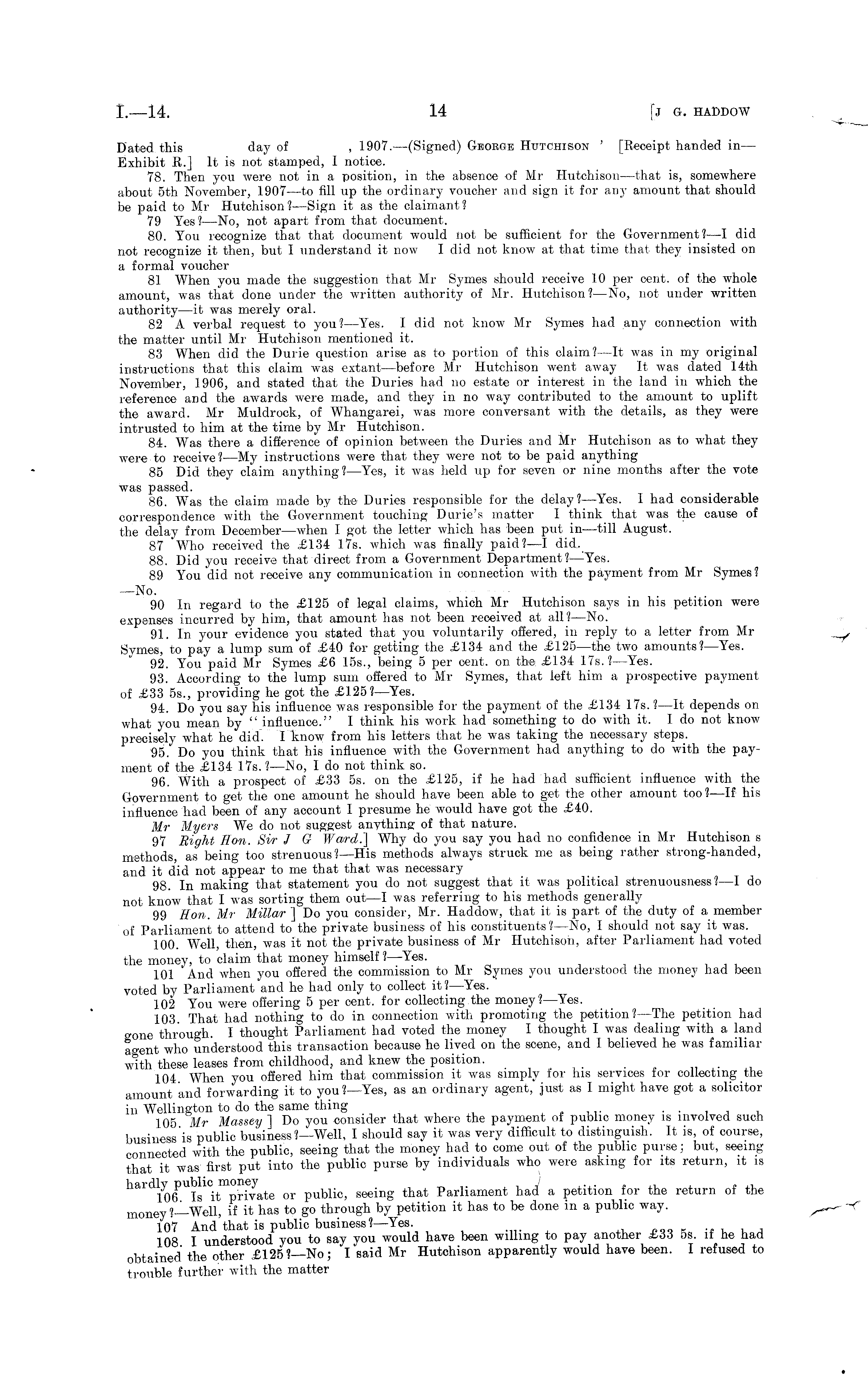 Dated this day of , 1907.—(Signed) George Hutchison ' [Receipt handed in— Exhibit R.] It is not stamped, I notice. 78. Then you were not in a position, in the absence of Mr Hutchison—that is, somewhere about sth November, 1907—t0 fill up the ordinary voucher and sign it for any amount that should be paid to Mr Hutchison? —Sign it as the claimant? 79 Yes?—No, not apart from that document. 80. You recognize that that document would not be sufficient for the Government? —I did not recognize it then, but I understand it now I did not know at that time that they insisted on a formal voucher 81 When you made the suggestion that Mr Symes should receive 10 per cent, of the whole amount, was that done under the written authority of Mr. Hutchison? —No, not under written authority—it was merely oral. 82 A verbal request to you?— Yes. I did not know Mr Symes had any connection with the matter until Mr Hutchison mentioned it. 83 When did the Durie question arise as to portion of this claim? —It was in my original instructions that this claim was extant —before Mr Hutchison went away It was dated 14th November, 1906, and stated that the Duties had no estate or interest in the land in which the reference and the awards were made, and they in no way contributed to the amount to uplift the award. Mr Muldrock, of Whangarei, was more conversant with the details, as they were intrusted to him at the time by Mr Hutchison. 84. Was there a difference of opinion between the Duries and Mr Hutchison as to what they were to receive? —My instructions were that they were not to be paid anything 85 Did they claim anything? —Yes, it was held up for seven or nine months after the vote was passed. 86. Was the claim made by the Duries responsible for the delay?— Yes. 1 had considerable correspondence with the Government touching Durie's matter I think that was the cause of the delay from December —when I got the letter which has been put in—till August, 87 "Who received the £134 17s. which was finally paid?—l did, 88. Did you receive that direct from a Government Department ?—Yes. 89 You did not receive any communication in connection with the payment from Mr Symes? —No. 90 In regard to the £125 of legal claims, which Mr Hutchison says in his petition were expenses incurred by him, that amount has not been received at all?— No. 91. In your evidence you stated that you voluntarily offered, in reply to a letter from Mr Symes, to pay a lump sum of £40 for getting the £134 and the £125—the two amounts?— Yes. 92. You paid Mr Symes £6 155., being 5 per cent, on the £134 17s.? —Yes. 93. According to the lump sum offered to Mr Symes, that left him a prospective payment of £33 55., providing he got the £125?— Yes. 94. Do you say his influence was responsible for the payment of the £134 17s. ?—lt depends on what you mean by " influence." I think his work had something to do with it. Ido not know precisely what he did. 1 know from his letters that he was taking the necessary steps. 95. Do you think that his influence with the Government had anything to do with the payment of the £134 17s. ? —No, I do not think so. 96. With a prospect of £33 ss. on the £125, if he had had sufficient influence with the Government to get the one amount he should have been able to get the other amount too I —lf his influence had been of any account I presume he would have got the £40. Mr Myers We do not suggest anything of that nature. 97 Right Hon. Sir J G Ward.] Why do you say you had no confidence in Mr Hutchison s methods, as being too strenuous? —His methods always struck me as being rather strong-handed, and it did not appear to me that that was necessary 98. In making that statement you do not suggest that it was political strenuousness ?—I do not know that I was sorting them out—l was referring to his methods generally 99 Hon. Mr Millar ] Do you consider, Mr. Haddow, that it is part of the duty of a member of Parliament to attend to the private business of his constituents ?—No, I should not say it was. 100. Well then, was it not the private business of Mr Hutchison, after Parliament had voted the money, to claim that money himself ?—Yes. 101 And when you offered the commission to Mr Symes you understood the money had been voted by Parliament and he had only to collect it? —Yes. 102 You were offering 5 per cent, for collecting the money?— Yes. 103. That had nothing to do in connection with promoting the petition? —The petition had gone through. I thought Parliament had voted the money I thought I was dealing with a land agent who understood this transaction because he lived on the scene, and I believed he was familiar with these leases from childhood, and knew the position. 104 When you offered him that commission it was simply for his services for collecting the amount and forwarding it to you?— Yes, as an ordinary agent, just as I might have got a solicitor in Wellington to do the same thing 105 Mr Massey ] Do you consider that where the payment of public money is involved such business is public business?— Well, I should say it was very difficult to distinguish. It is, of course, connected with the public, seeing that the money had to come out of the public purse; but, seeing that it was first put into the public purse by individuals who were asking for its return, it is ial " ioe^ls 1 it private or public, seeing that Parliament had a petition for the return of the money?— Well, if it has to go through by petition it has to be done in a public way. 107 And that is public business?— Yes. 108 I understood you to say you would have been willing to pay another £63 ss. it he had obtained the other £125?—N0; I said Mr Hutchison apparently would have been. I refused to trouble further with the matter