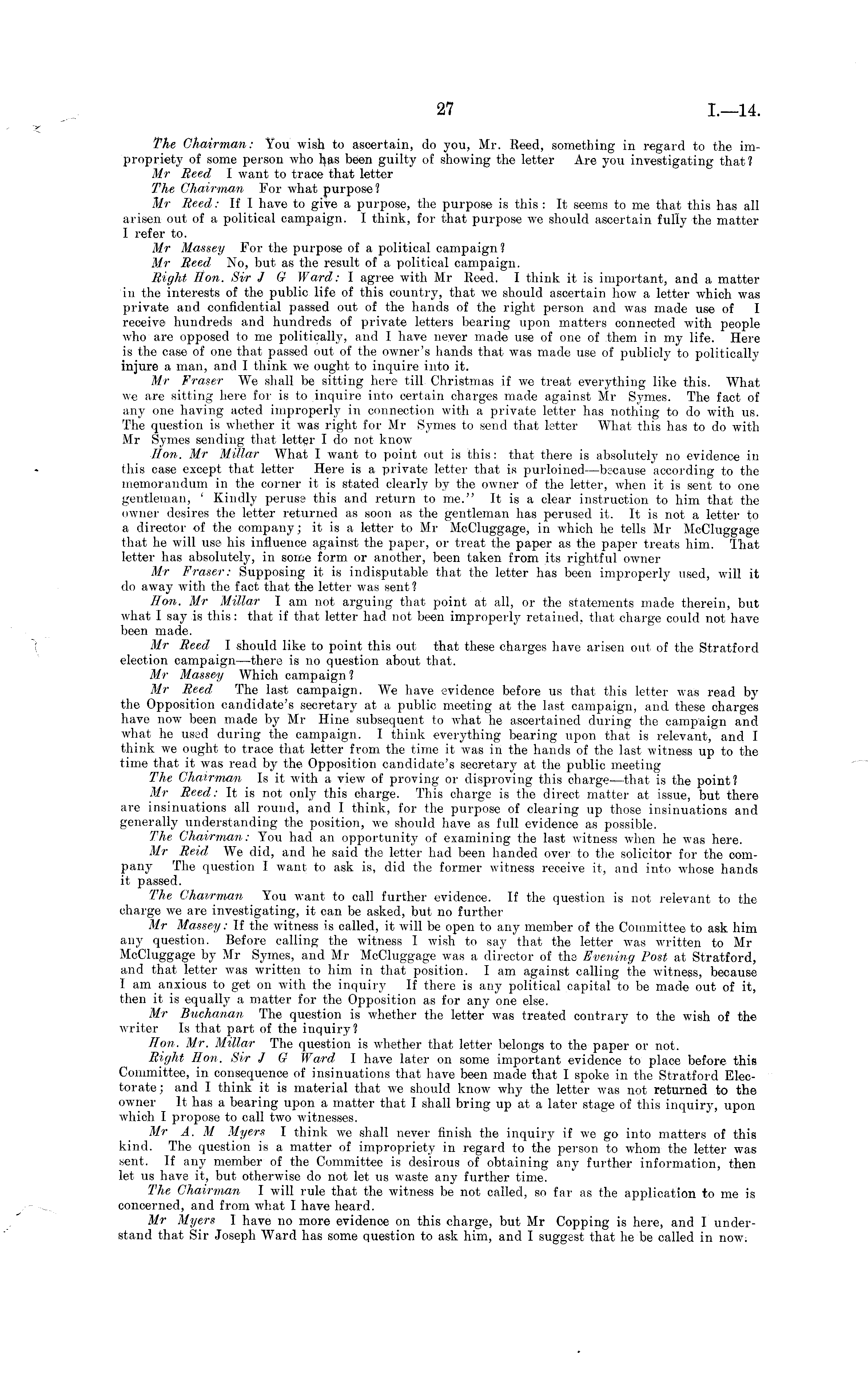 'The Chairman: You wish to ascertain, do you, Mr. Reed, something in regard to the impropriety of some person who has been guilty of showing the letter Are you investigating that? Mr Reed I want to trace that letter The Chair-man For what purpose? Mr Reed,: If I have to give a purpose, the purpose is this :It seems to me that this has all arisen out of a political campaign. I think, for that purpose we should ascertain fully the matter I refer to. Mr Massey For the purpose of a political campaign ? Mr Seed No, but as the result of a political campaign. Bight Hon. Sir J G Ward: I agree with Mr Reed. I think it is important, and a matter in the interests of the public life of this country, that we should ascertain how a letter which was private and confidential passed out of the hands of the right person and was made use of I receive hundreds and hundreds of private letters bearing upon matters connected with people who are opposed to me politically, and I have never made use of one of them in my life. Here is the case of one that passed out of the owner's hands that was made use of publicly to politically injure a man, and I think we ought to inquire into it. Mr Fraser We shall be sitting here till Christmas if we treat everything like this. What we are sitting here for is to inquire into certain charges made against Mr Symes. The fact of any one having acted improperly in connection with a private letter has nothing to do with us. The question is whether it was right for Mr Symes to send that letter What this has to do with Mr Symes sending that letter I do not know Hon. Mr Millar What I want to point out is this : that there is absolutely no evidence in this case except that letter Here is a private letter that is purloined—because according to the memorandum in the corner it is stated clearly by the owner of the letter, when it is sent to one gentleman, ' Kindly peruse this and return to me." It is a clear instruction to him that the owner desires the letter returned as soon as the gentleman has perused it. It is not a letter to a director of the company; it is a letter to Mr McCluggage, in which he tells Mr McCluggage that he will use his influence against the paper, or treat the paper as the paper treats him. That letter has absolutely, in some form or another, been taken from its rightful owner Mr Fraser: Supposing it is indisputable that the letter has been improperly used, w-ill it do away with the fact that the letter was sent ? Hon. Mr Millar I am not arguing that point at all, or the statements made therein, but what I say is this: that if that letter had not been improperly retained, that charge could not have been made. Mr Beed I should like to point this out that these charges have arisen out of the Stratford election campaign—there is no question about that. Mr Massey Which campaign ? Mr Reed The last campaign. We have evidence before us that this letter was read by the Opposition candidate's secretary at a public meeting at the last campaign, and these charges have now been made by Mr Hine subsequent to what he ascertained during the campaign and what he used during the campaign. I think everything bearing upon that is relevant, and I think we ought to trace that letter from the time it was in the hands of the last witness up to the time that it was read by the Opposition candidate's secretary at the public meeting The Chairman Is it with a view of proving or disproving this charge—that is the point? Mr Beed: It is not only this charge. This charge is the direct matter at issue, but there are insinuations all round, and I think, for the purpose of clearing up those insinuations and generally understanding the position, we should have as full evidence as possible. The Chairman: You had an opportunity of examining the last witness when he was here. Mr Reid We did, and he said the letter had been handed over to the solicitor for the company The question I want to ask is, did the former witness receive it, and into whose hands it passed. The Chairman You want to call further evidence. If the question is not relevant to the charge we are investigating, it can be asked, but no further Mr Massey: If the witness is called, it will be open to any member of the Committee to ask him any question. Before calling the witness I wish to say that the letter was written to Mr McCluggage by Mr Symes, and Mr McCluggage was a director of the Evening Post at Stratford, and that letter was written to him in that position. I am against calling the witness, because I am. anxious to get on with the inquiry If there is any political capital to be made out of it, then it is equally a matter for the Opposition as for any one else. Mr Buchanan The question is whether the letter was treated contrary to the wish of the writer Is that part of the inquiry? Hon. Mr. Millar The question is whether that letter belongs to the paper or not. Bight Hon. Sir J G Ward I have later on some important evidence to place before this Committee, in consequence of insinuations that have been made that I spoke in the Stratford Electorate; and I think it is material that we should know why the letter was not returned to the owner It has a bearing upon a matter that I shall bring up at a later stage of this inquiry, upon which I propose to call two witnesses. Mr A. M Myers I think we shall never finish the inquiry if we go into matters of this kind. The question is a matter of impropriety in regard to the person to whom the letter was sent. If any member of the Committee is desirous of obtaining any further information, then let us have it, but otherwise do not let us waste any further time. The Chairman I will rule that the witness be not called, so far as the application to me is concerned, and from what I have heard. Mr Myers I have no more evidence on this charge, but Mr Copping is here, and I understand that Sir Joseph Ward has some question to ask him, and I suggest that he be called in now.